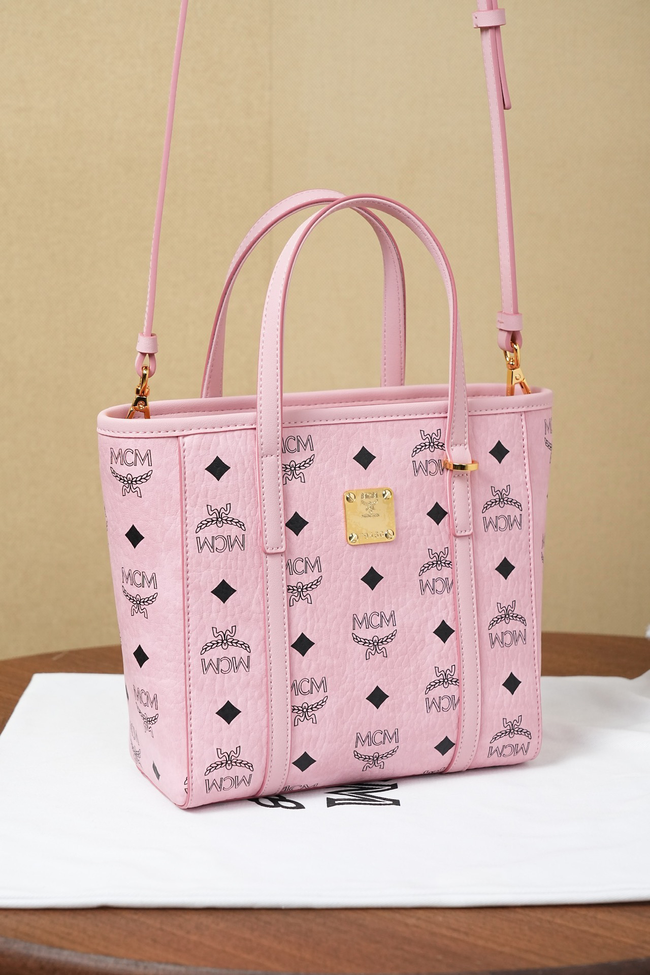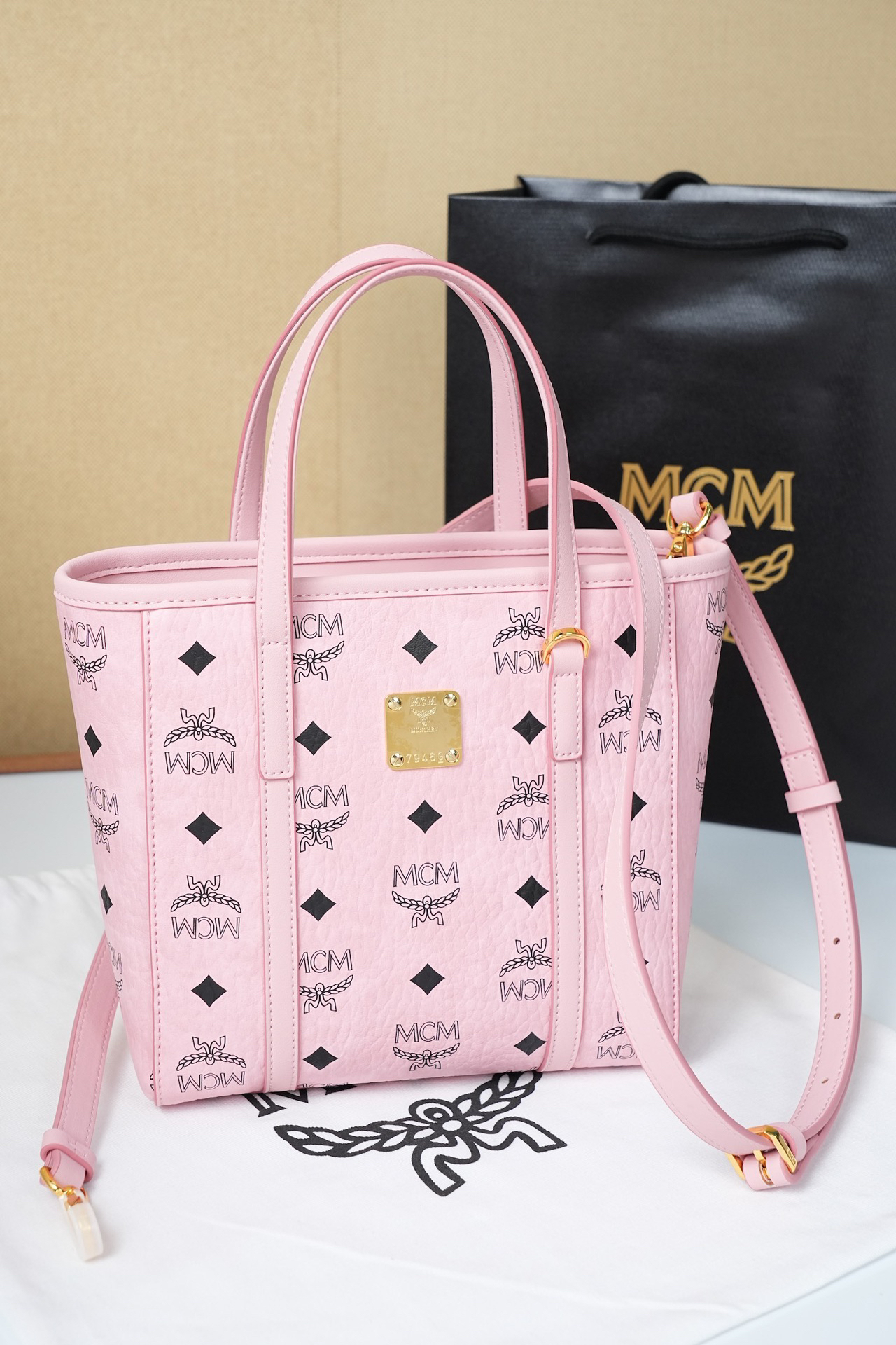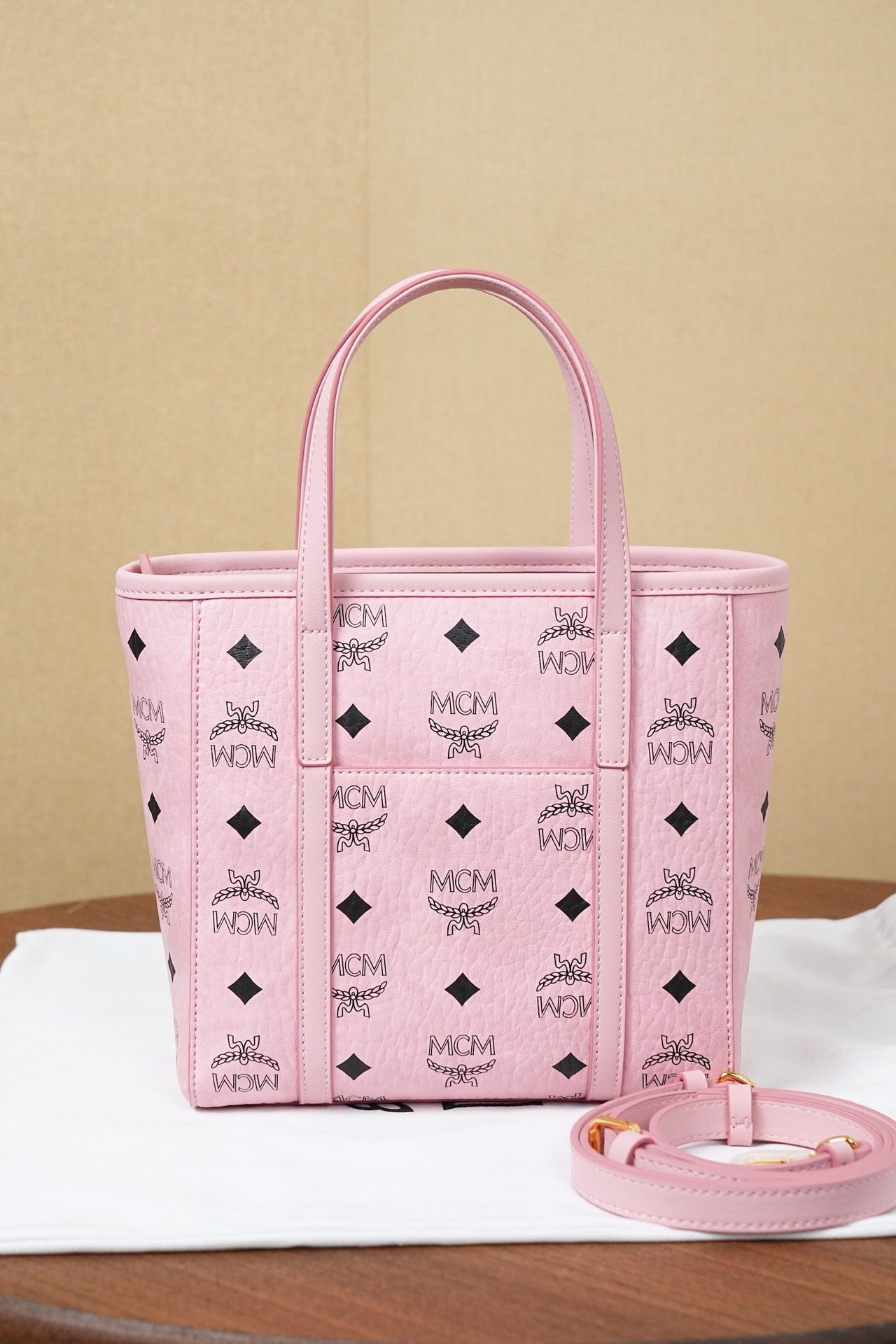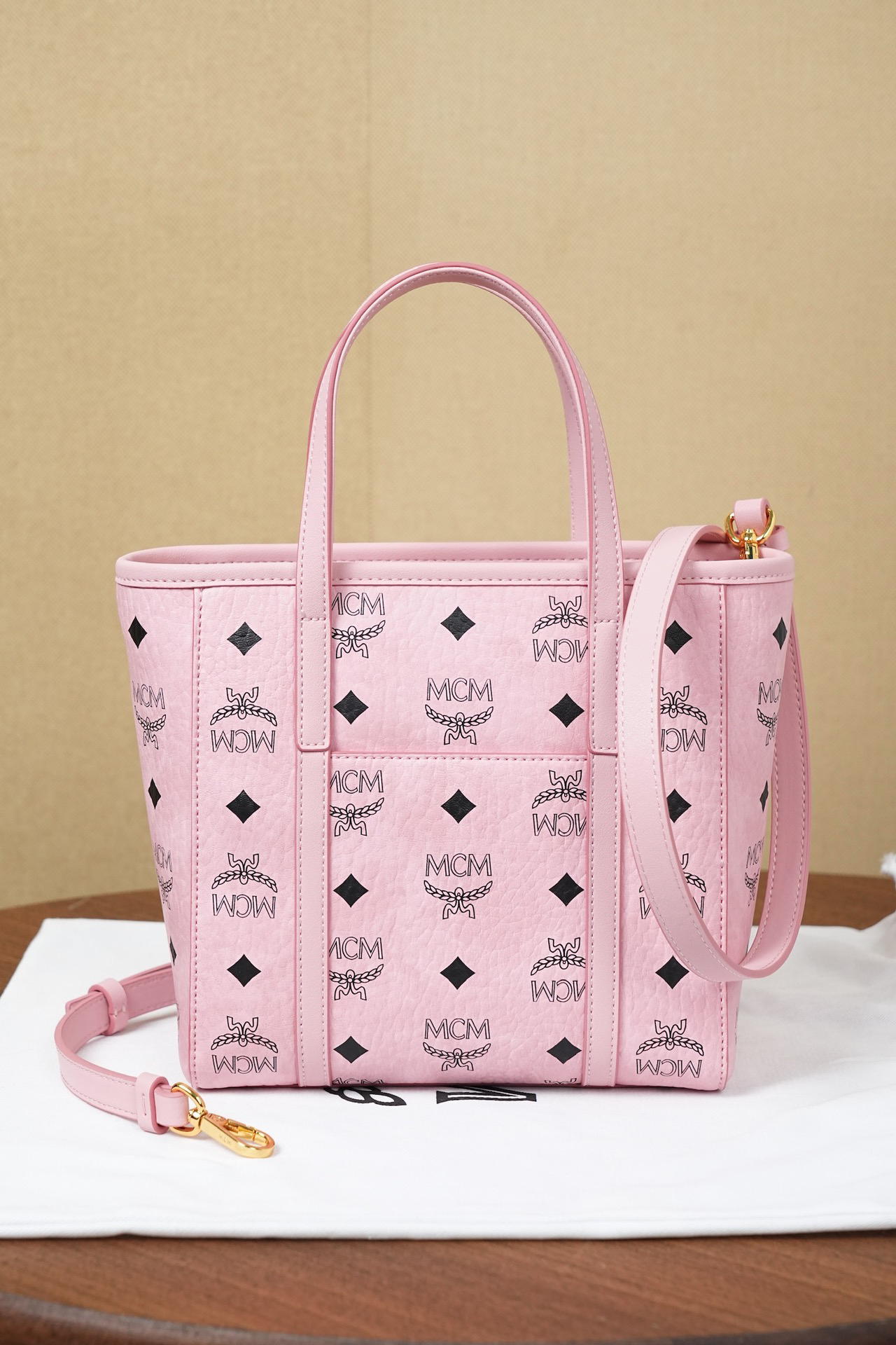 秋冬特惠💰760 原单MCM 原厂皮 桃花粉购物袋菜篮子MWPFSMT06PZ 桃花粉老花满印