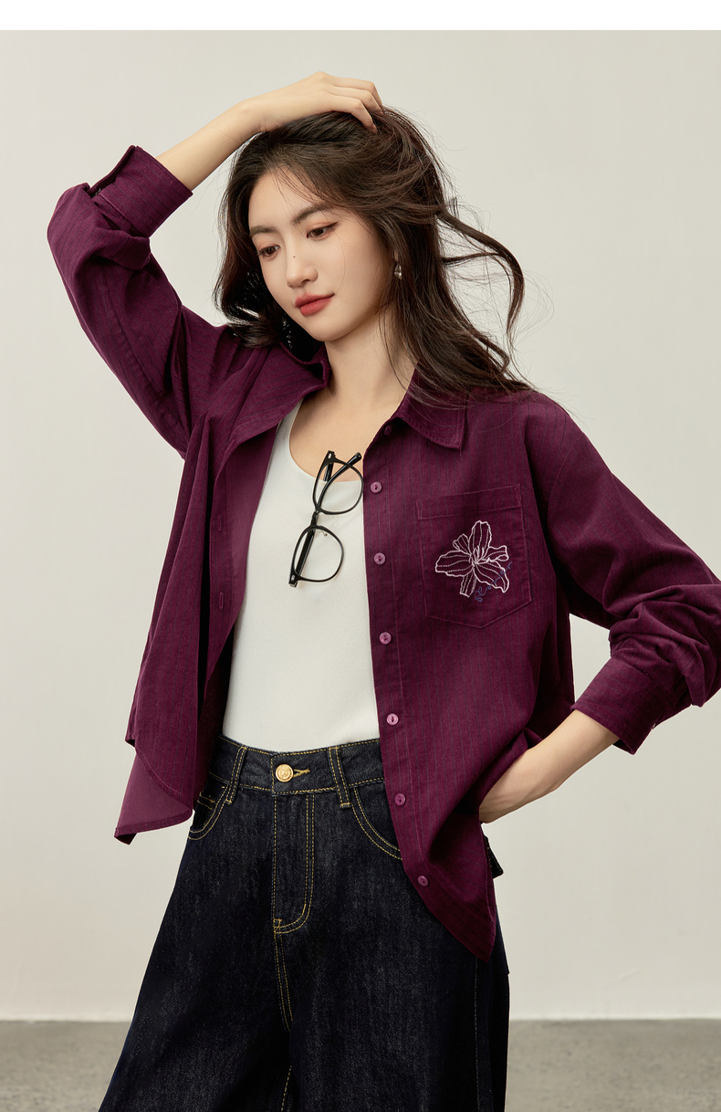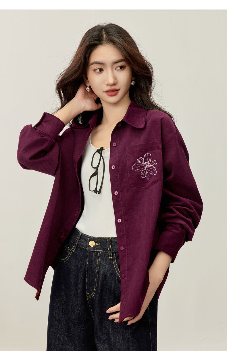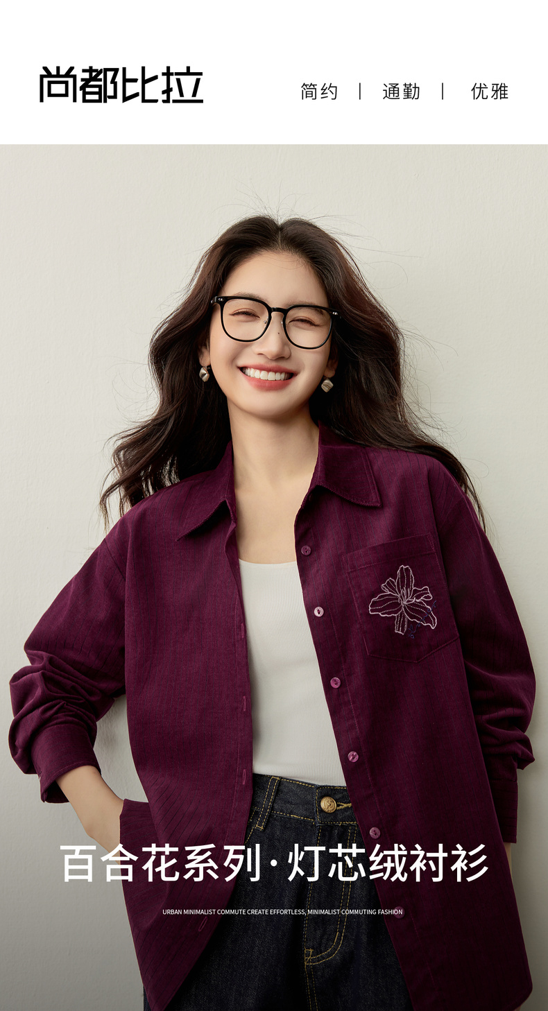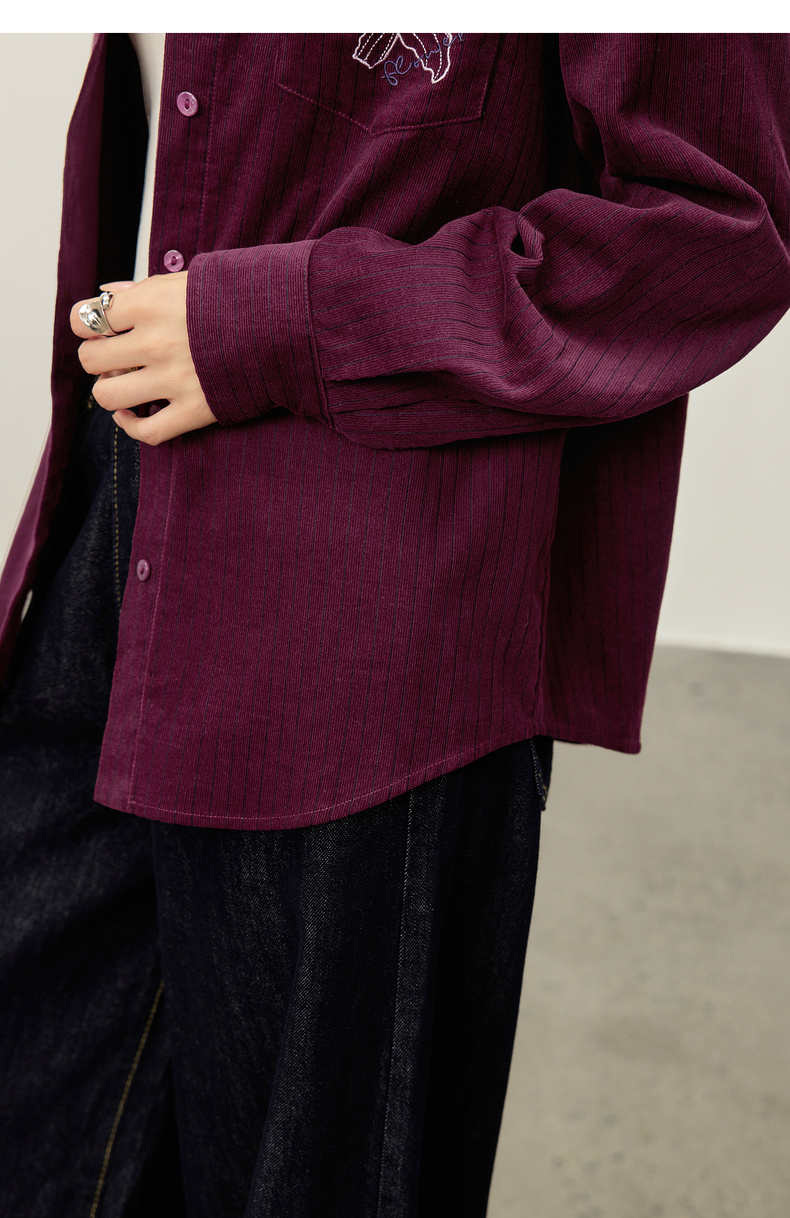 【内购】【百合花】100%棉简约通勤翻领撞色刺绣暗条纹灯芯绒长袖宽松衬衫-153C80507
