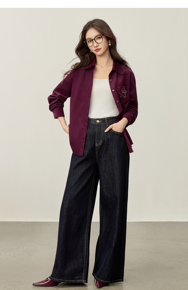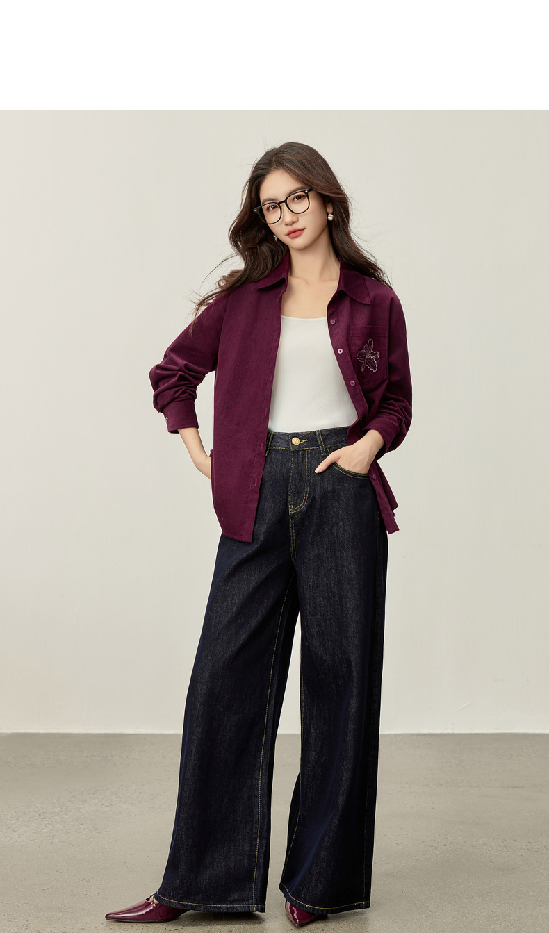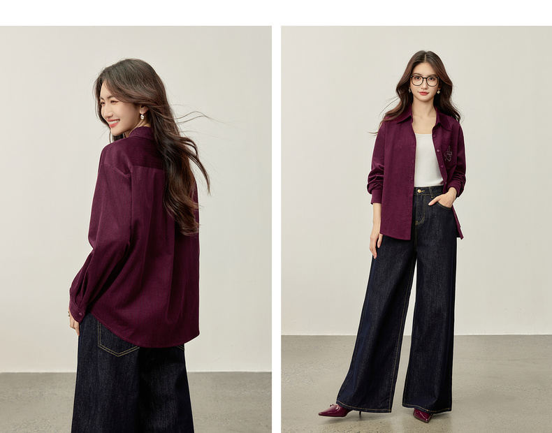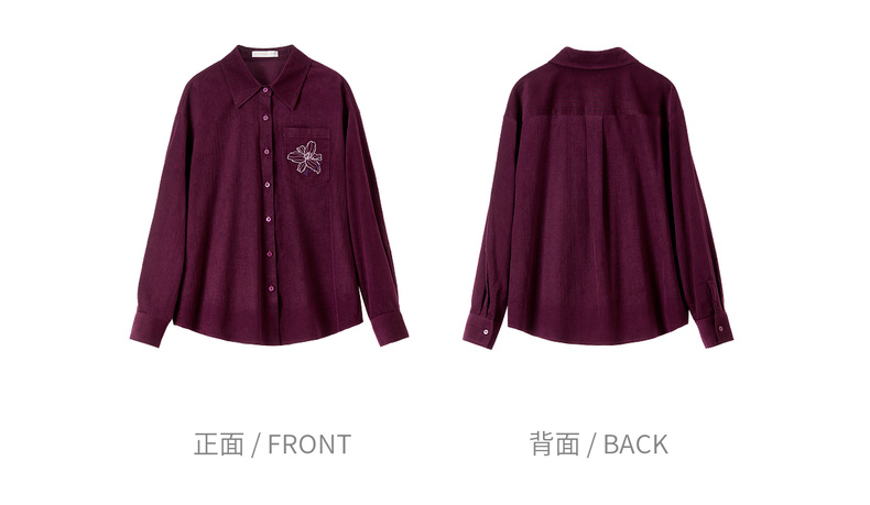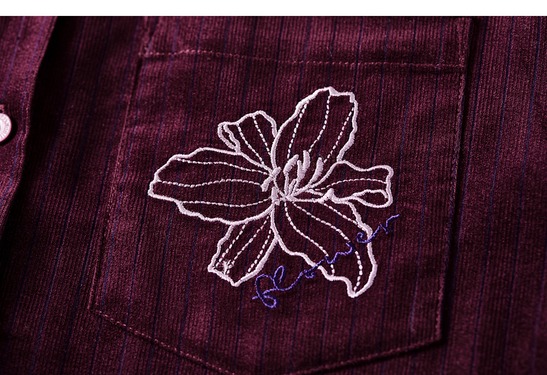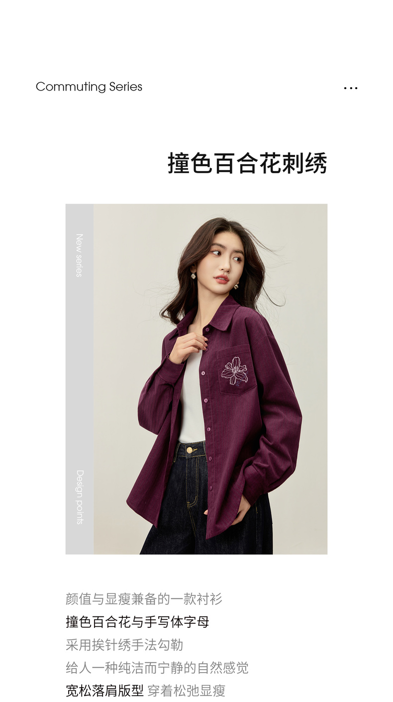 【内购】【百合花】100%棉简约通勤翻领撞色刺绣暗条纹灯芯绒长袖宽松衬衫-153C80507