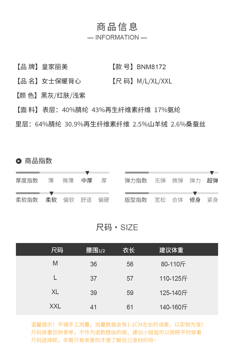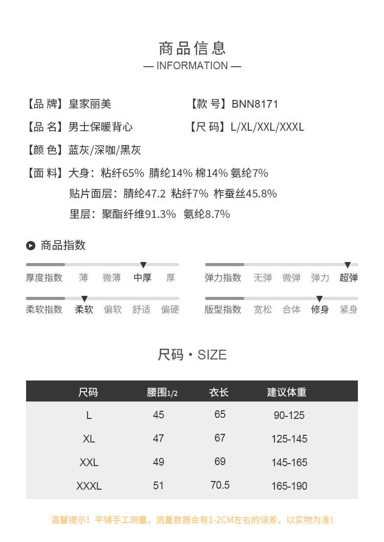 皇家丽美中厚款弹力大柔软吸湿透气男士女士保暖背心BNN8171BNM8172