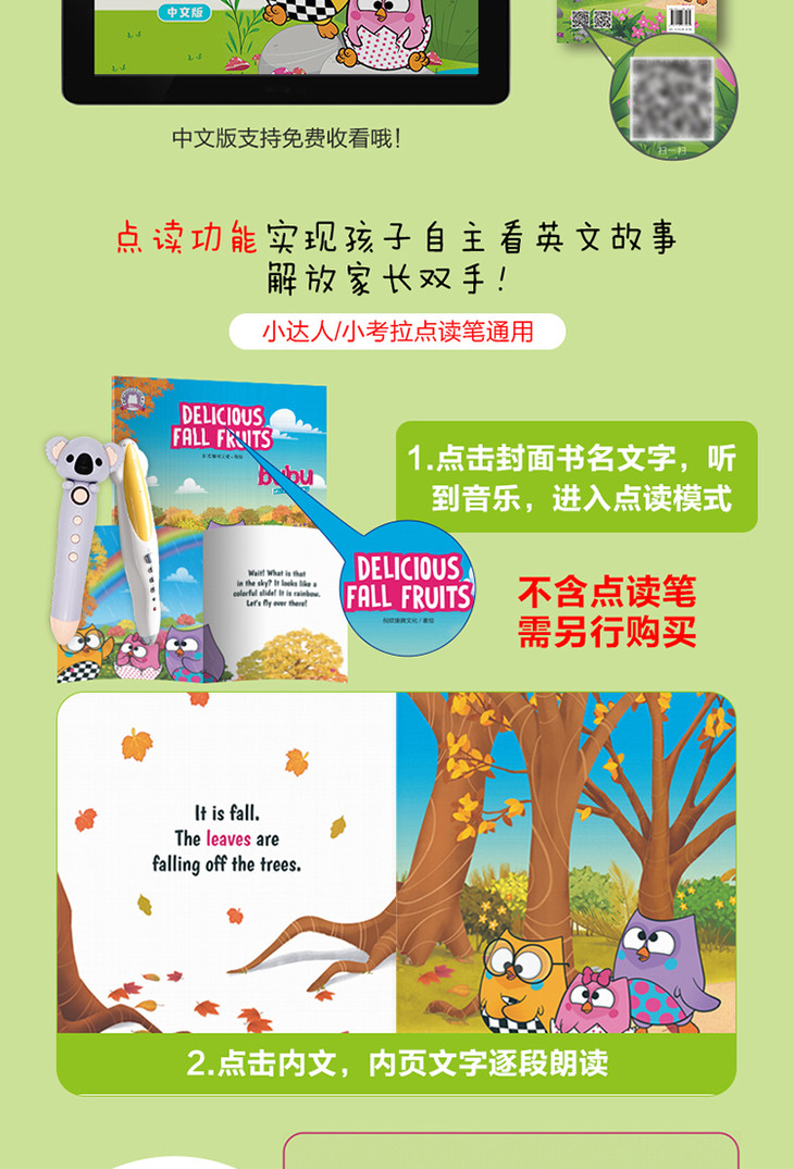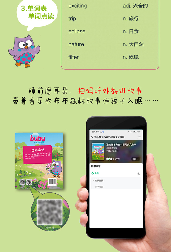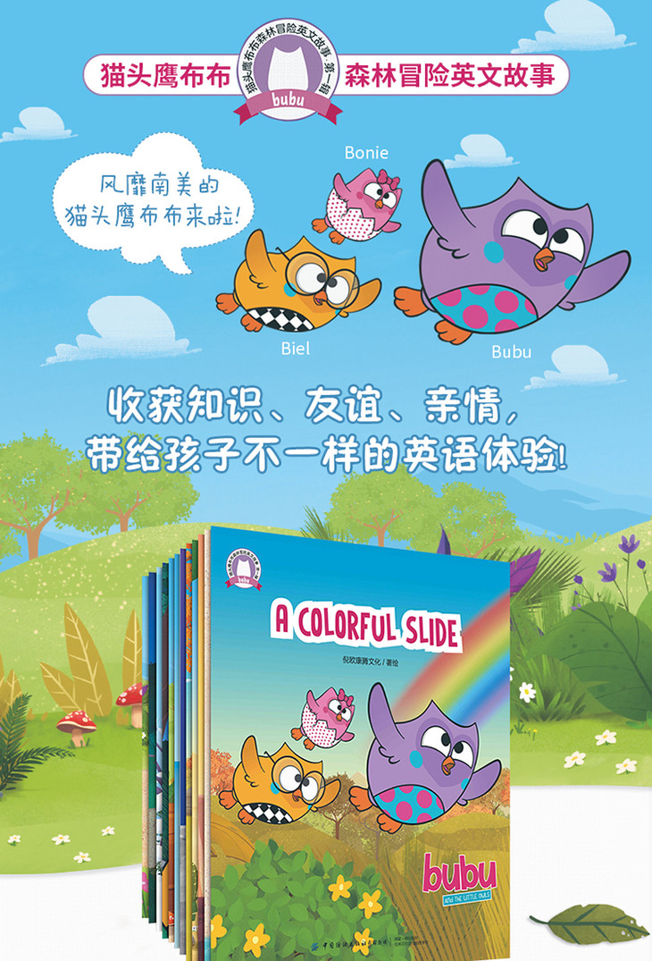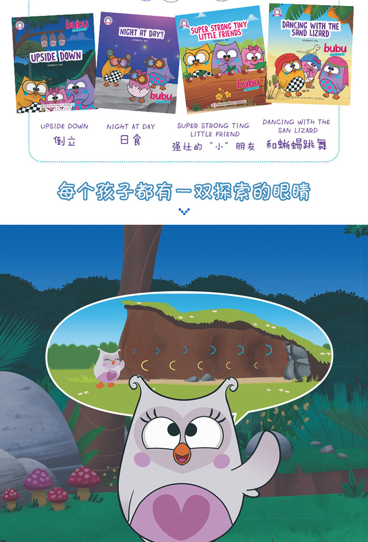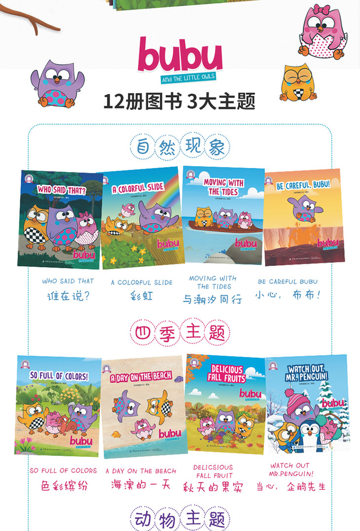 猫头鹰布布森林冒险英文故事是一套有趣的幼儿动画图书,本辑共12个小故事,三个主题,围绕着猫头鹰布布的森林生活,孩子们跟随着可爱的布布和她的一家人去森林冒险,并透过绘本了解森林里的百科知识。面对充满好奇和精力充沛的年轻猫头鹰们,他们的家人总是以极大的耐心和关爱循循善诱,展现了家人的亲情。通过与森林中其他动物结交新朋友,小猫头鹰探索、创作、歌唱,并找到他们关于自然之美和森林奥秘的答案。