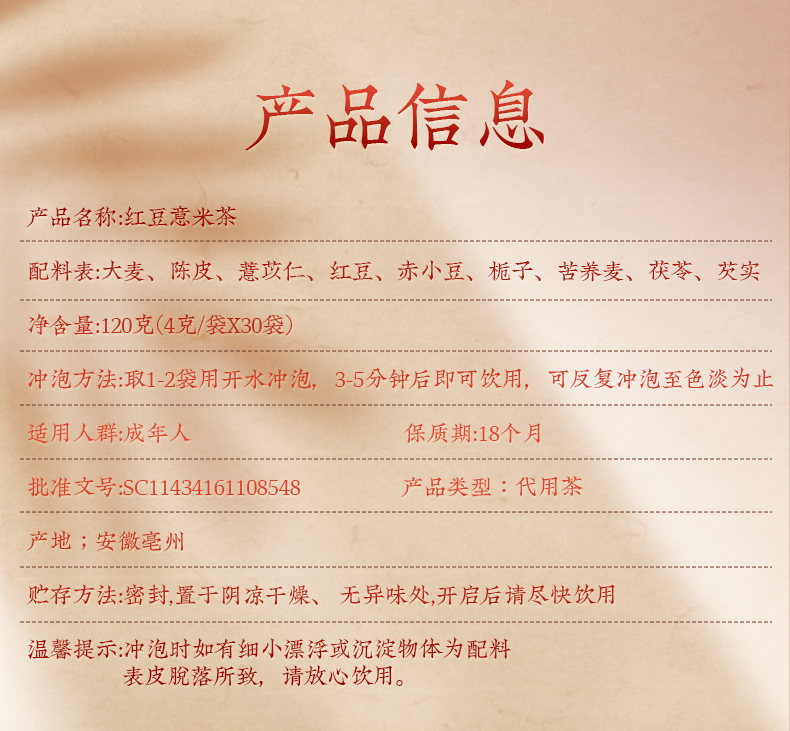北京同仁堂 内廷上用 红豆薏米茶 4g*30袋 独立小包 方便携带