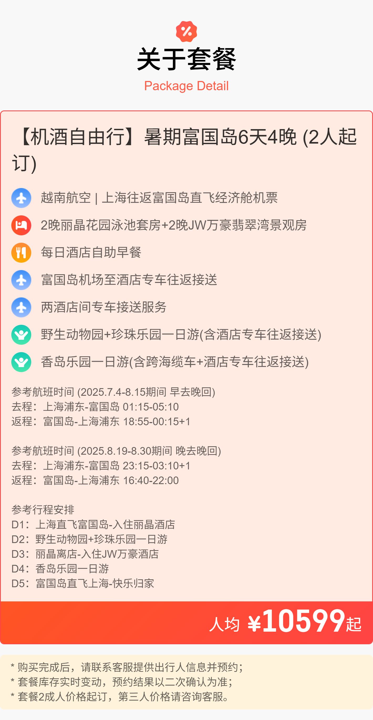 6天4晚【越南富国岛机酒自由行·上海出发】暑期专属!越南航空上海浦东往返直飞富国岛!打卡野生动物园、珍珠乐园、香岛乐园及网红超长跨海缆车,享全程专车接送服务!入住丽晶酒店+富国岛奢华顶流JW万豪~