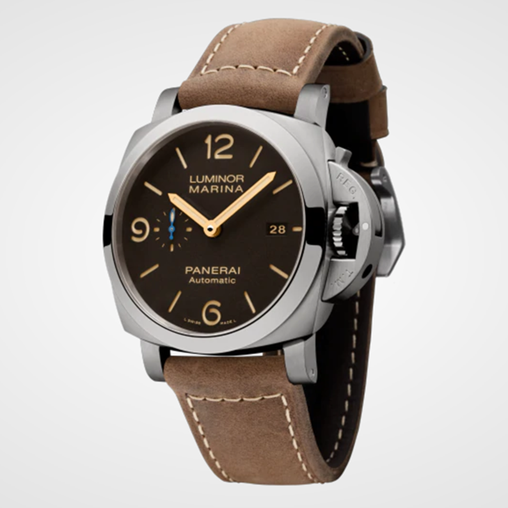镜面材质 | 蓝宝石水晶玻璃 | 表盘 | 磨砂钛金属表壳 棕色表盘,配夜光阿拉伯数字及小时标示。3点钟位置设日期显示,9点钟位置设小秒盘。 磨砂钛金属表冠护桥(沛纳海专利) 透底 |