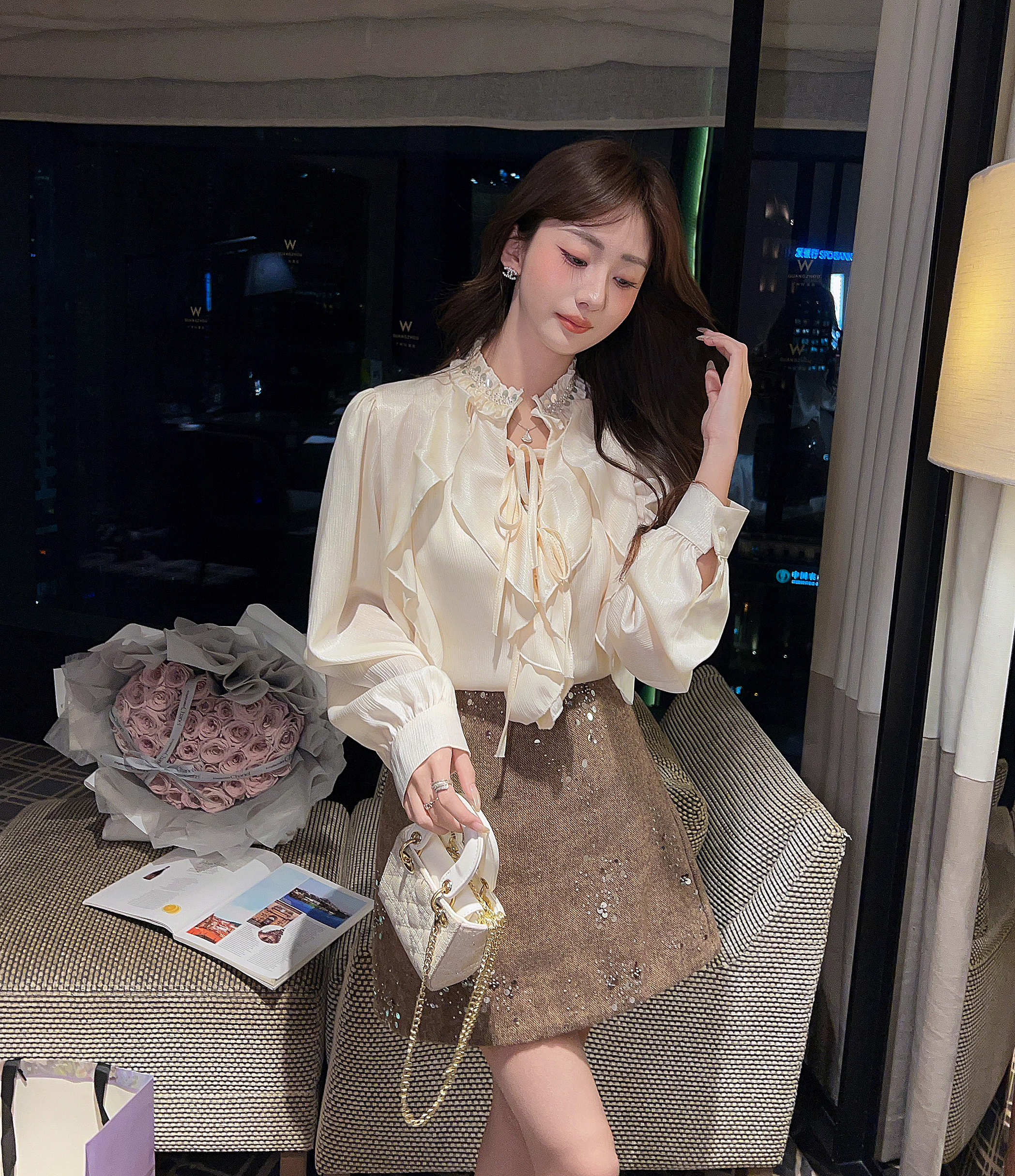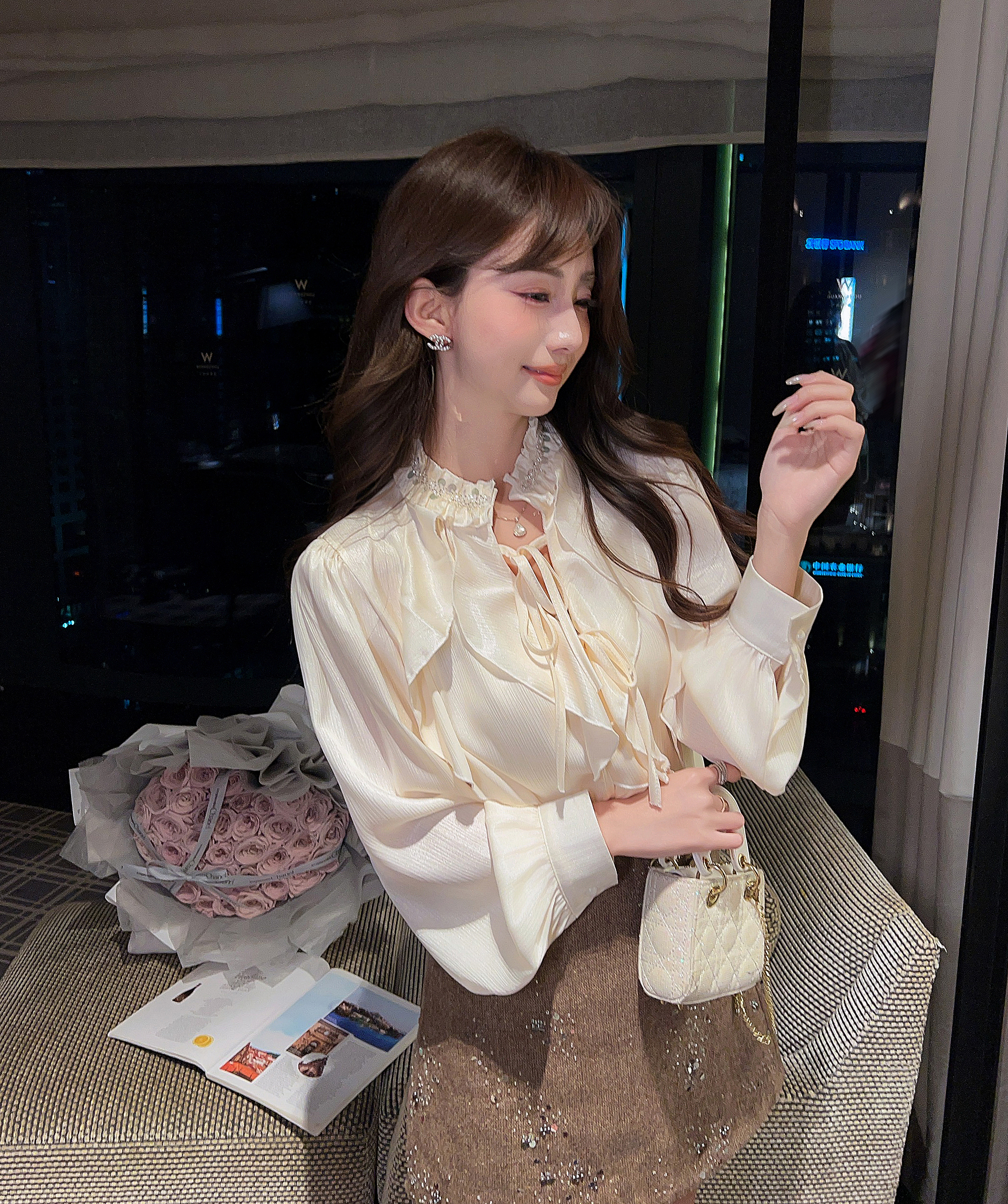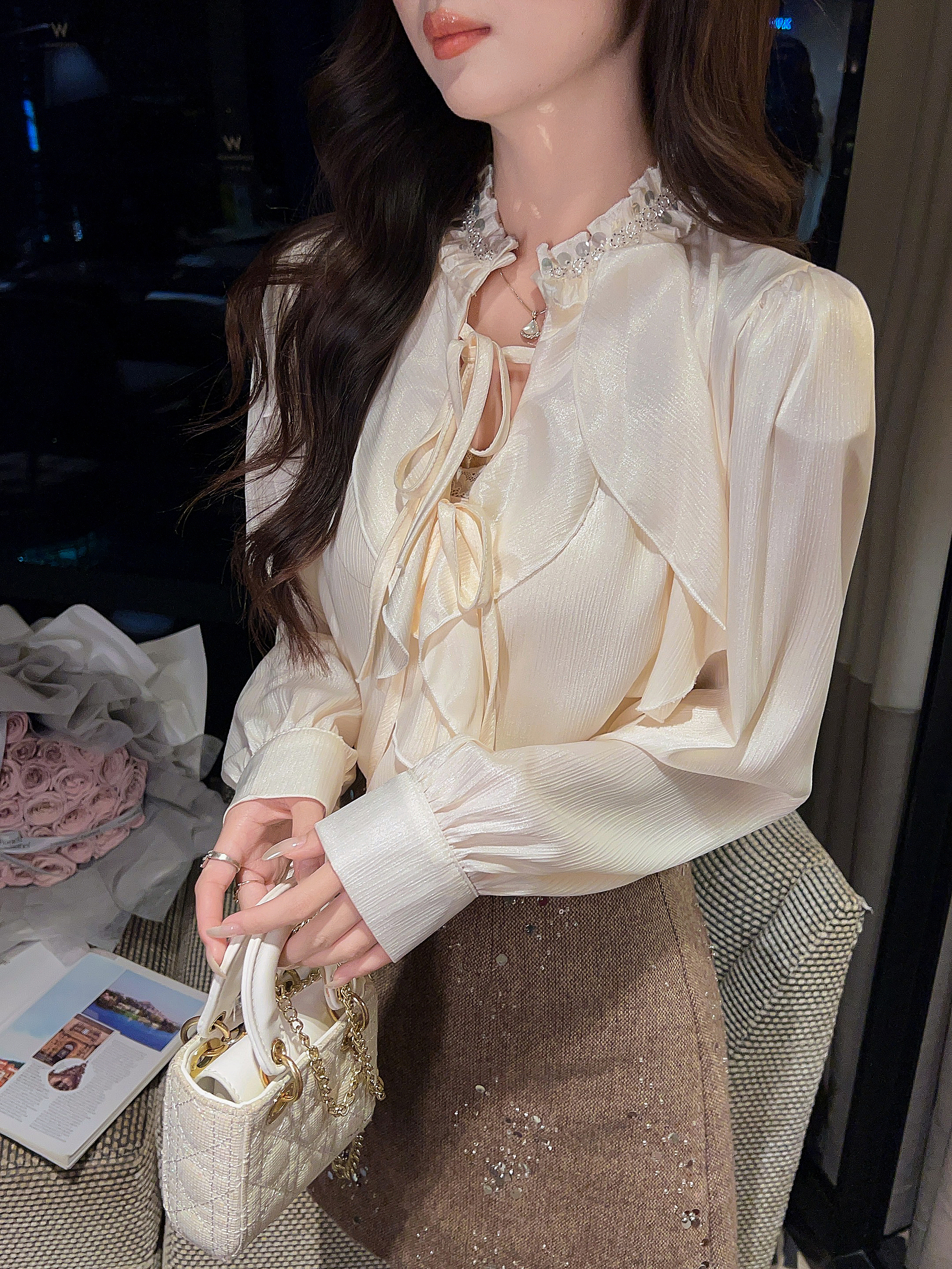 张心子【琉光漫歌】法式小资系带荷叶边雪纺衫女春新款洋气衬衫 U2602077