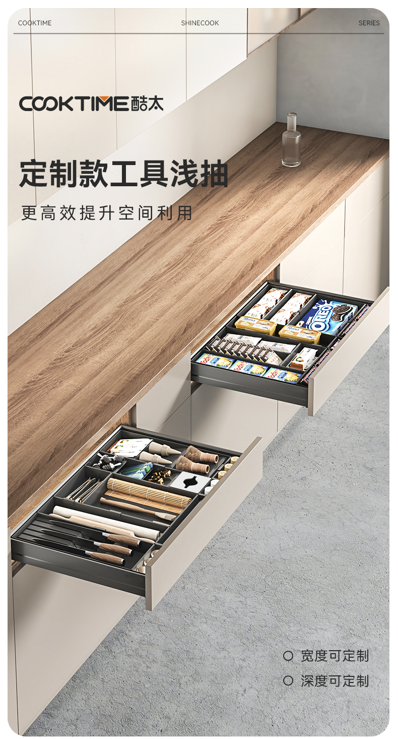 - 酷太坚持8年自主研发,已获得专利证书130项,拥有一套领先市场的厨房收纳系统,为千万中国家庭解决厨房脏乱差,缔造厨房新生活。