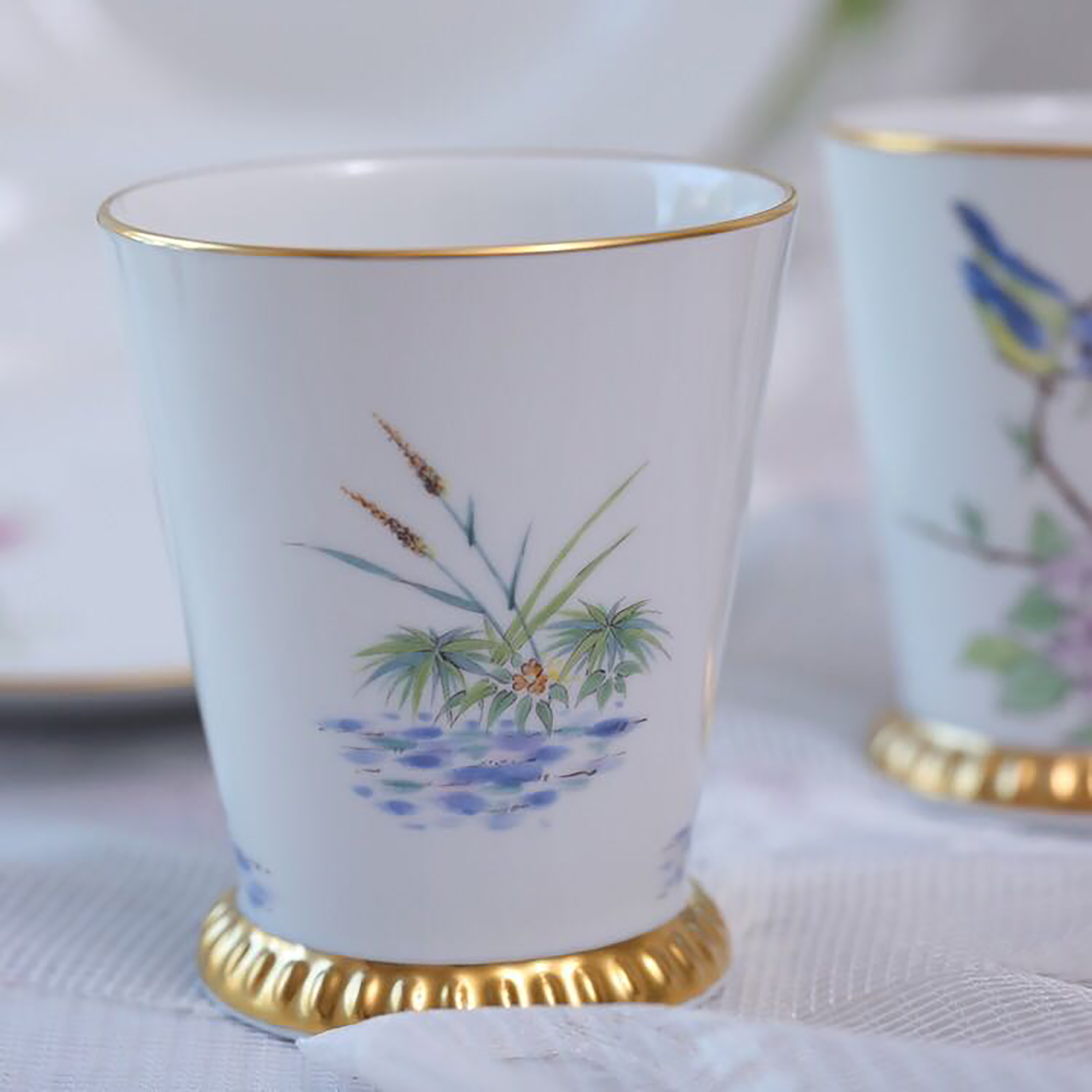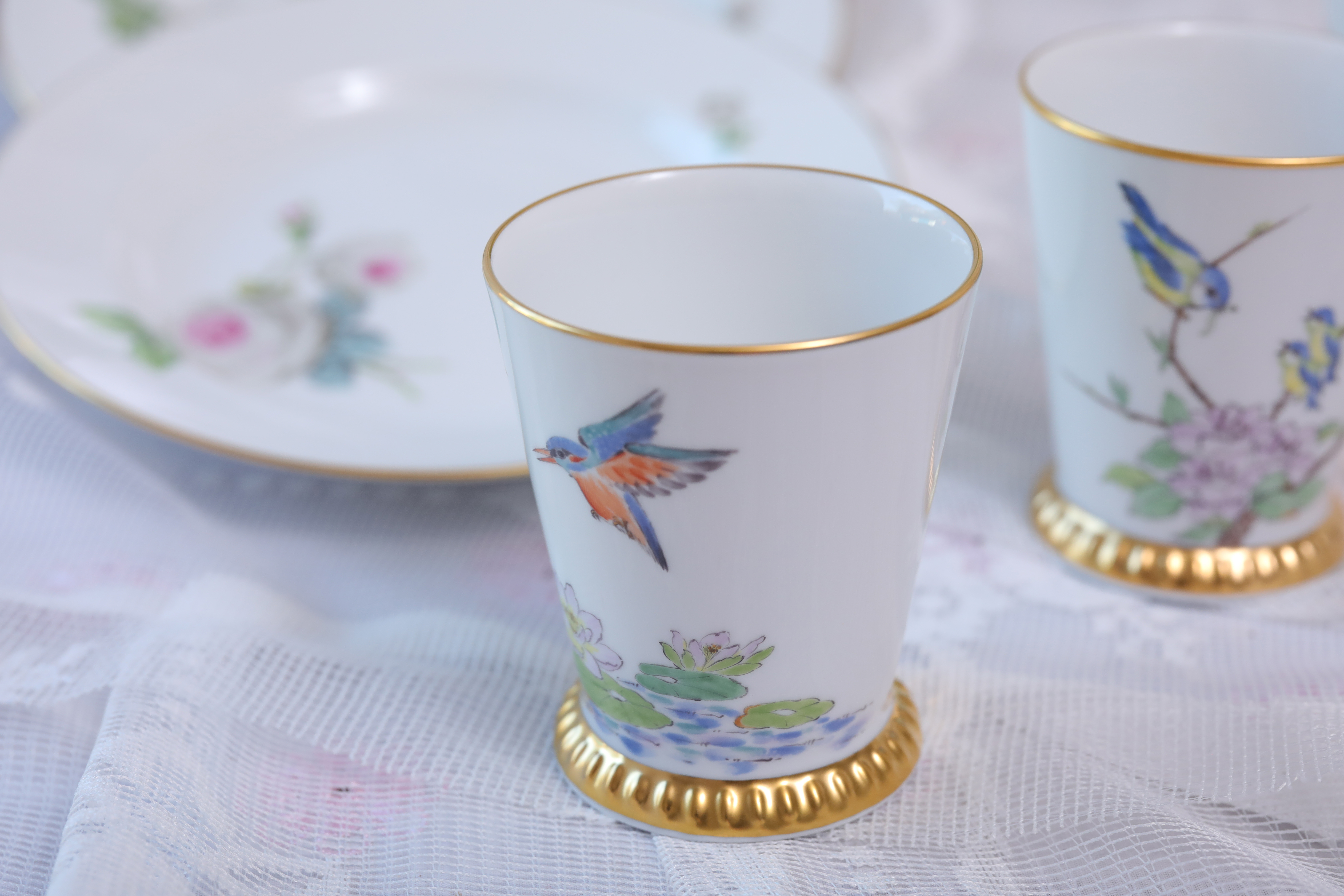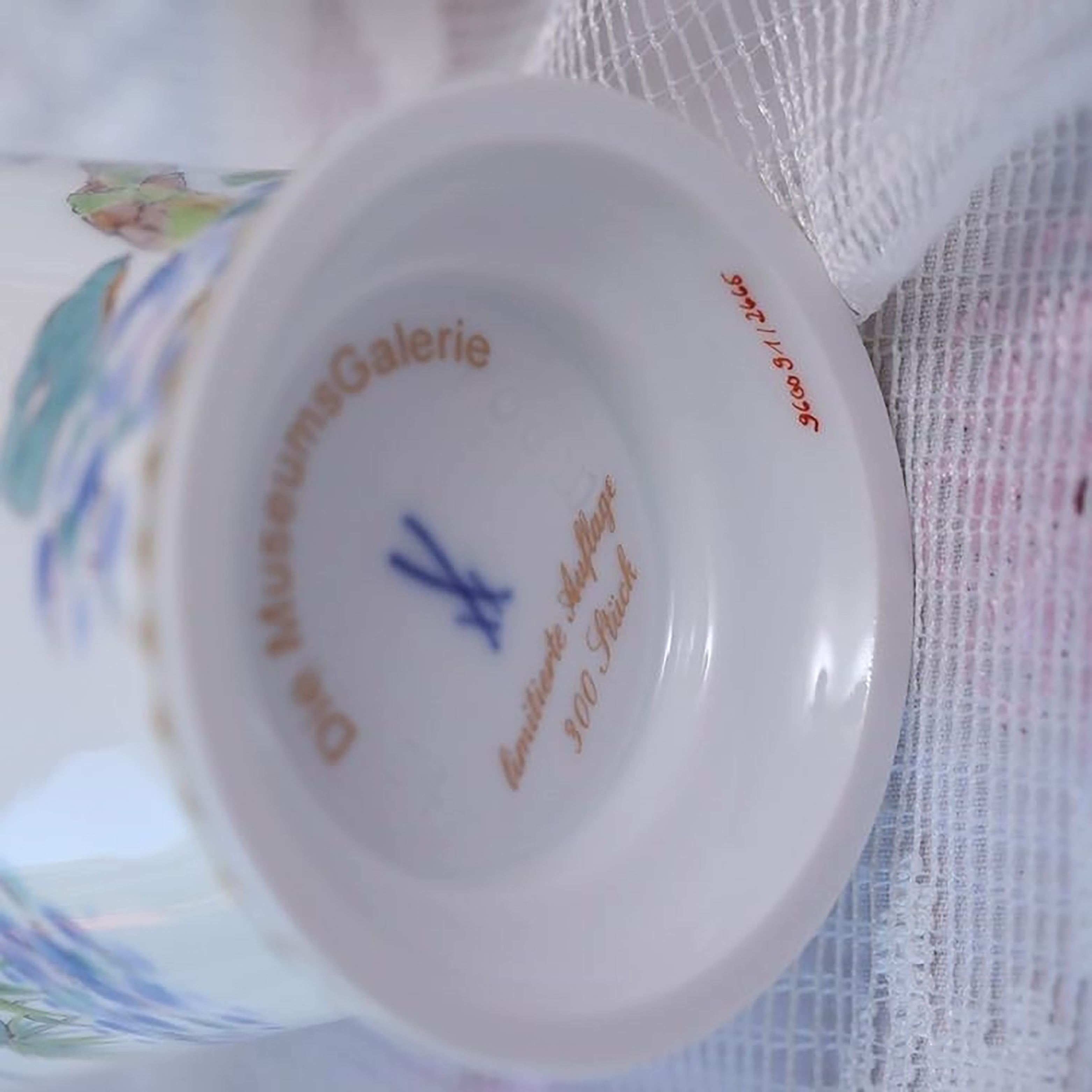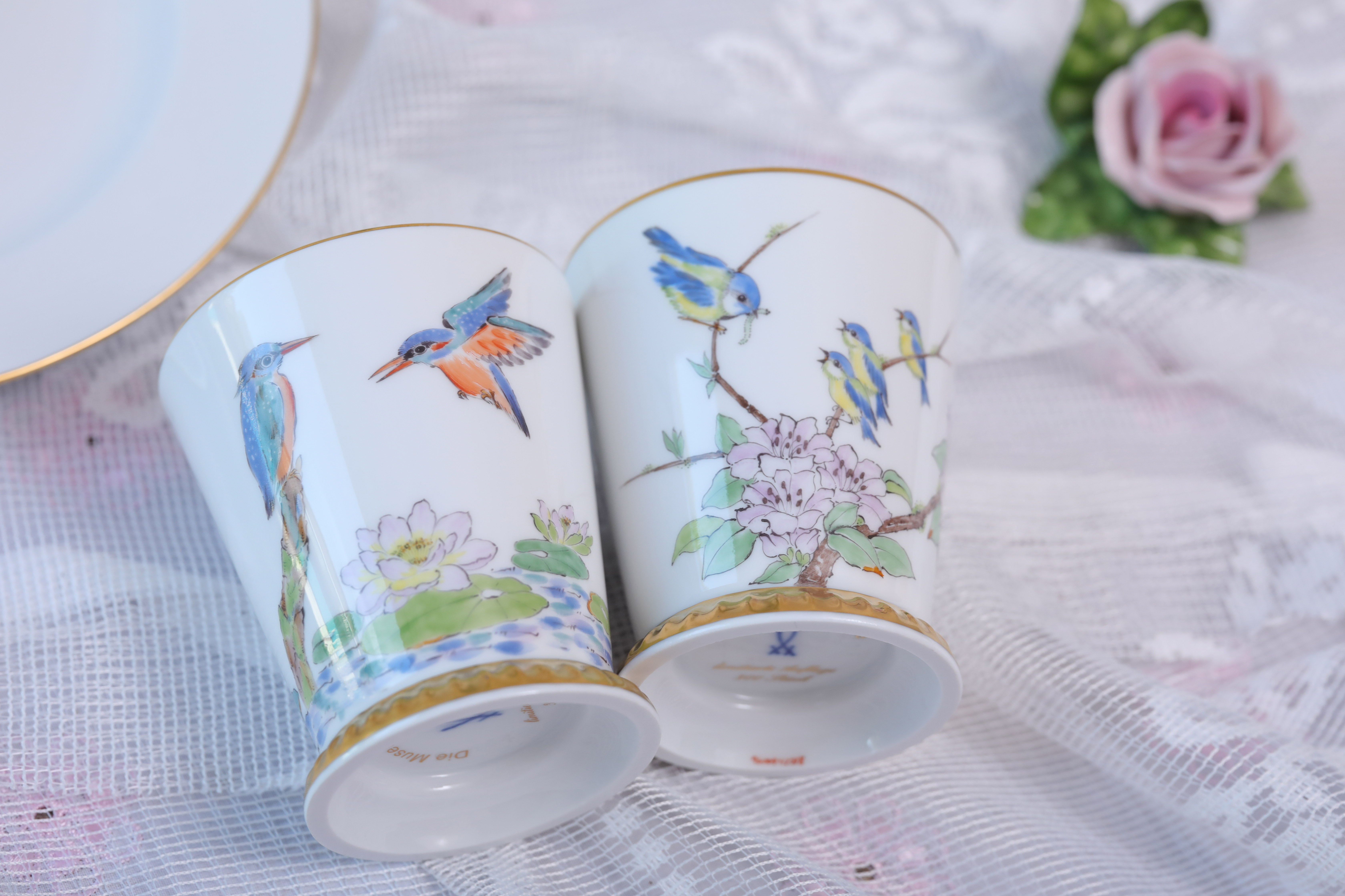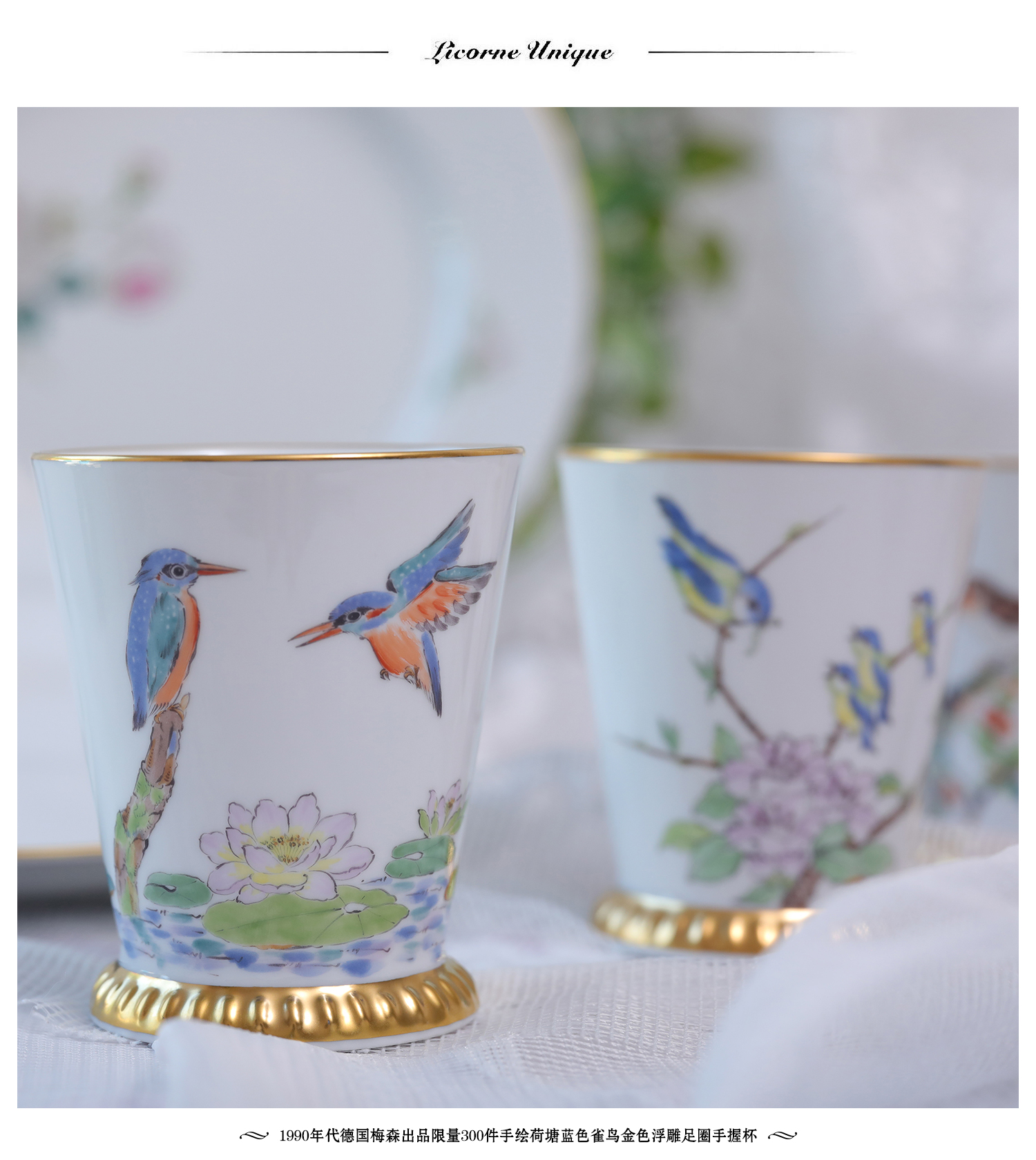 独角鹿西洋古董德国梅森限量手绘荷塘蓝色雀鸟金色浮雕足圈手握杯