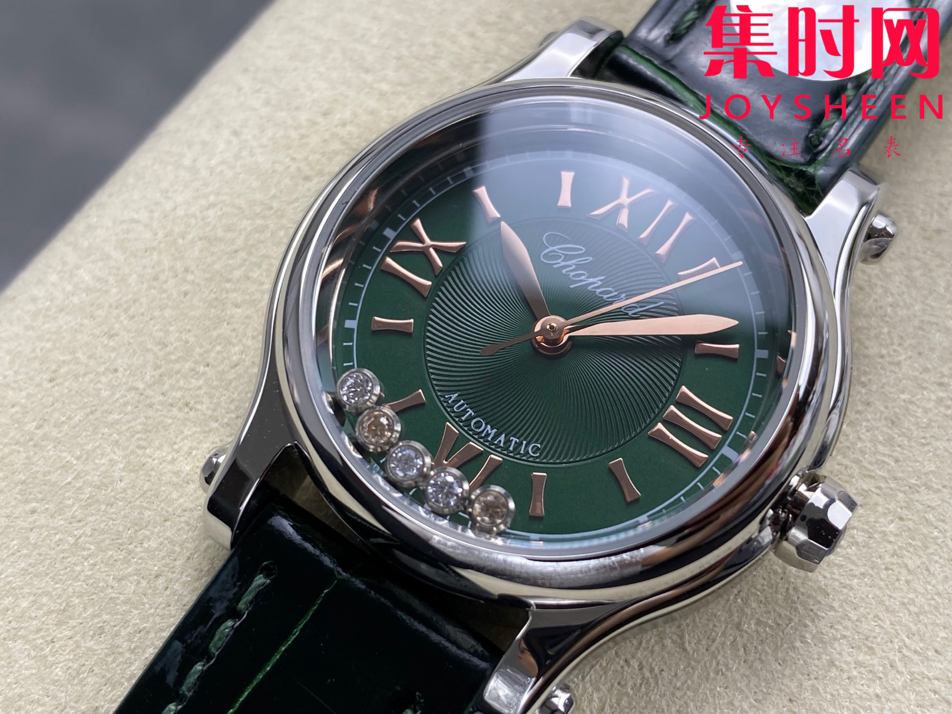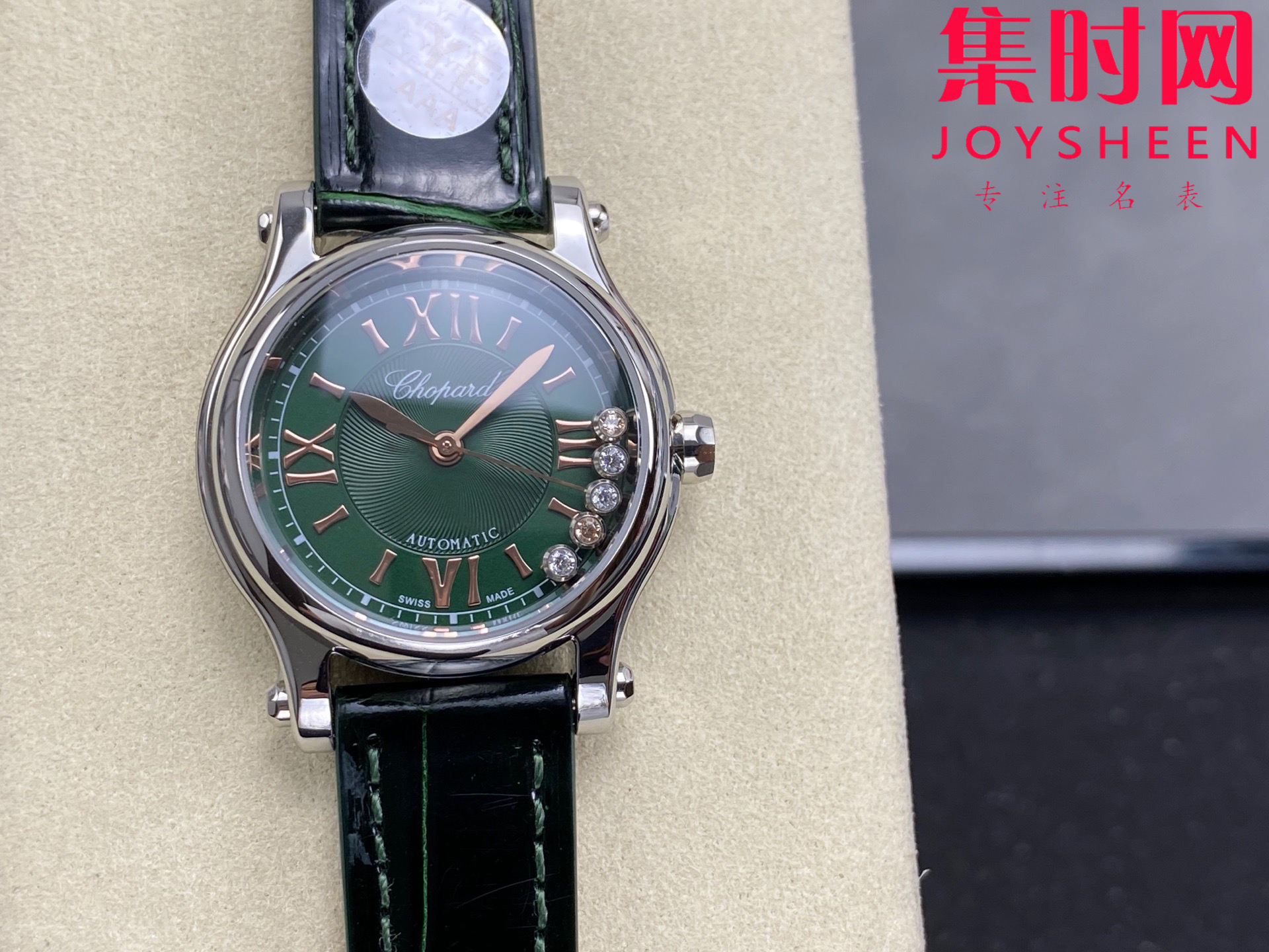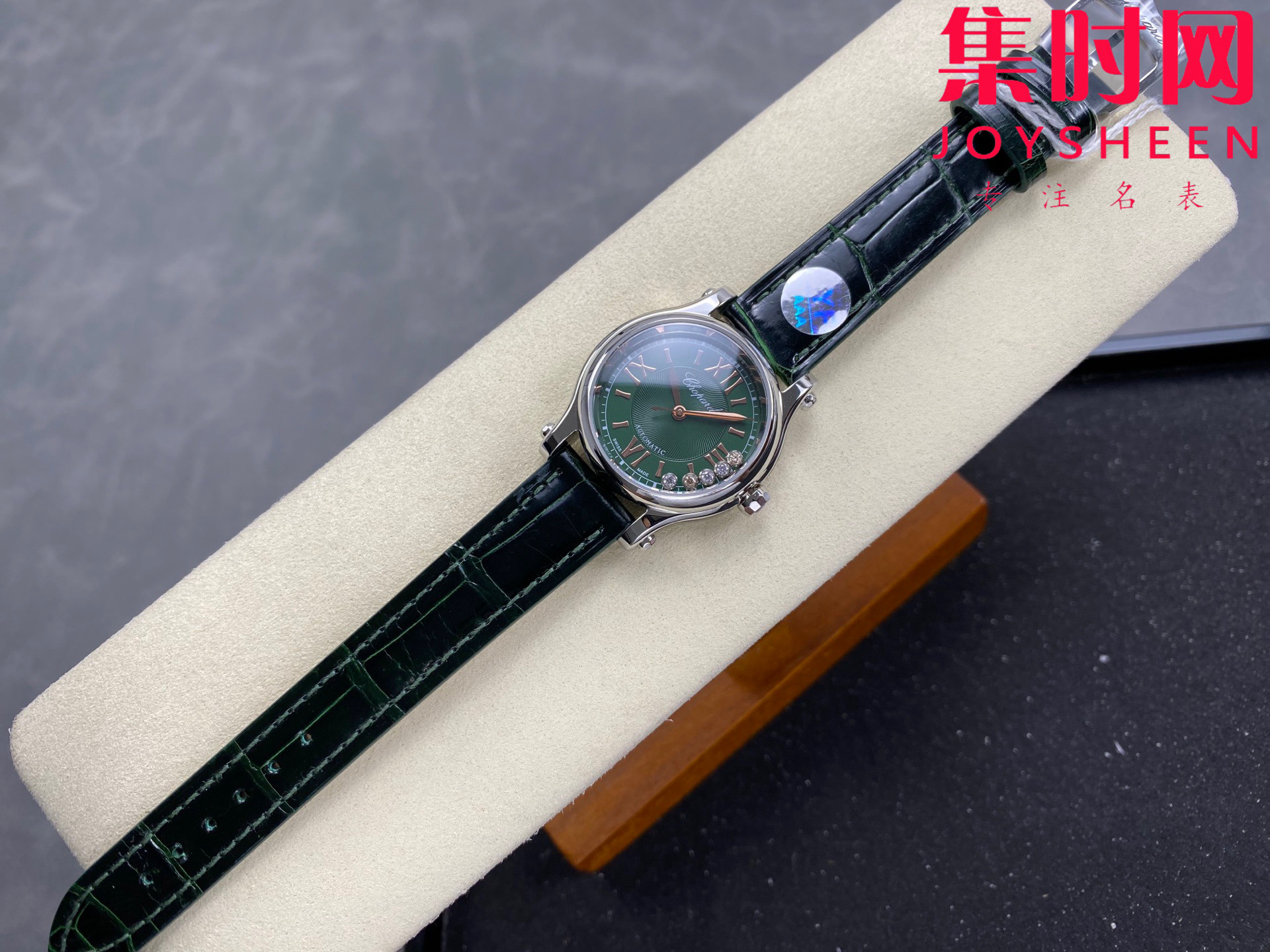 YF萧邦快乐钻系列 新配色绿色盘 快乐钻30mm五钻 女士腕表 表径30mm 采用高端定制美洲鳄鱼皮表带 搭载2892全自动机械机芯,双层蓝宝石水晶镜面,要知道Happy sport系列的特点就是开创性的将精钢与品牌标志性的灵动钻石结合在一起 它打破了珠宝腕表多用贵金属表壳的传统 这块新推出的限量版以松绿色为主色调 搭配18k玫瑰金的指针和时标 绿色代表着生命和蓬勃 黄色则象征着阳光和能量 这个撞色搭配既展现了自然的活力 又传递出积极向上的生活态度 因此这款腕表被形象的称为"绿进斗金"这款腕表拥有30mm毫米的腕表直径,对于大部分女士来说这个尺寸刚刚好。