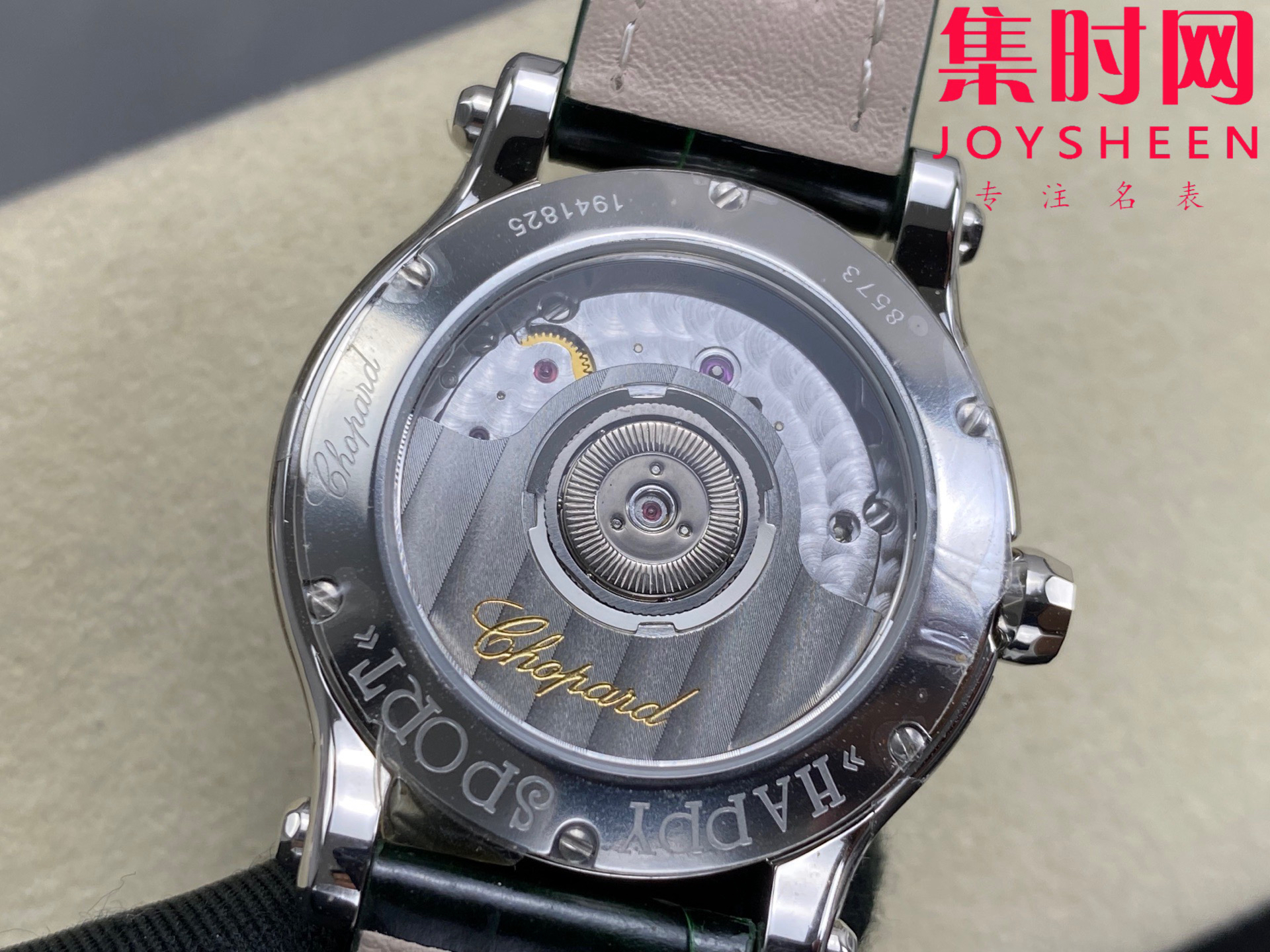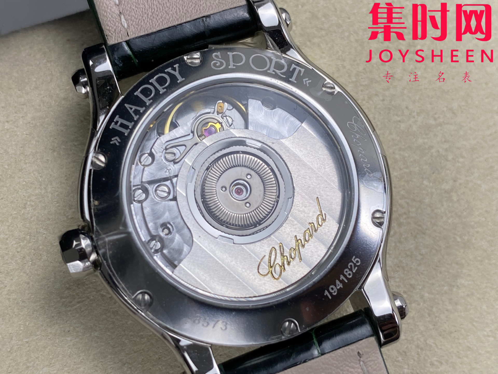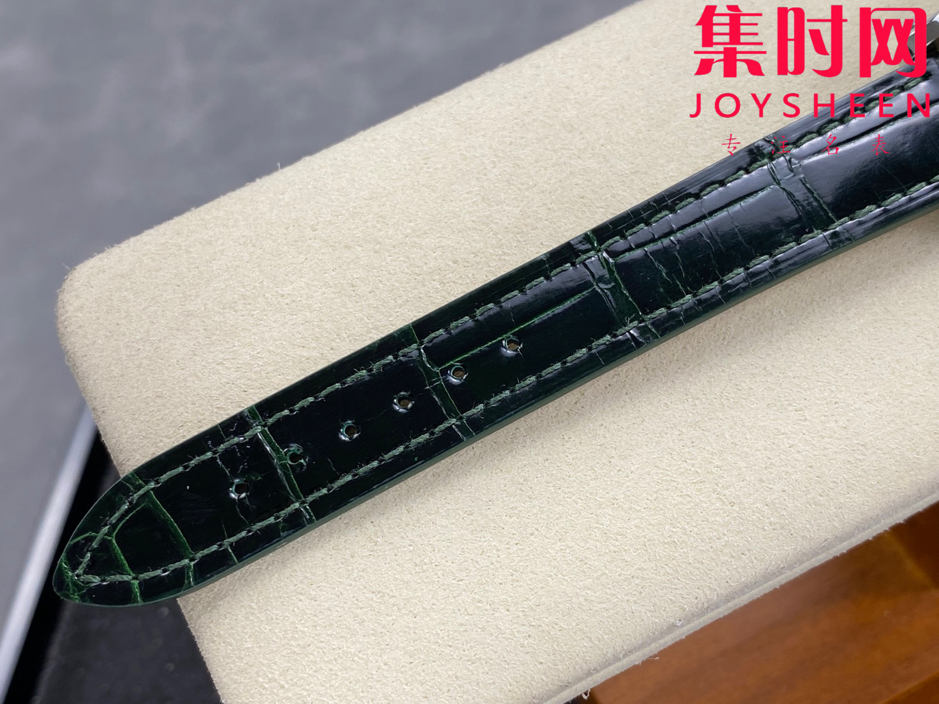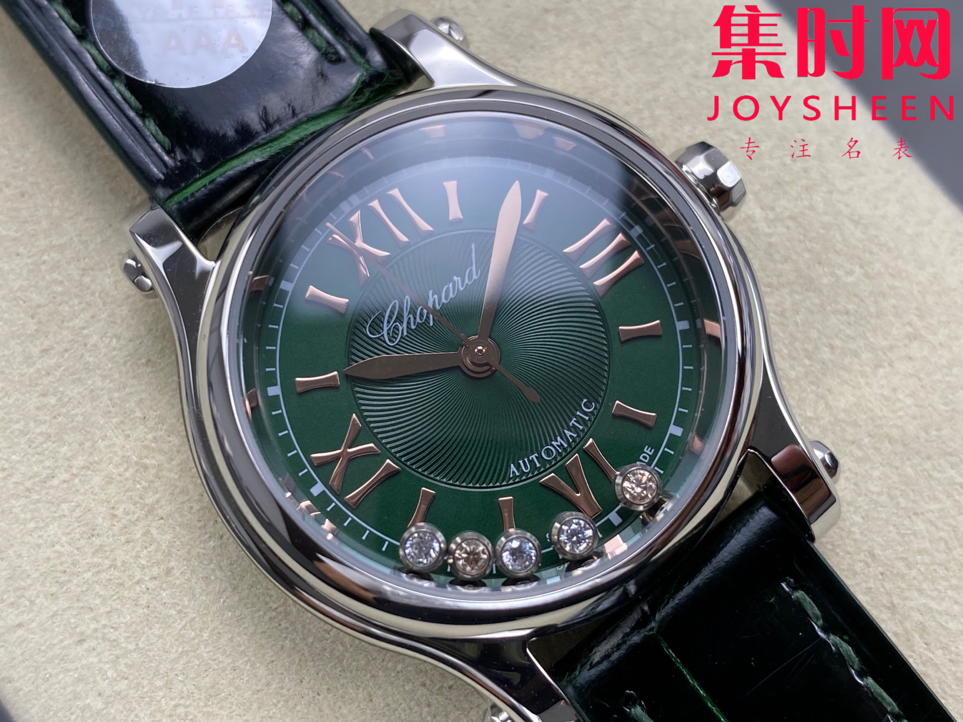 YF萧邦快乐钻系列 新配色绿色盘 快乐钻30mm五钻 女士腕表 表径30mm 采用高端定制美洲鳄鱼皮表带 搭载2892全自动机械机芯,双层蓝宝石水晶镜面,要知道Happy sport系列的特点就是开创性的将精钢与品牌标志性的灵动钻石结合在一起 它打破了珠宝腕表多用贵金属表壳的传统 这块新推出的限量版以松绿色为主色调 搭配18k玫瑰金的指针和时标 绿色代表着生命和蓬勃 黄色则象征着阳光和能量 这个撞色搭配既展现了自然的活力 又传递出积极向上的生活态度 因此这款腕表被形象的称为"绿进斗金"这款腕表拥有30mm毫米的腕表直径,对于大部分女士来说这个尺寸刚刚好。