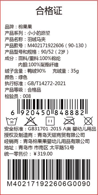 商场同款棉果果冬季男女童立领保暖舒适轻便运动羽绒马夹M402171922606