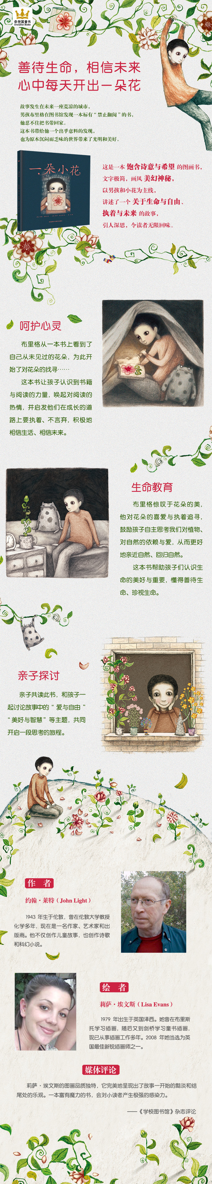对于年龄偏大的孩子来说,家长可以和孩子一起进行不同程度的探讨,谈谈那些勇敢传播爱与自由、美好与智慧的故事。就像《一朵小花》中的男孩布里格,就像旧货店收藏美好记忆的店主老人,每一个时代都有这样的人,在做着让世界变得更美丽的事情。