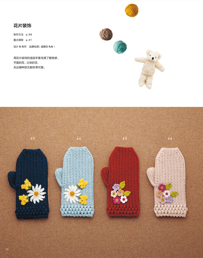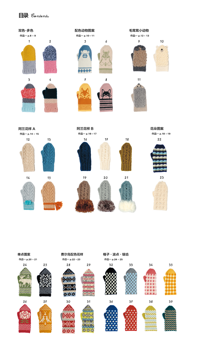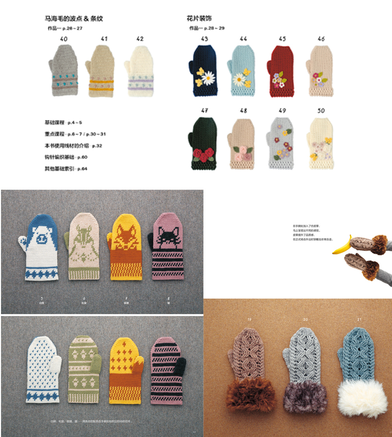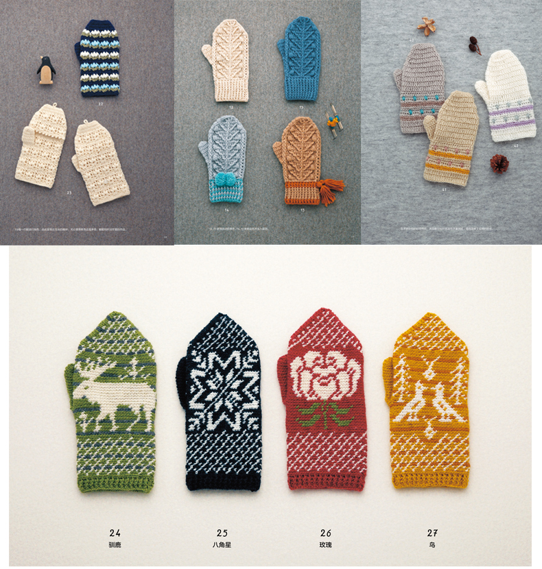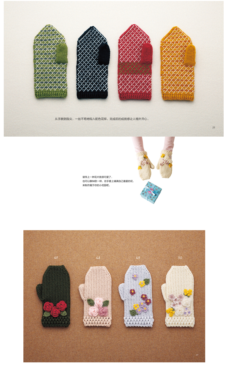 此次刊载的50款手套,所有编织花样都选用平时常用的阿伦花样、北欧风花样、费尔岛花样、花朵装饰等款式。