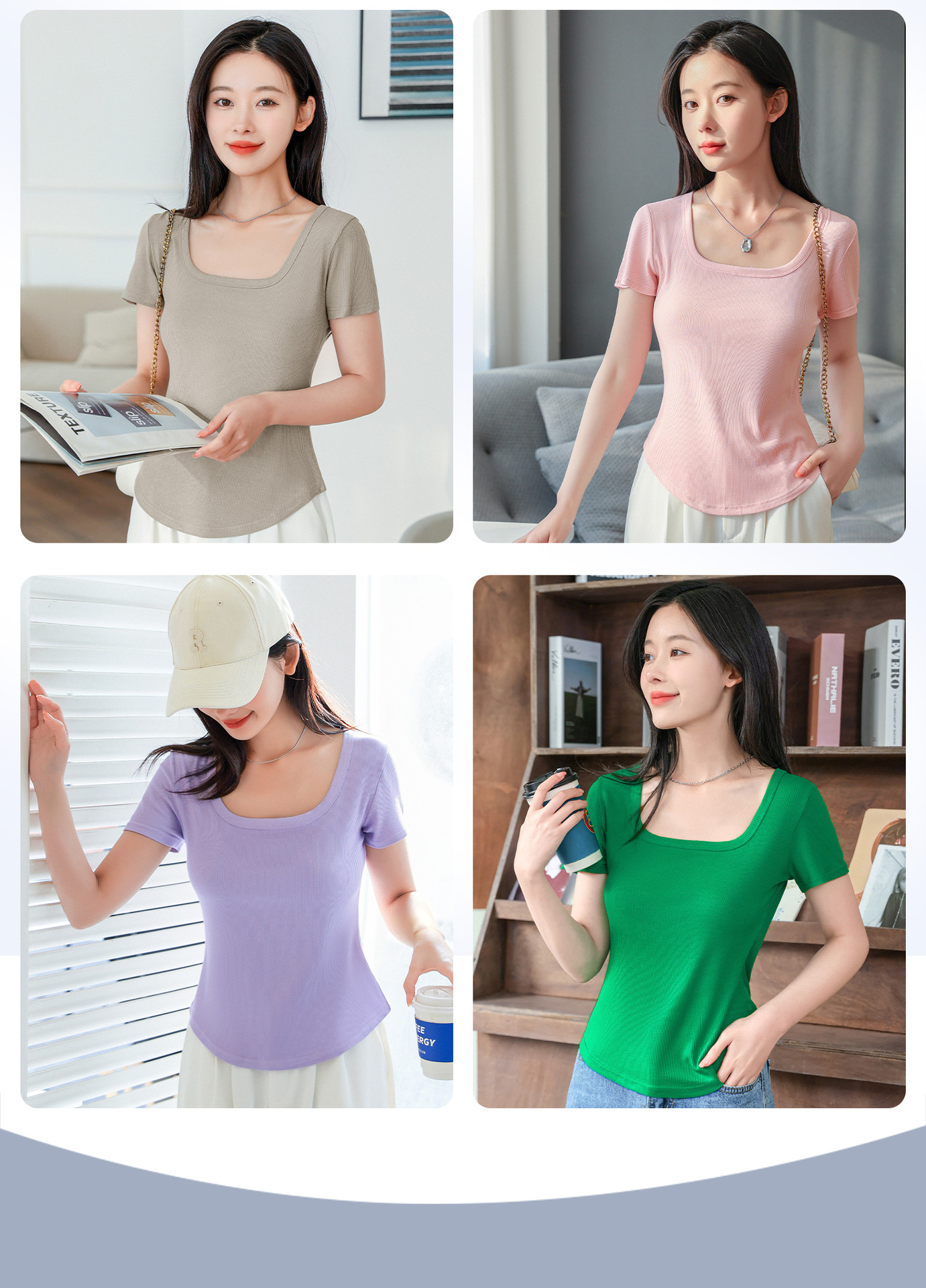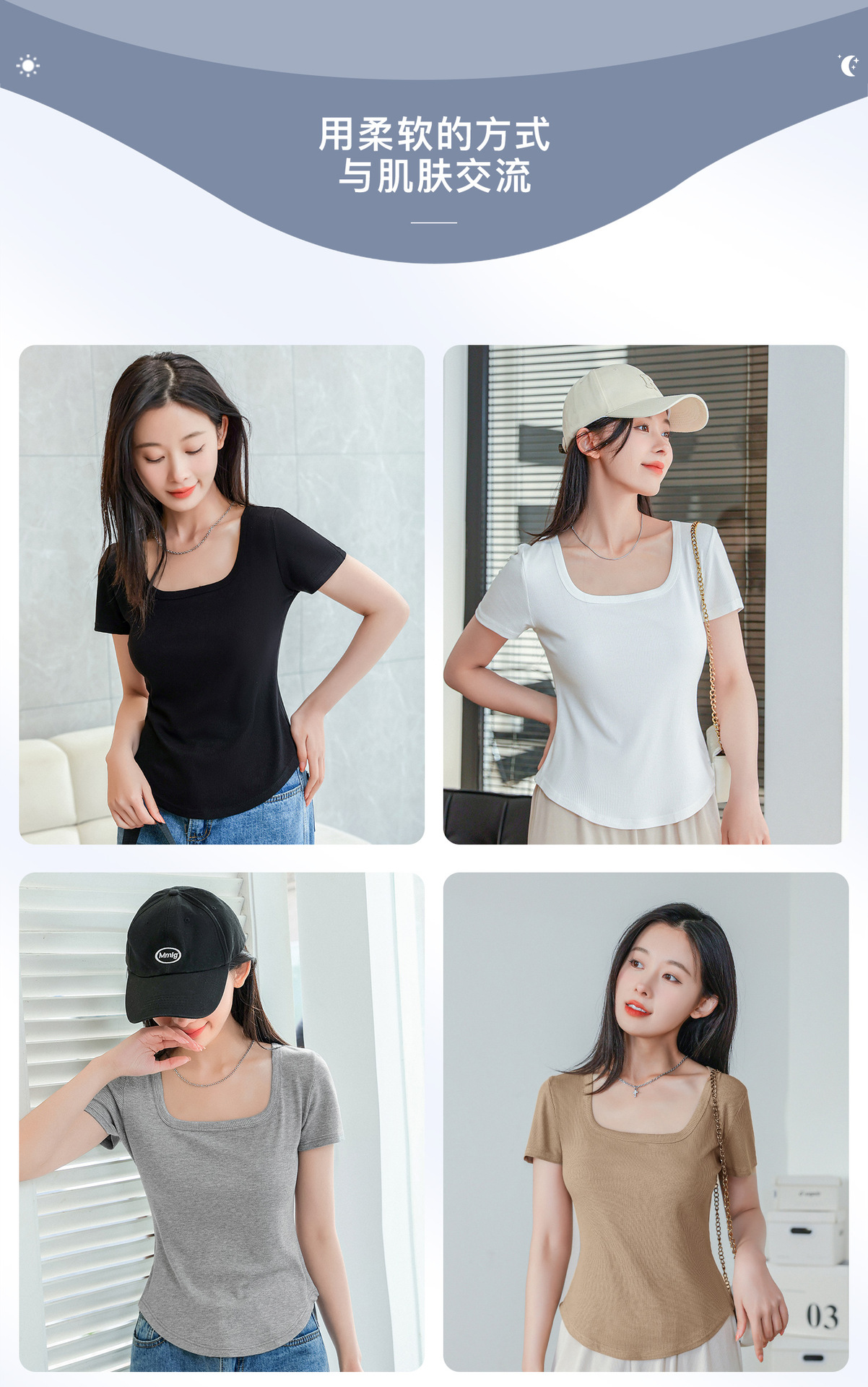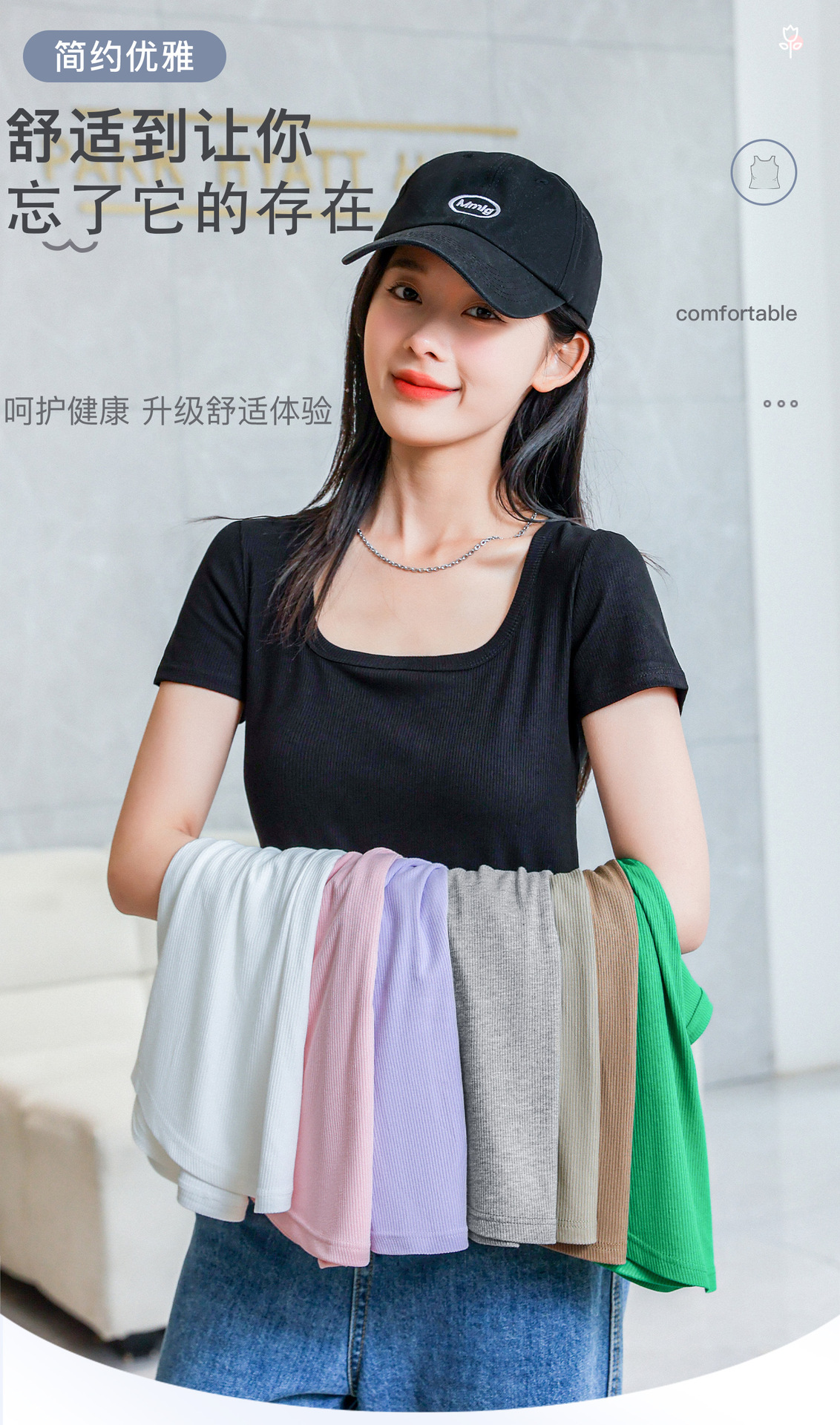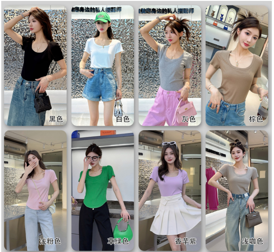 【简约优雅,舒适到忘了它的存在】2023夏季新款螺纹短袖t恤女ins小众设计修身显瘦U领上衣