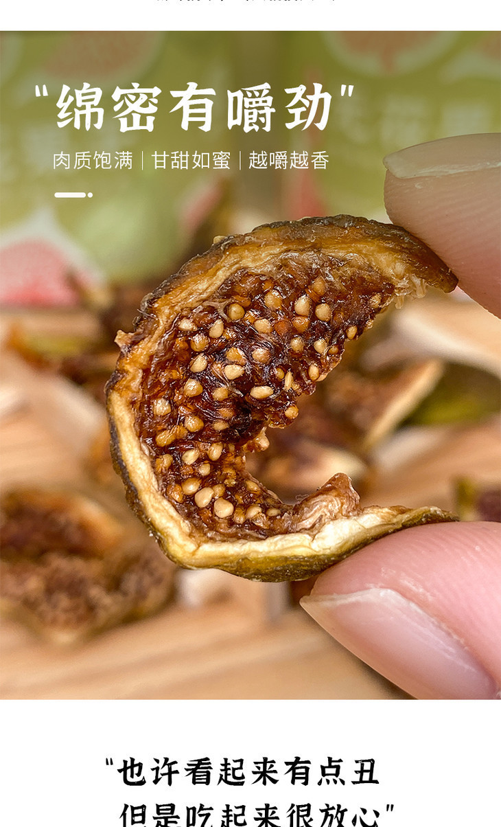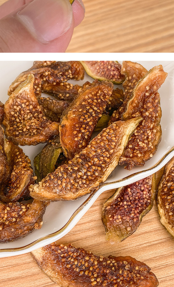 吃过新鲜无花果,极少人吃过无花果干,这也是公认干的比新鲜果还更好吃的水果,制成果干很好的锁住了无花果的营养成份,里面含有丰富的花青素和多酶,药食俱佳。