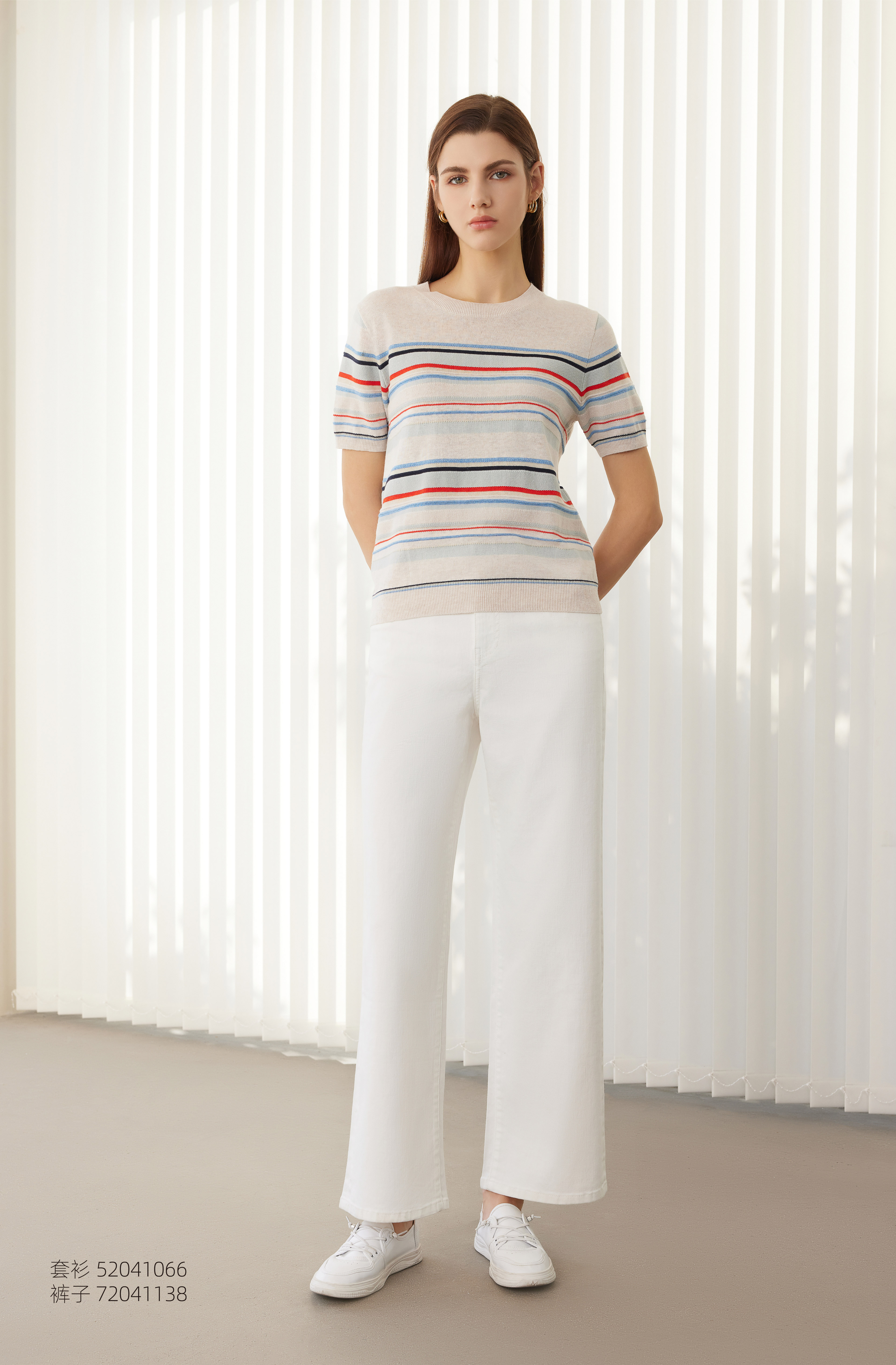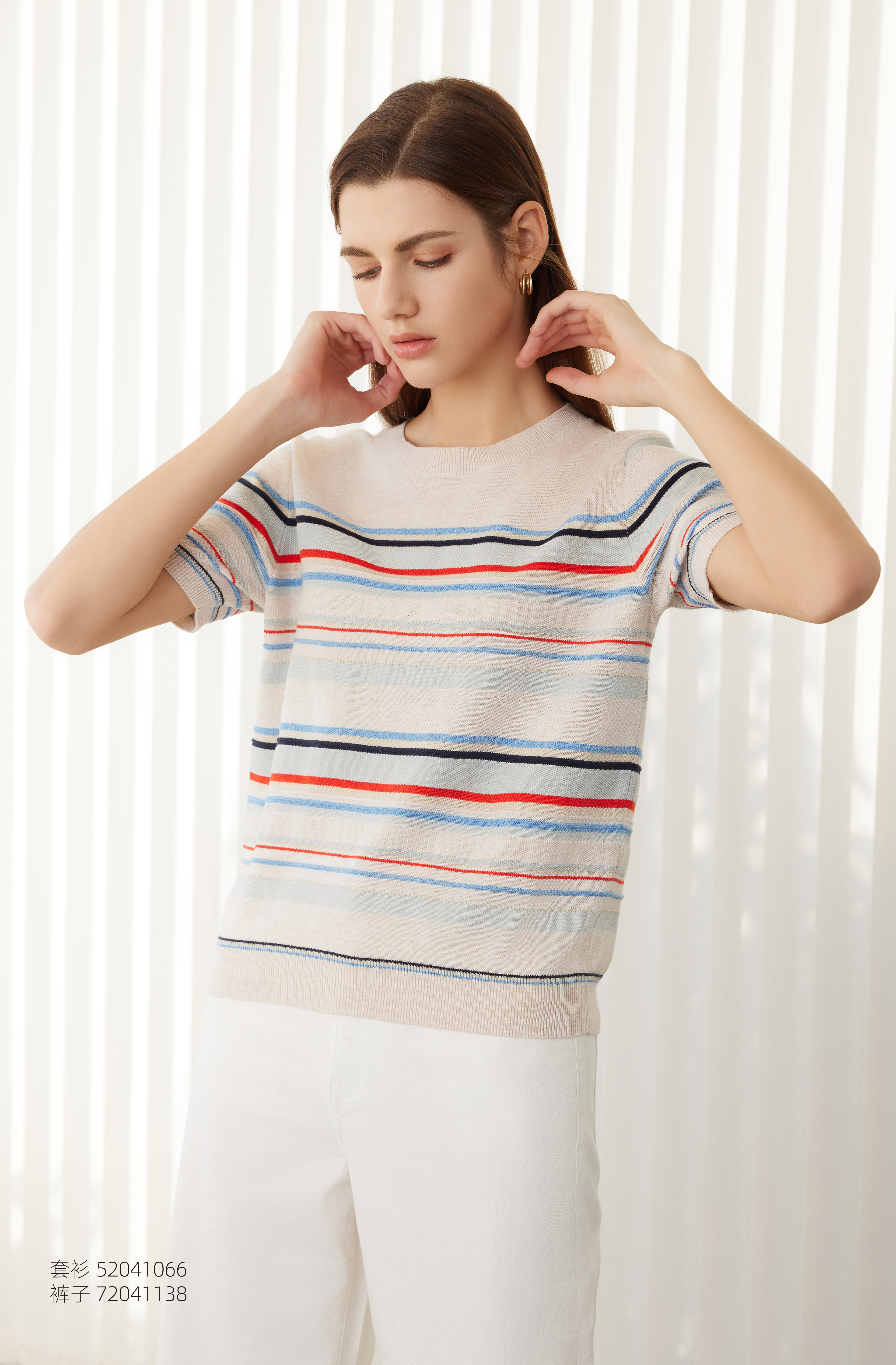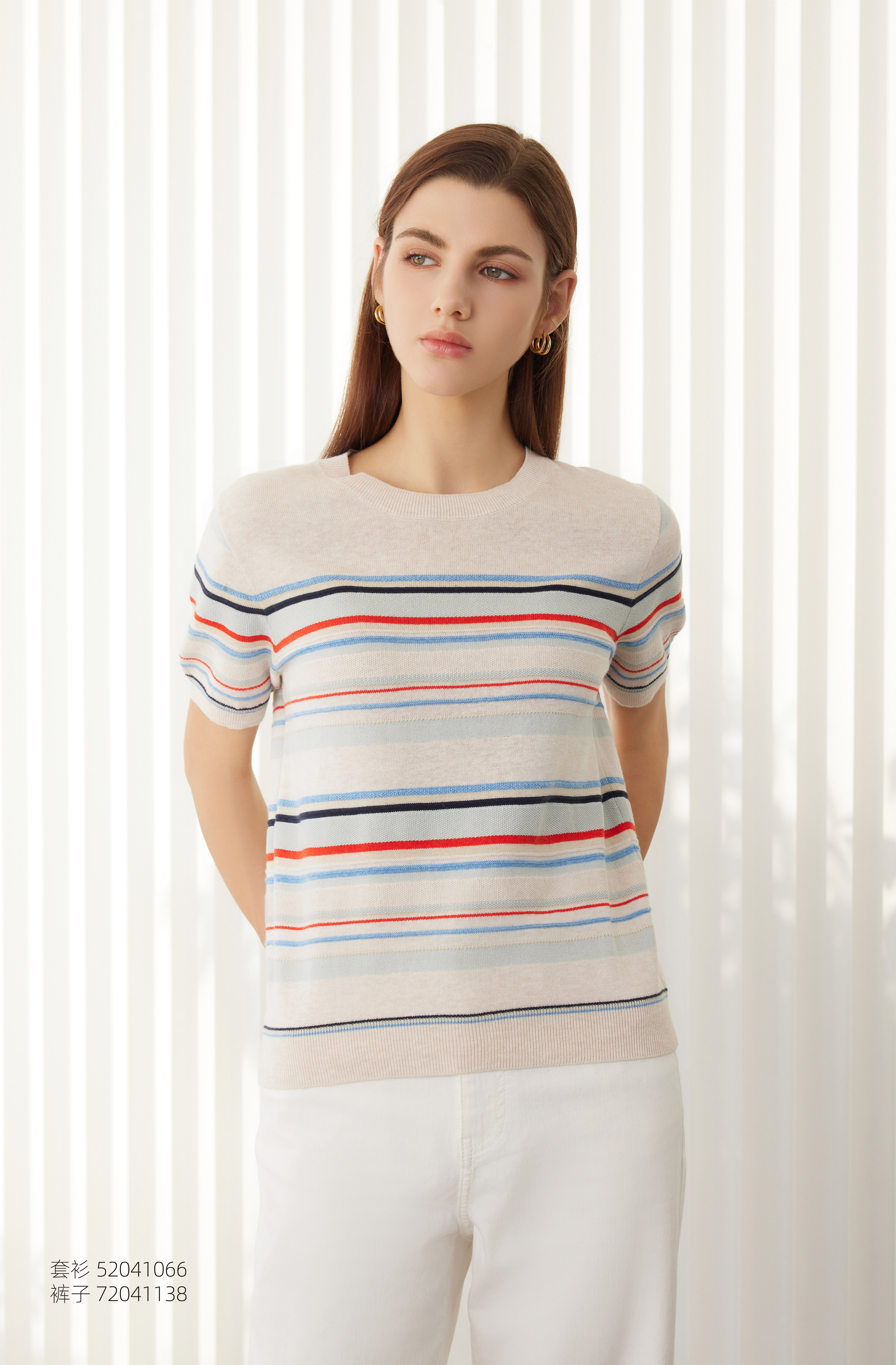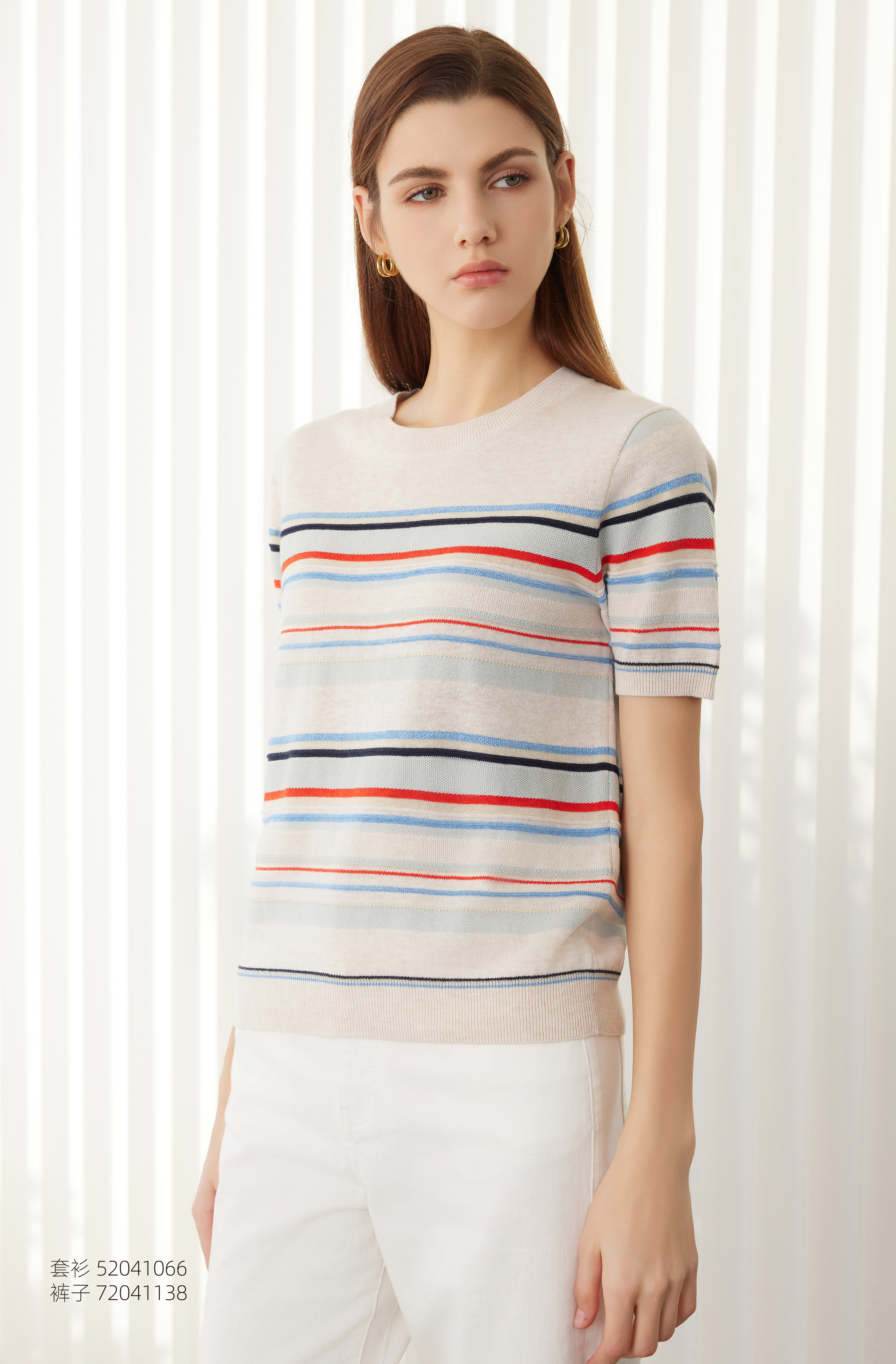 【棉麻条纹针织套衫】24年春夏新品女士圆领时尚条纹撞色短袖针织上衣
