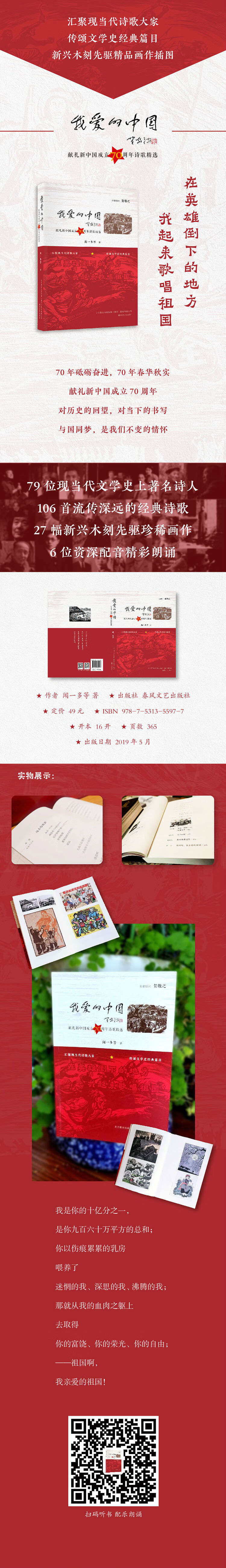本诗集在组稿过程中历经数次选摘,从新中国成立前后涌现出的大批热爱祖国、歌颂祖国的诗歌中反复品读、筛选,甄选出在诗坛享有声誉的大家名篇,紧贴祖国主题,既有脍炙人口的经典之作,也有被载入文学史册的代表性作品。编者在作者版权、篇幅长短、主题深刻、诗性优美、年代特色等多种元素中权衡,*终确定了106首诗歌篇目,按照作者出版社年份排序,集合了现当代70年间前后几代诗人的优秀诗作。其中包括“九叶诗派”“新月派”“汉园三诗人”“现代派”“七月诗派”“朦胧诗派”“现实主义”“新现实主义”“新边塞派”“大学生派”等中国现当代文学史上*为知名的诗歌群体代表诗人和诗作。
