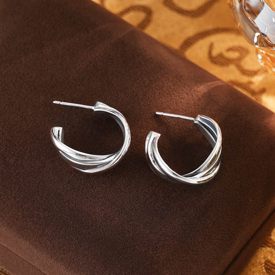 【寓意】:耳饰纯银材质,两根银丝交织缠绕的设计,释放闪耀光芒,寓意爱意交织,痴心守护。