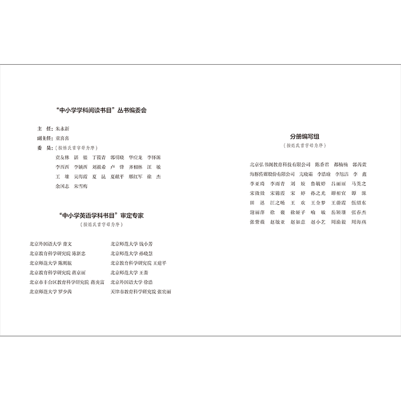 中小学英语学科书目研制组汇聚了来自新阅读研究所和中国英语阅读教育研究院的教育专家、英语教学研究学者。他们凭借深厚的专业知识、丰富的教学研究经验,以及对中小学英语教育事业的热忱,承担起《中学英语学科书目(学生版)》的研制重任。在研制过程中,历经多轮调研、征集、试读与评审,经过无数次论证和修改,确保为中小学英语教师呈现出兼具权威性、科学性与实用性的专业书目,为提升英语教学质量、助力学生英语素养发展提供有力支撑。