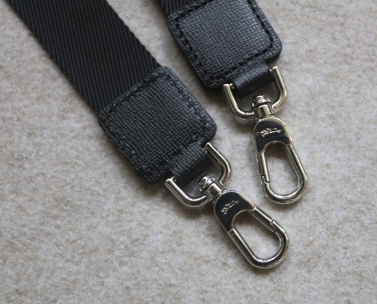 双耳的银色环扣 背带勾扣上 都有刻字 小翻盖黑皮 惯用的按扣+压印工艺