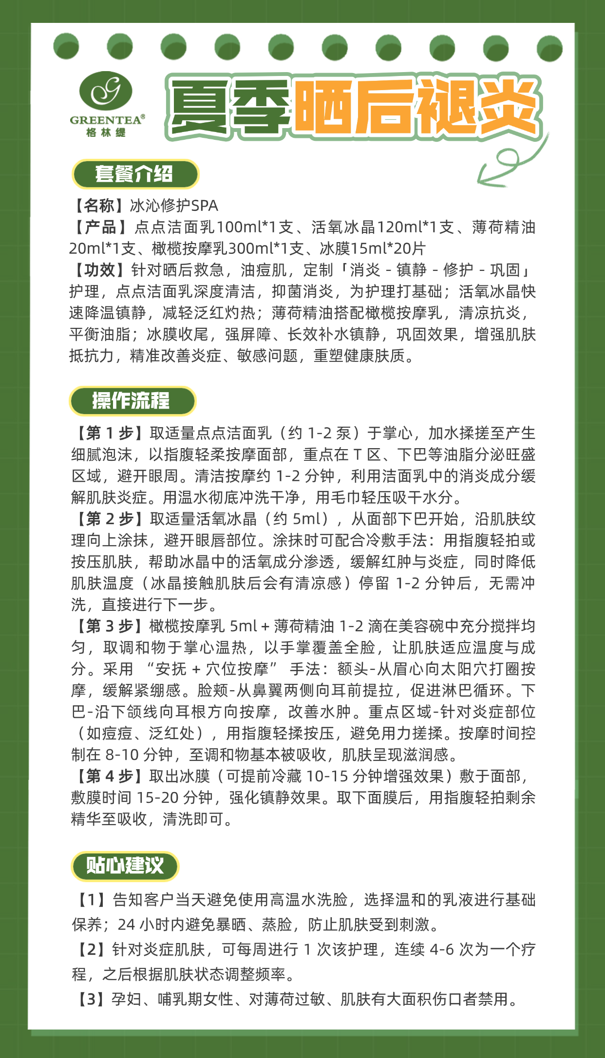 【冰沁修护SPA】点点洁面乳100ml*1支+活氧冰晶120ml*1支+薄荷精油20ml*1支+橄榄按摩乳300ml*1支+冰膜15ml*20片