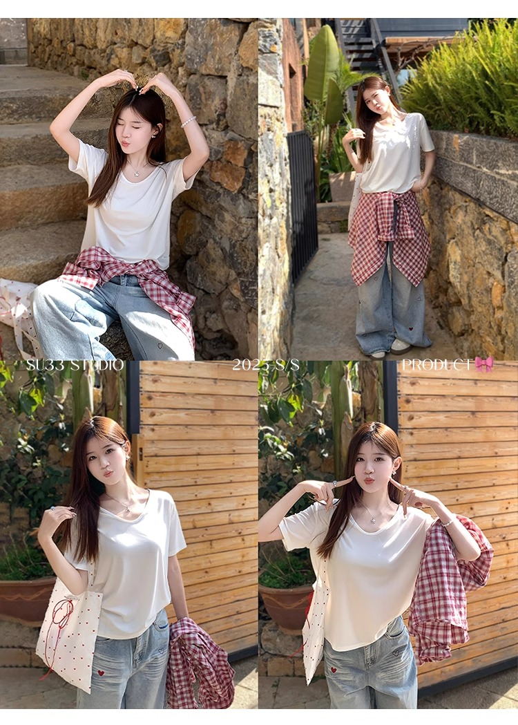 (鹅蛋领短袖T恤59元2件限时秒杀!拍2立减!时尚的尽头是极简风)短袖女t恤夏季2025新款V领宽松慵懒风大领口显瘦上衣