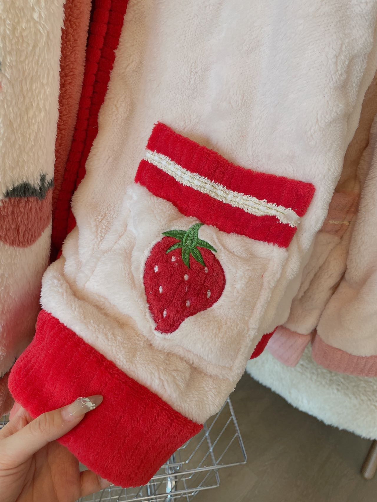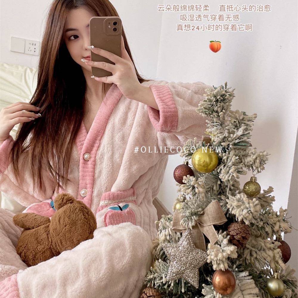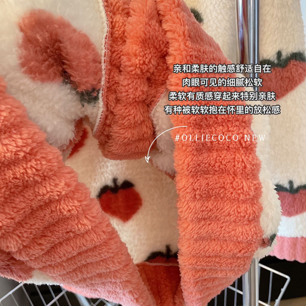 【透气保暖显瘦!家居服套装睡衣】耐用耐磨,深v款衣领,方便穿脱,草莓水蜜桃恋恋暖心睡衣女秋冬加厚保暖珊瑚绒开衫家居服套装睡衣