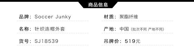 小李子:专柜正品Soccer Junky足球狗加绒针织连帽卫衣外套SJ18539