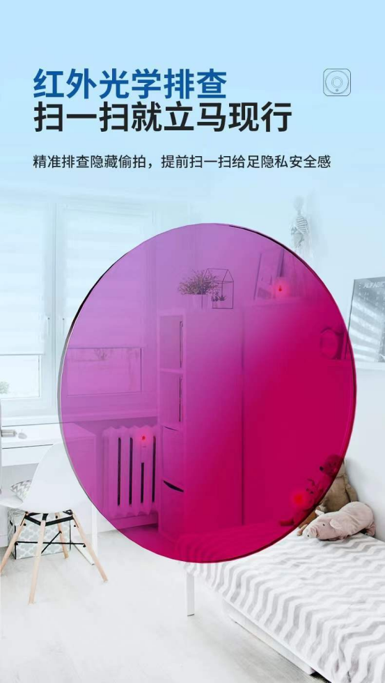 ding尖科技,隐私安全守护者 全方位探测,she像头无处可藏 LED强光灯珠,采用进口光学材料制成 具有高亮度和良好的透光性 能够精准捕捉到隐藏的she像头 配合特殊滤波镜片,过滤掉多余的光线 使得探测结果更加准确??离she像头越近,光点越亮 反光增强,更容易寻找 红外光学排查,扫一扫就立马现形