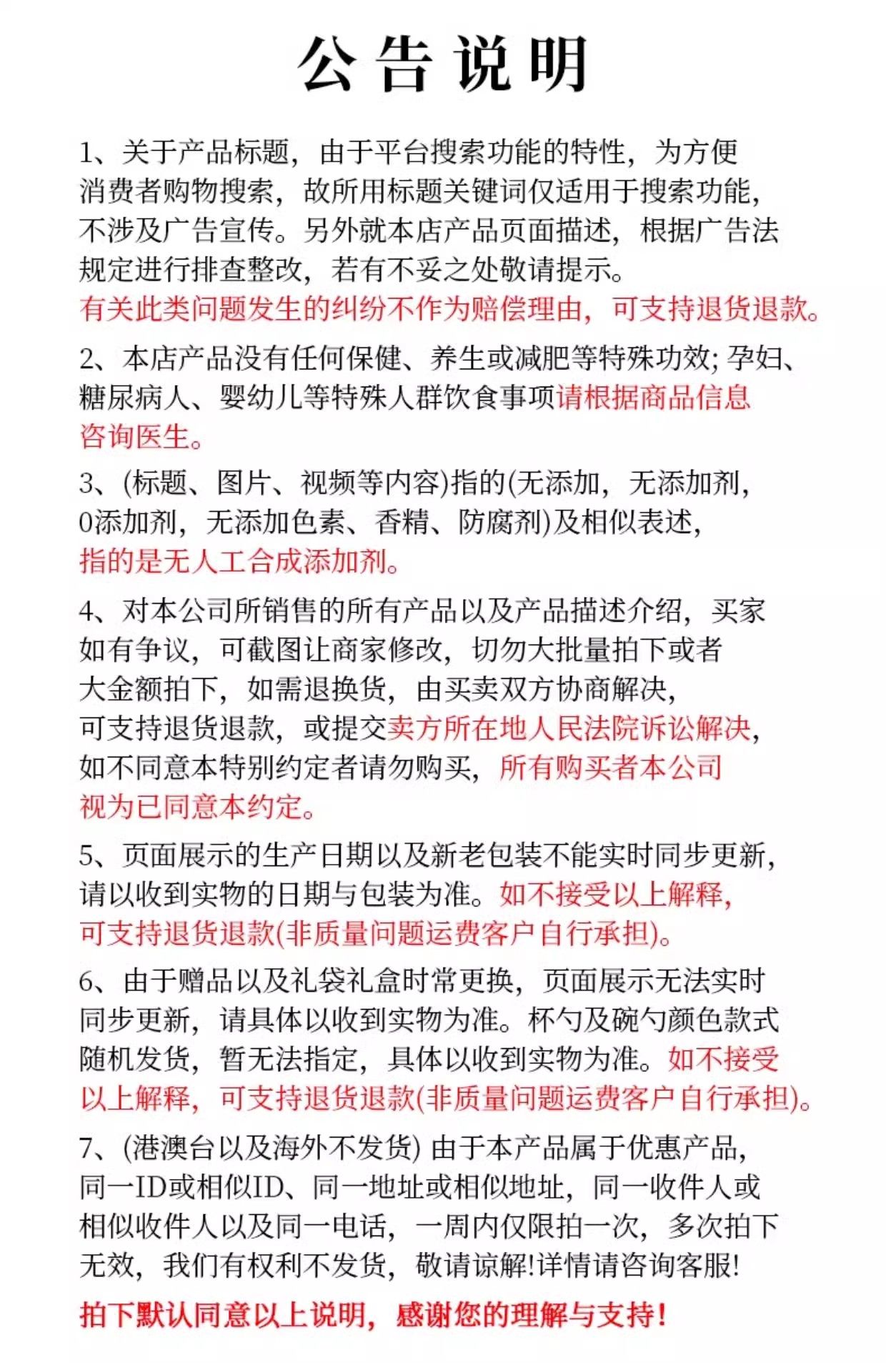 1、本产品食品下单后不支持7天无理由退换货,不支持拦截&拒收,执意要拦截拒收的需承担5元拦截或拒收的物流费,请您谨慎下单。