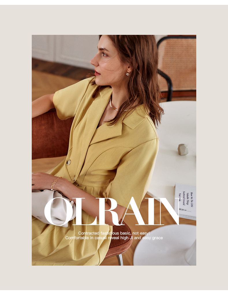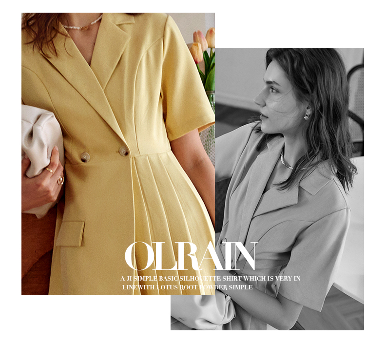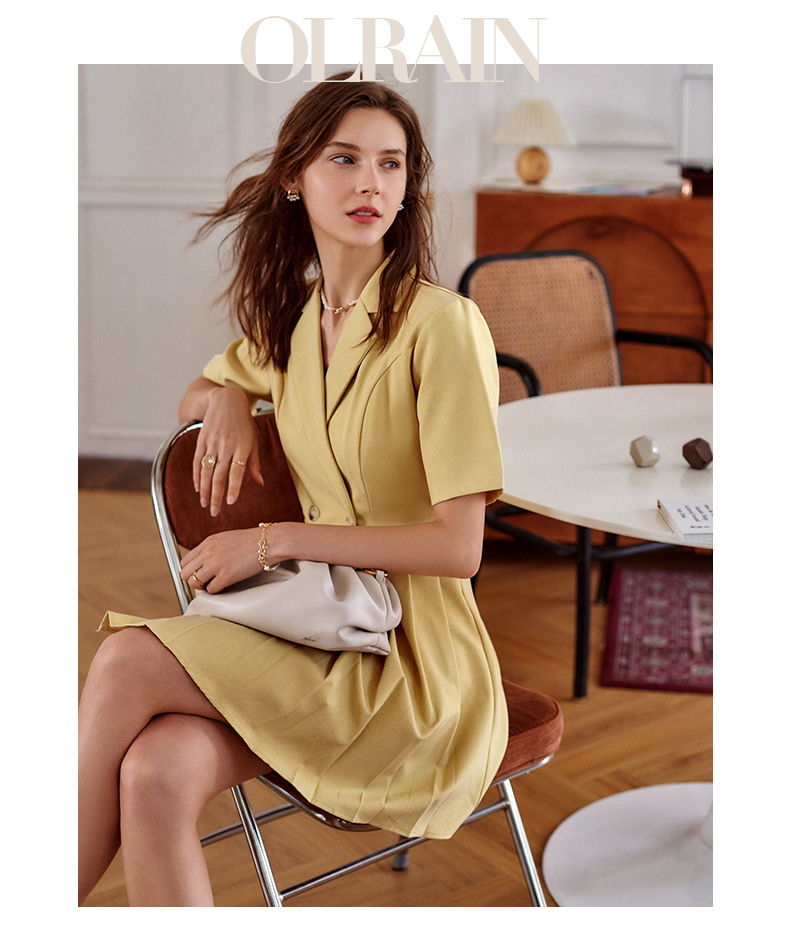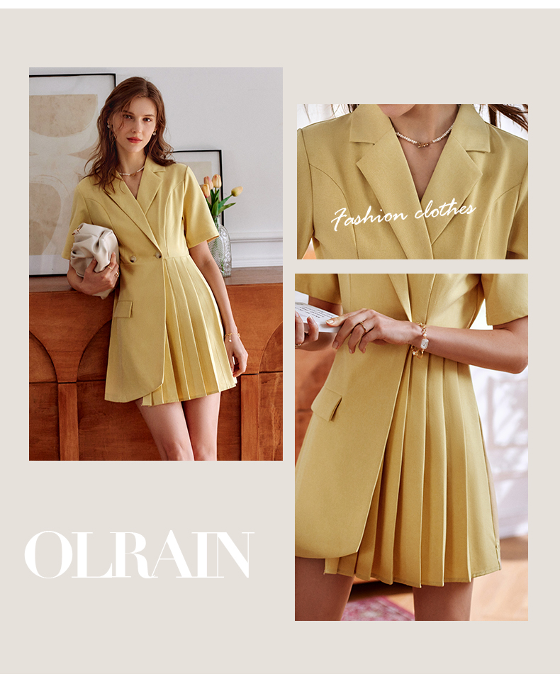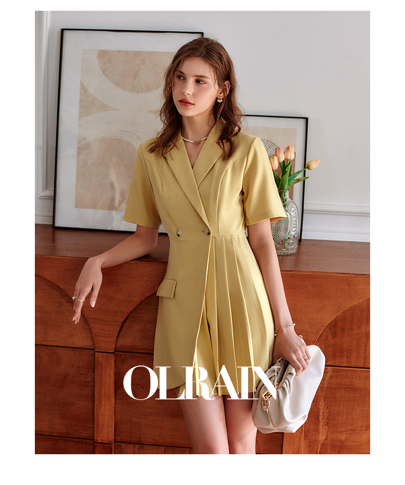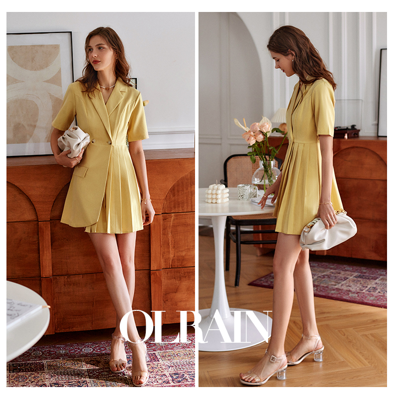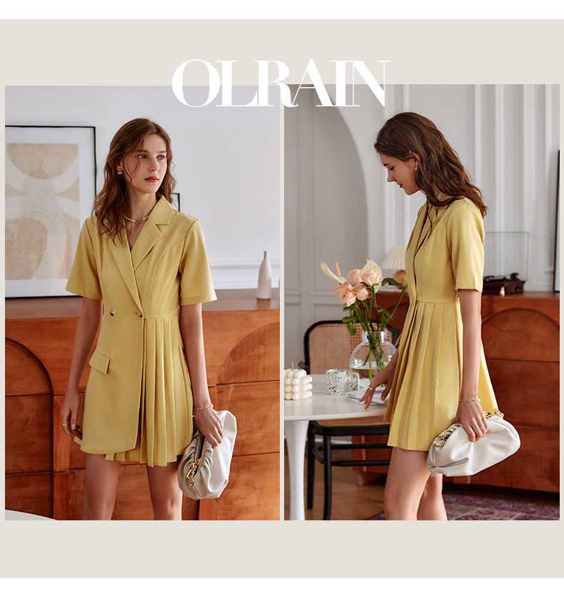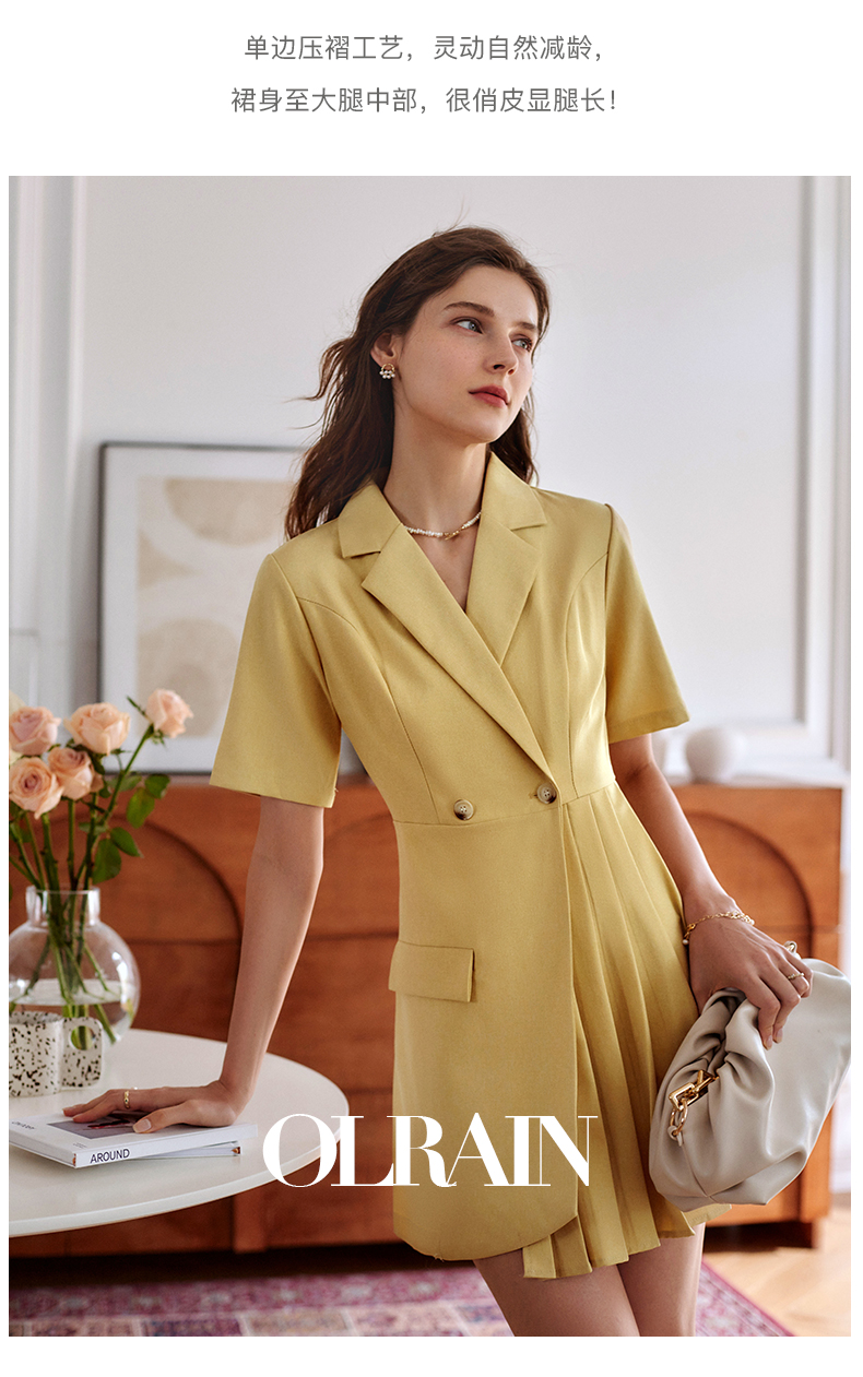 欧芮儿黄色连衣裙女2021新款收腰显瘦时尚不规则压轴西装式裙