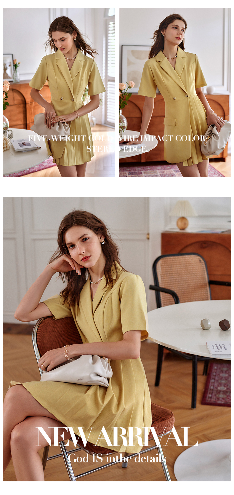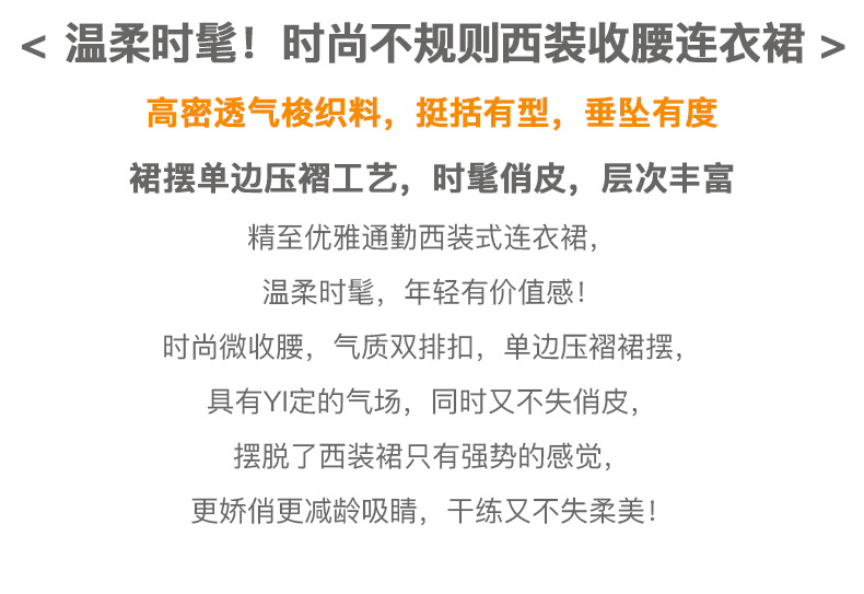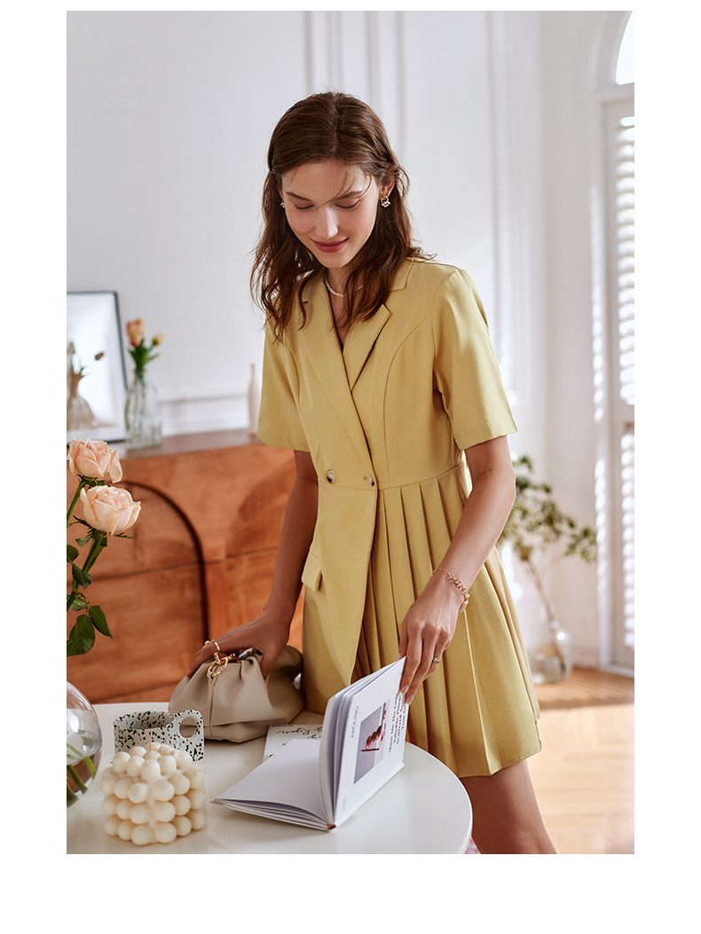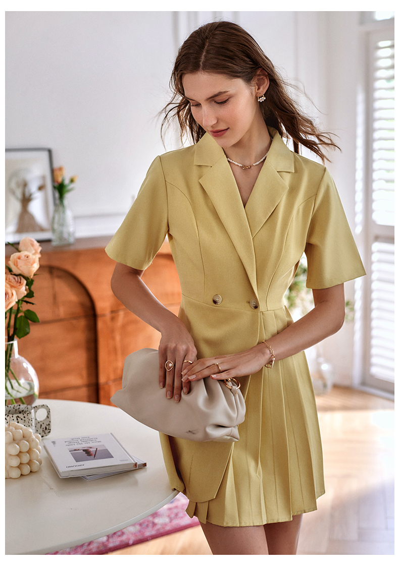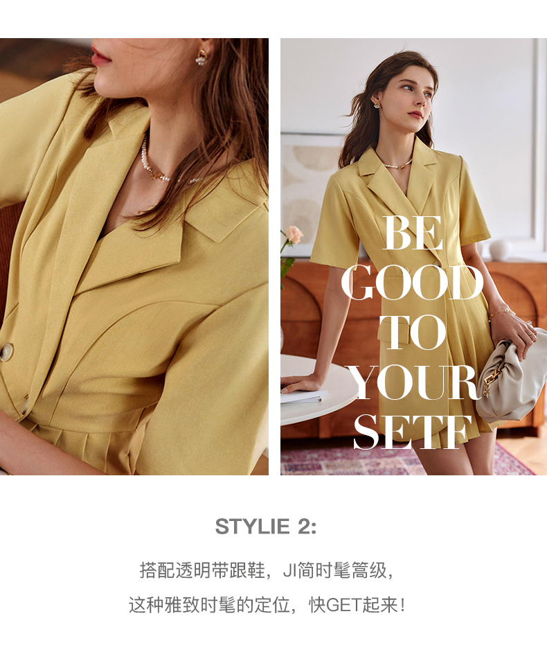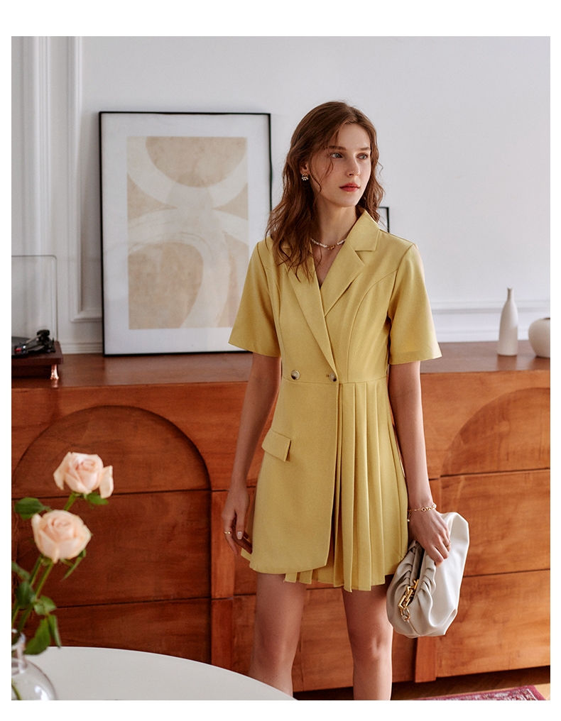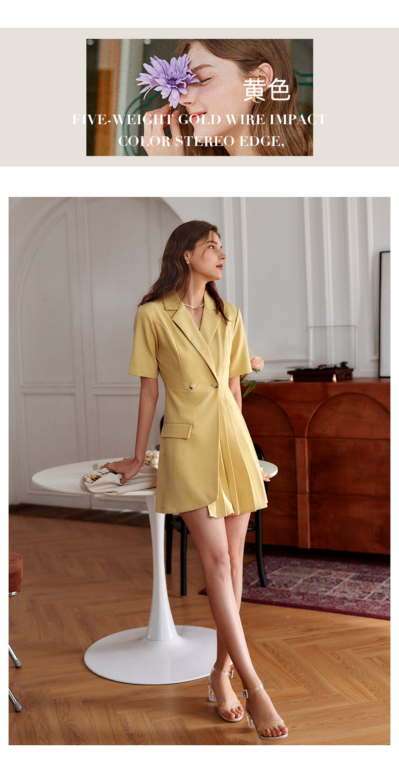 欧芮儿黄色连衣裙女2021新款收腰显瘦时尚不规则压轴西装式裙
