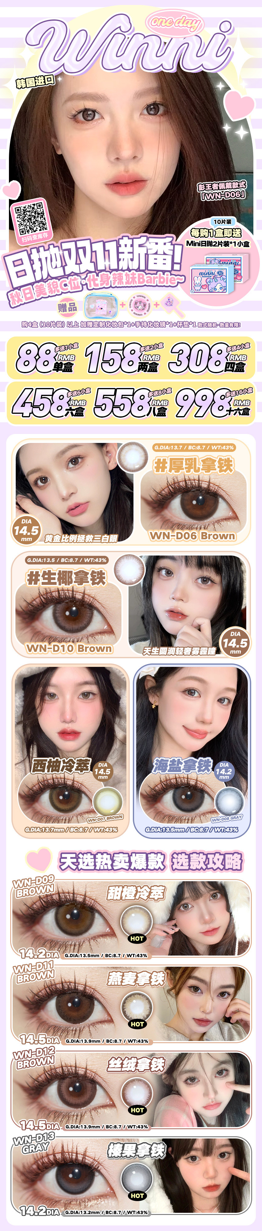 WINNI日抛双11活动·0-1000度(有525/575)·厚乳拿铁&西柚冷萃&海盐拿铁&甜橙冷萃&生椰拿铁&燕麦拿铁&丝绒拿铁&榛果拿铁·押金品牌