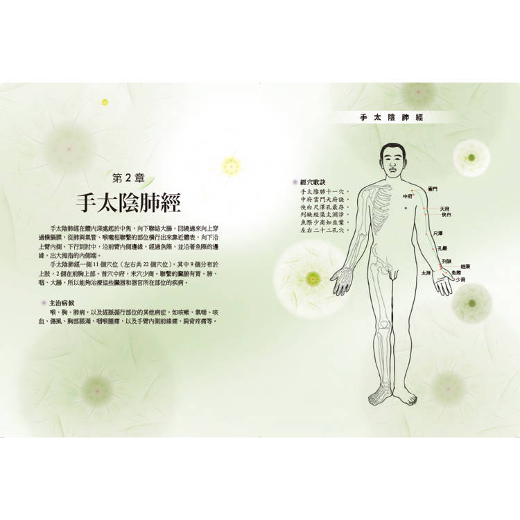 一側11個穴位,左右共22個穴位,分布於手部和前胸上部。首穴中府,末穴少商。