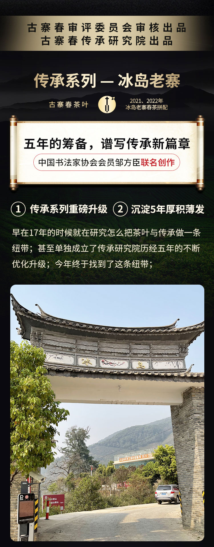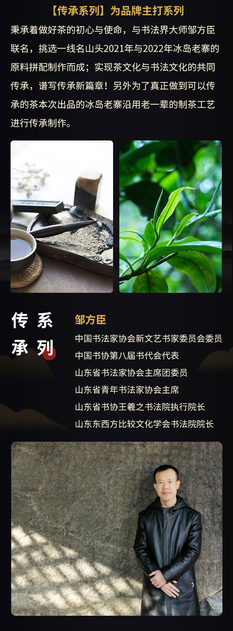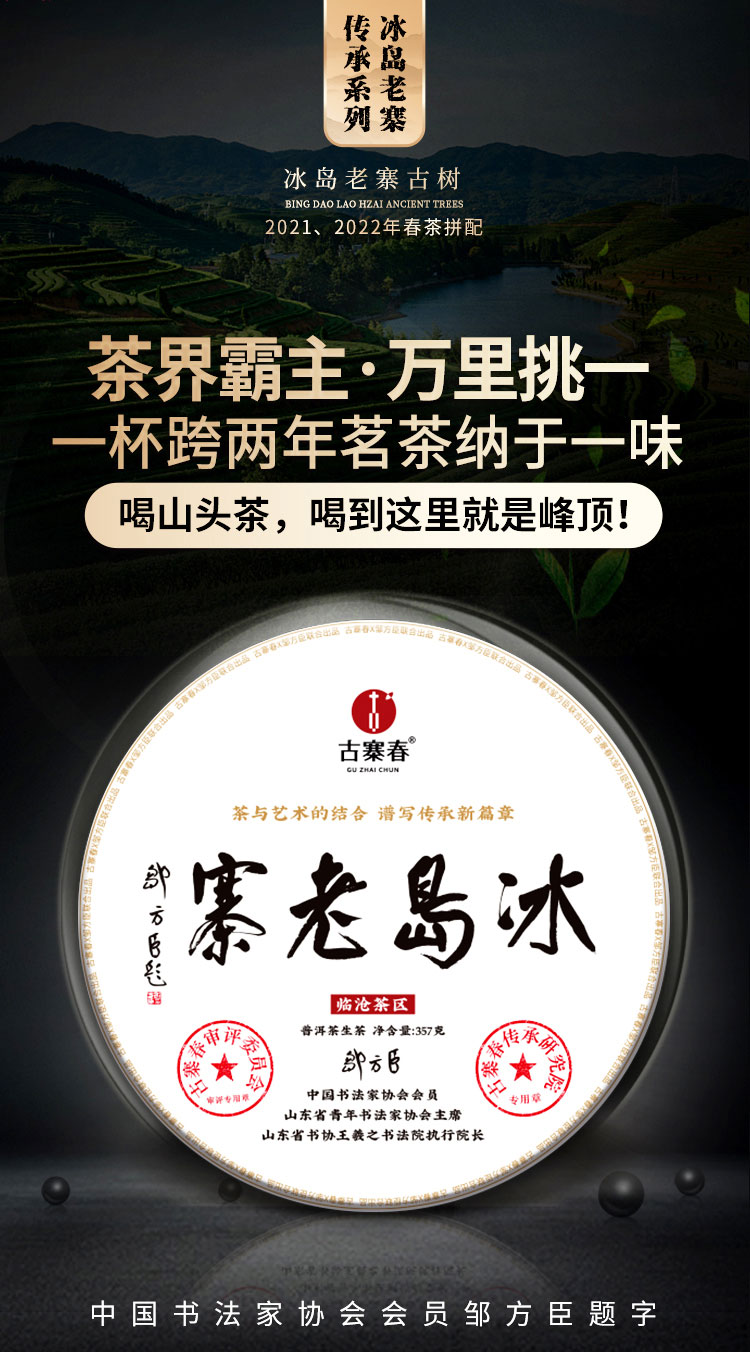 【冰岛老寨】书法大师邹方臣题字,2021年与2022年跨两年冰岛老寨拼配,一杯横跨两年,357克/饼