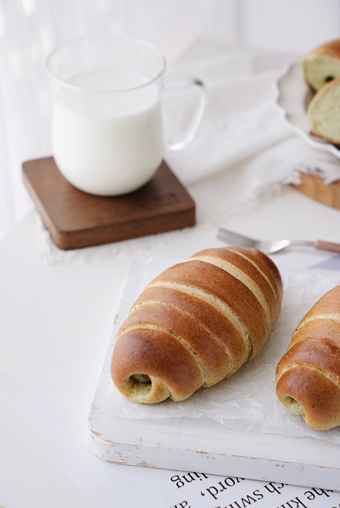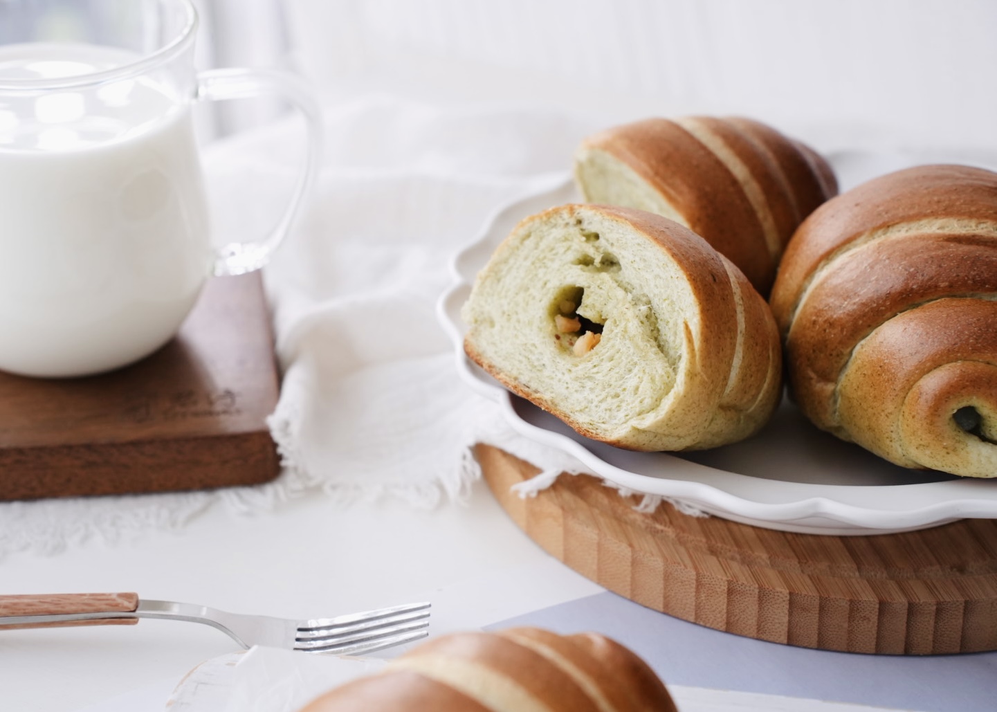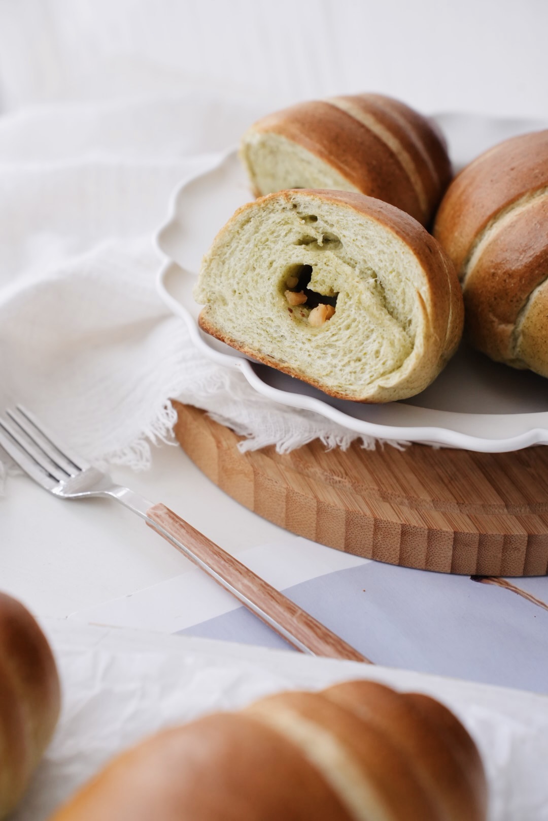 高筋面粉、酵母、糖、盐、奶粉、淡奶油、炼乳、黄油,苔菜粉,巴旦木,麻薯