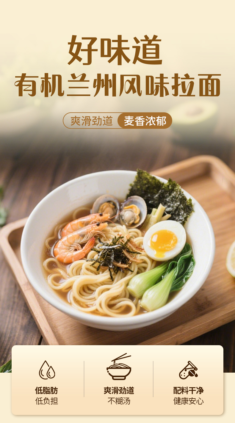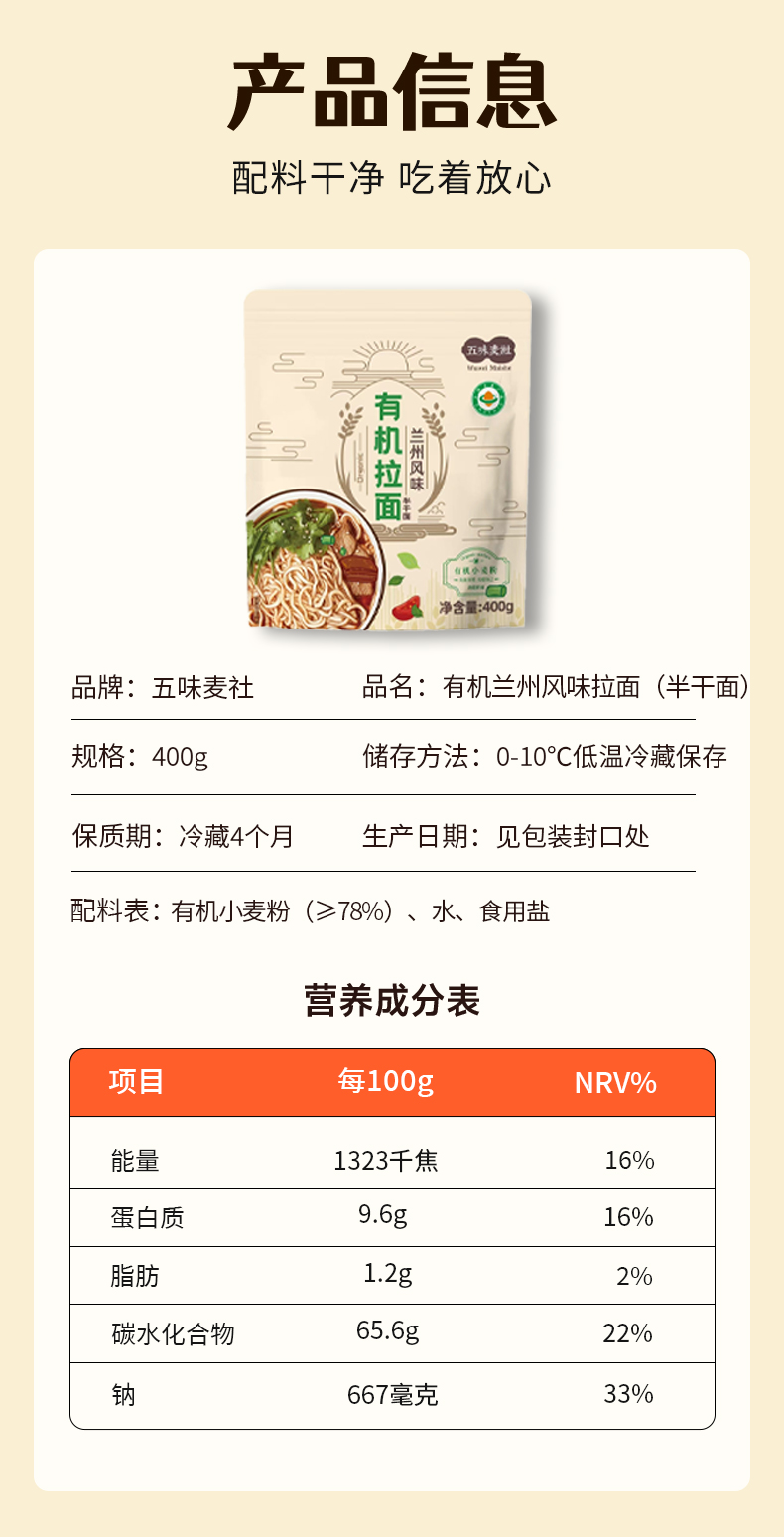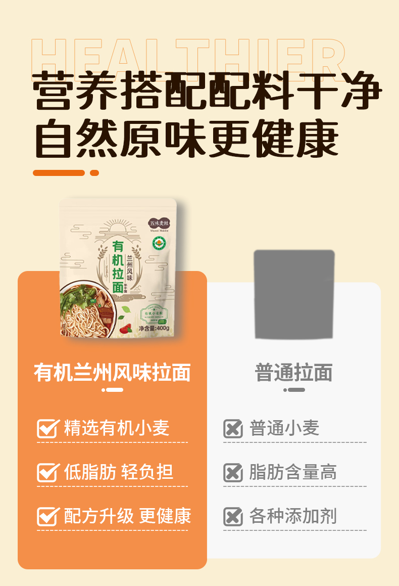 【有机食品认证口感爽滑】五味麦社有机兰州拉面400g*4袋