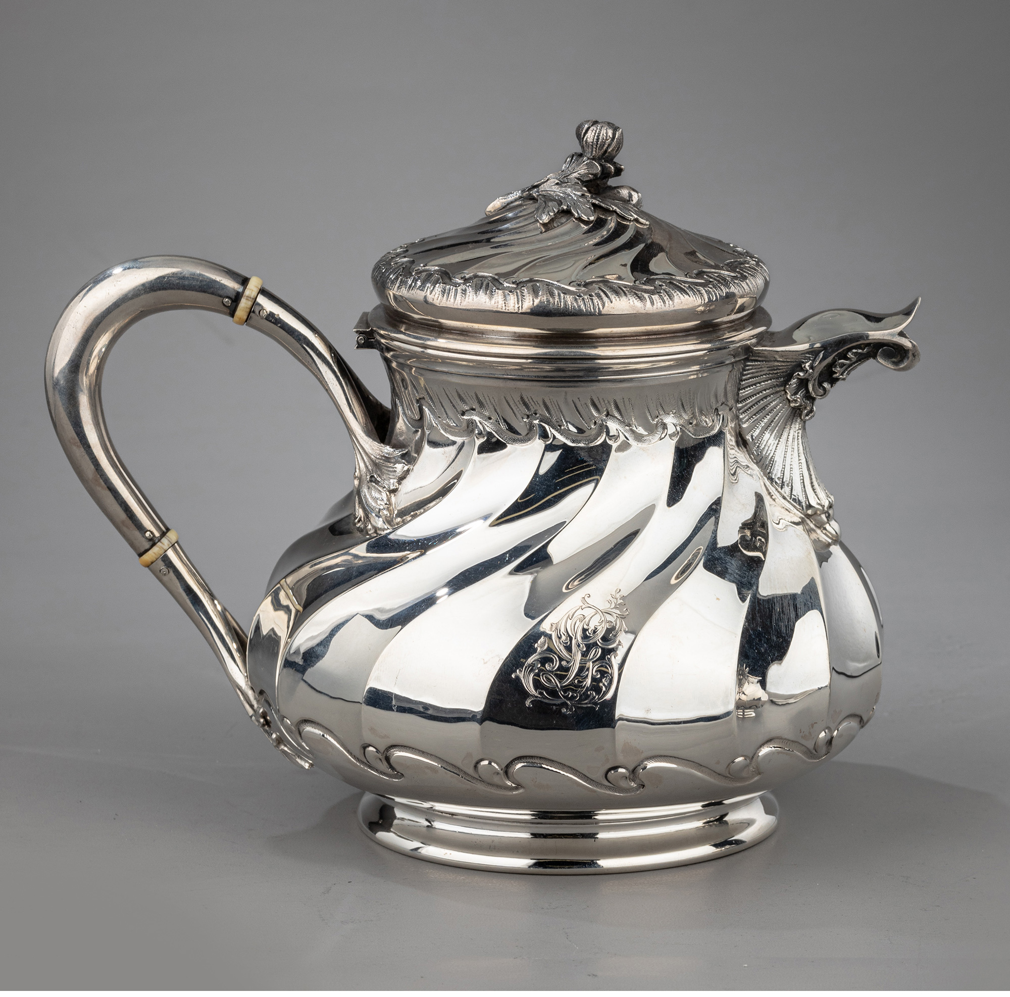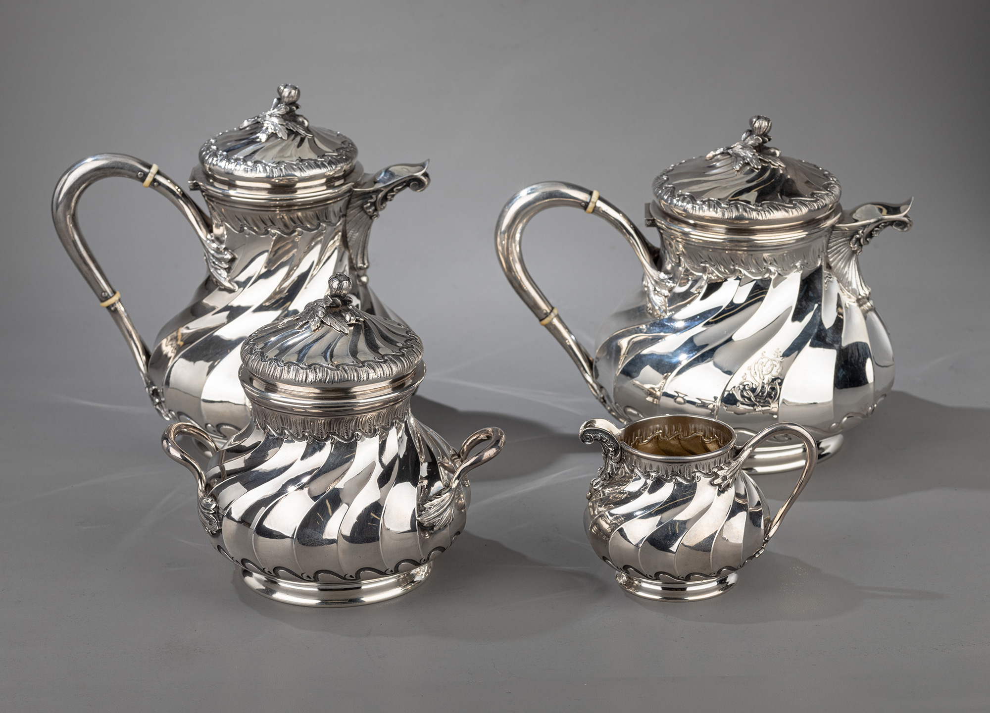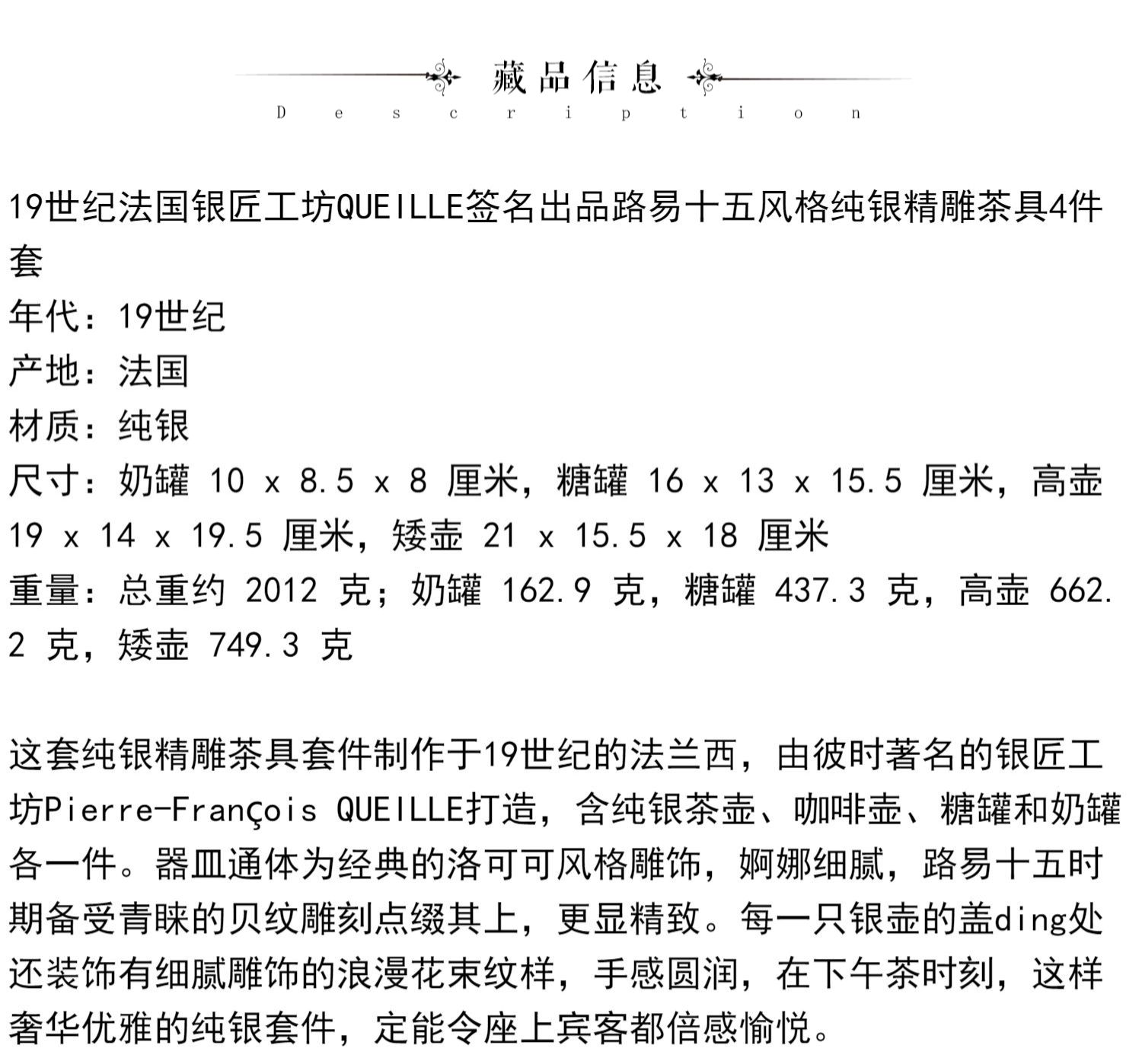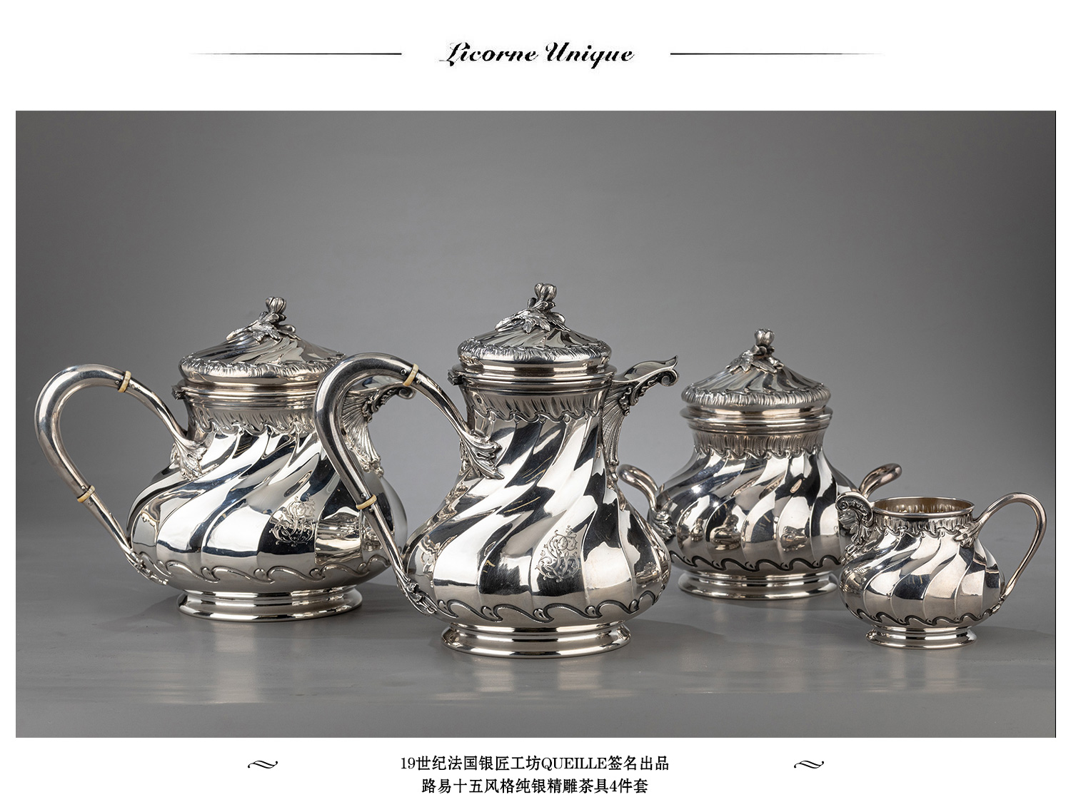 独角鹿西洋古董银匠工坊QUEILLE签名路易十五风纯银精雕茶具4件套