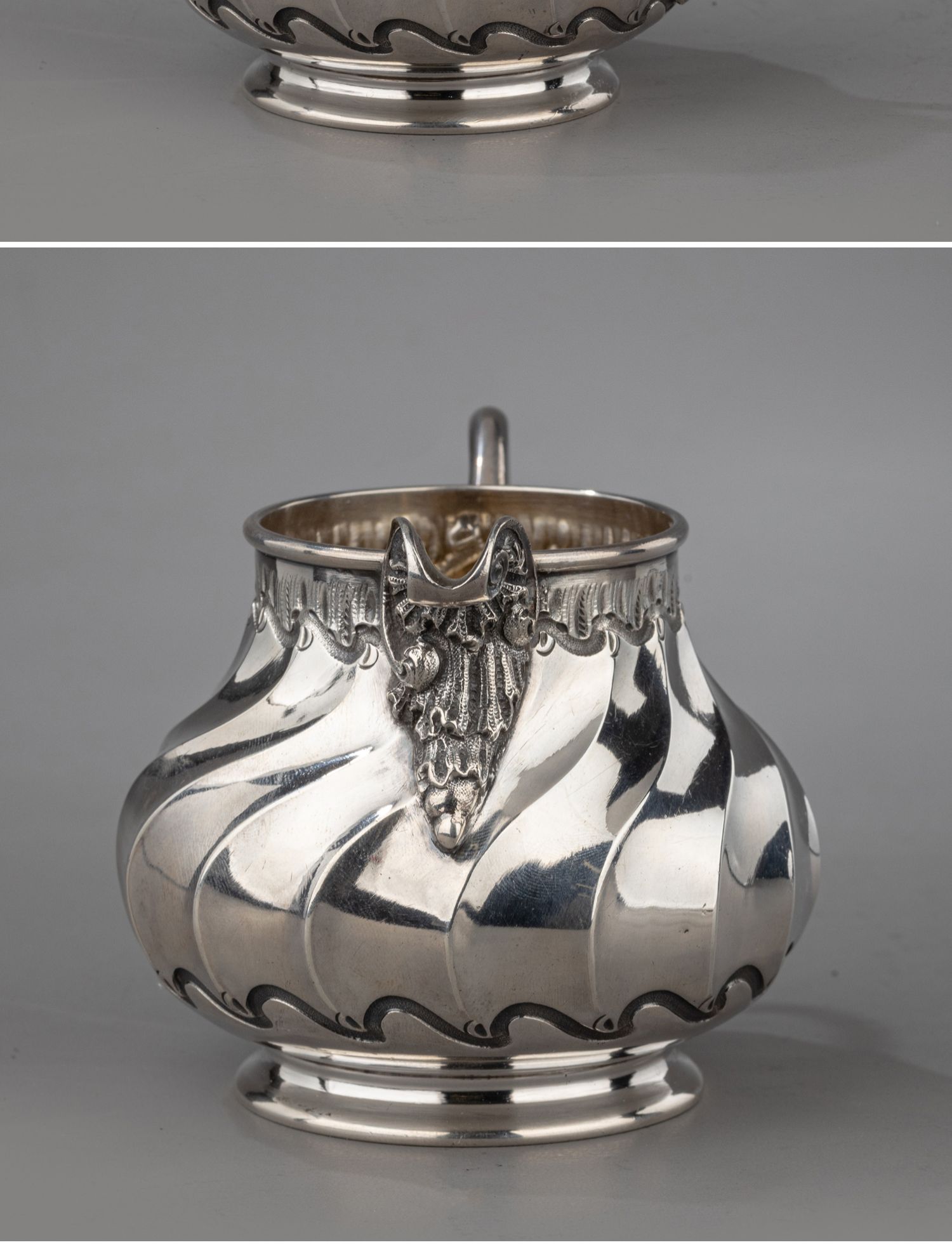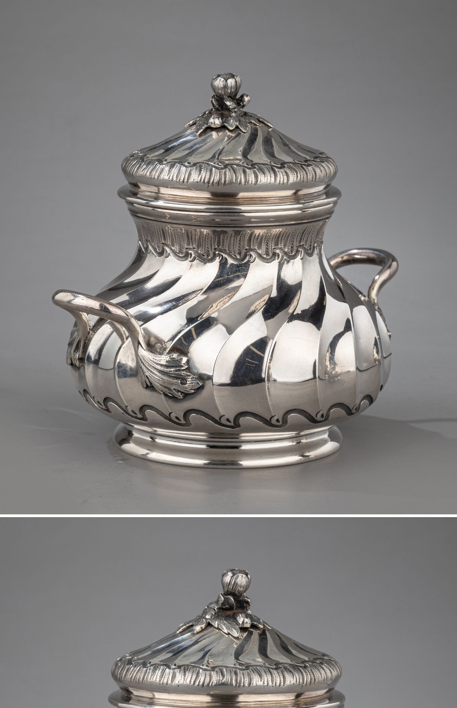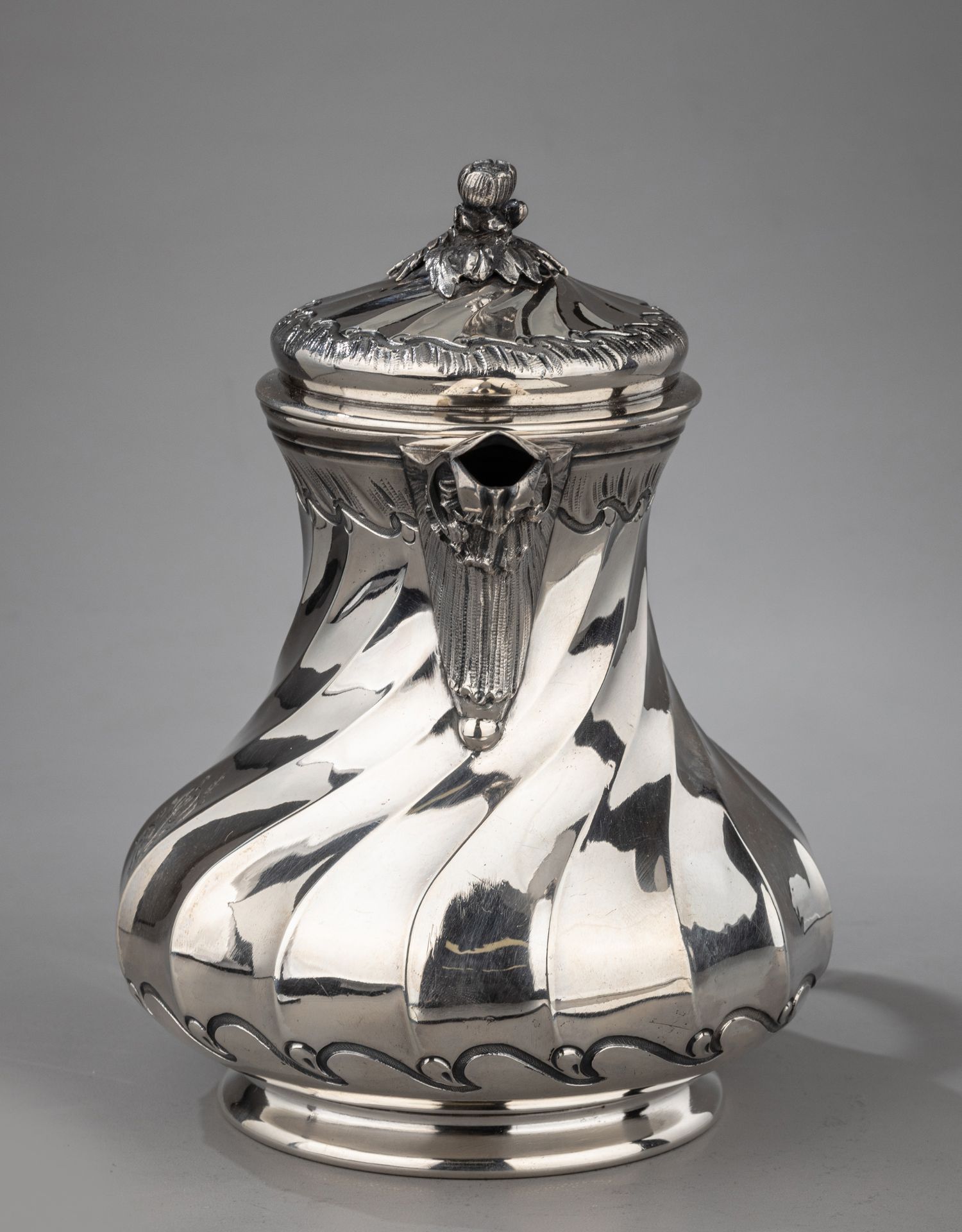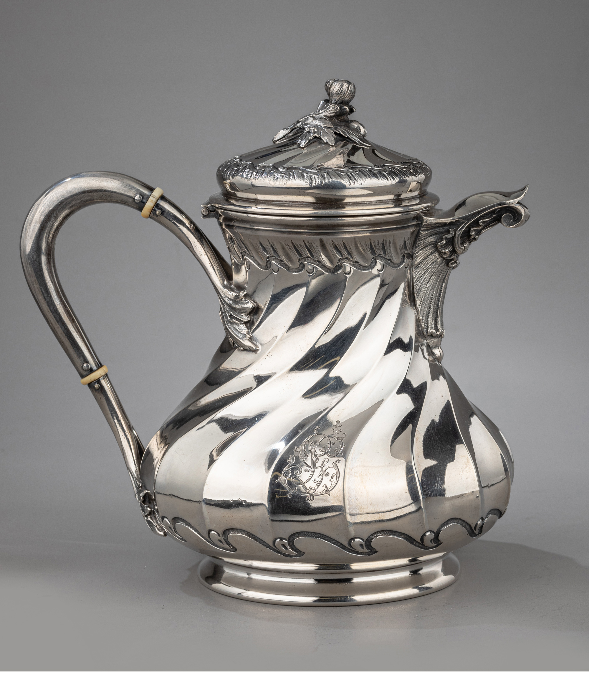 独角鹿西洋古董银匠工坊QUEILLE签名路易十五风纯银精雕茶具4件套