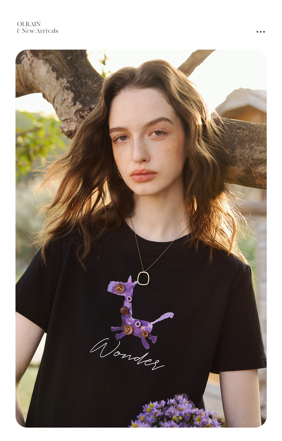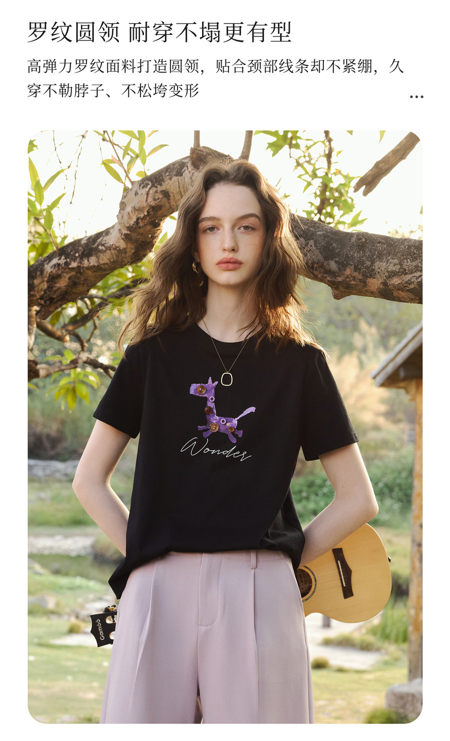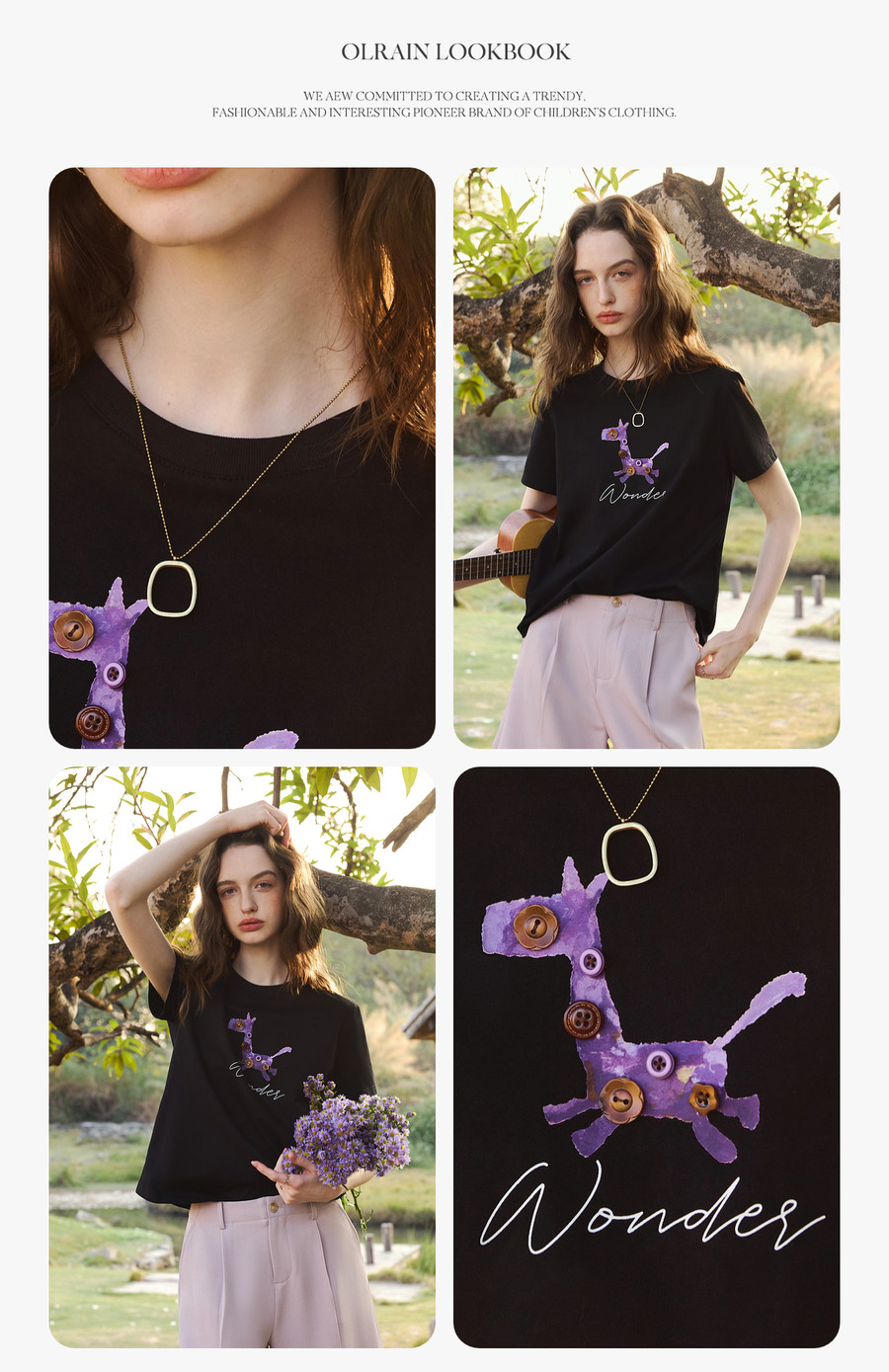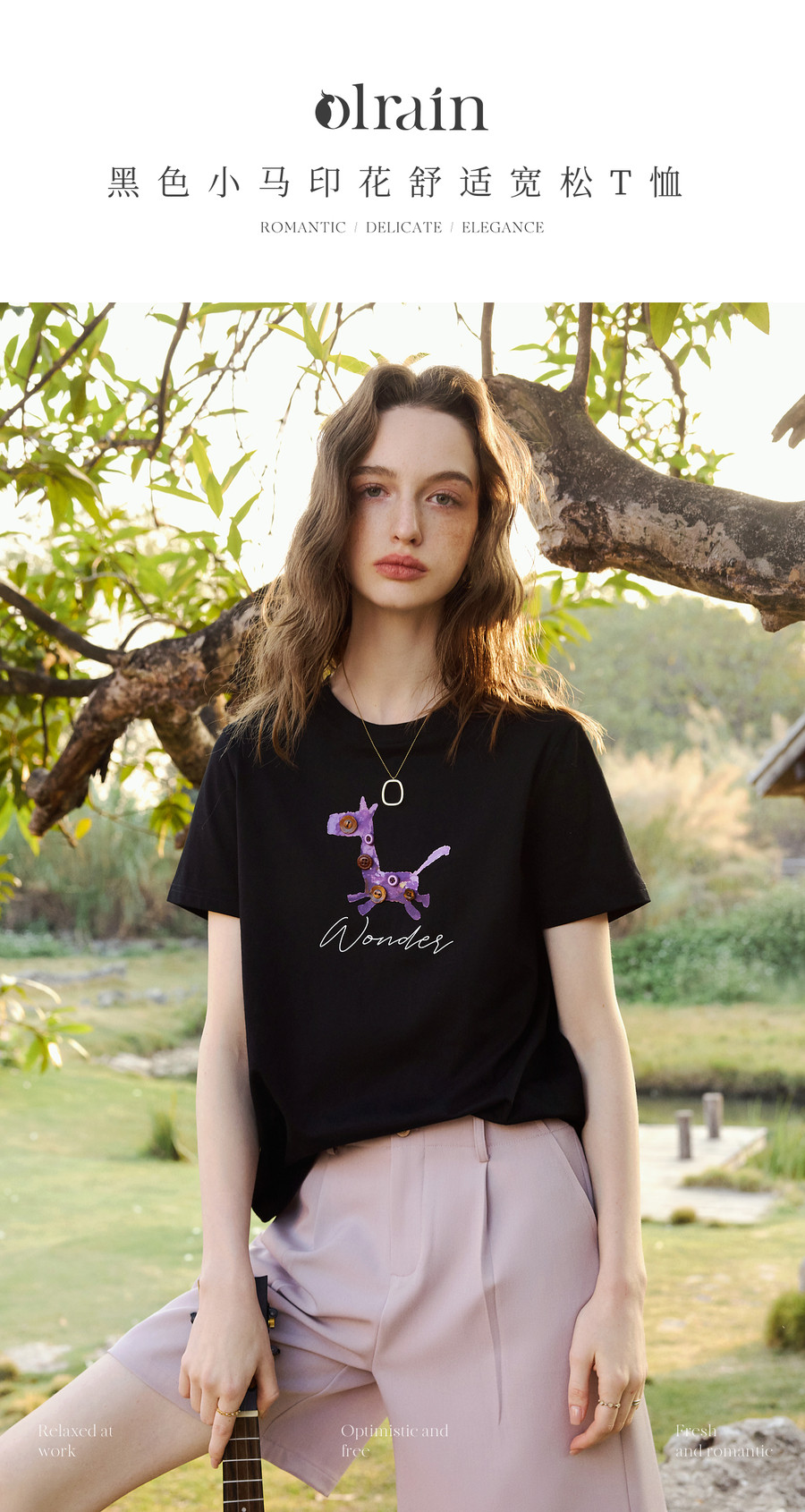 欧芮儿通勤休闲纯棉黑色小马印花短袖T恤女夏季2026新款圆领上衣