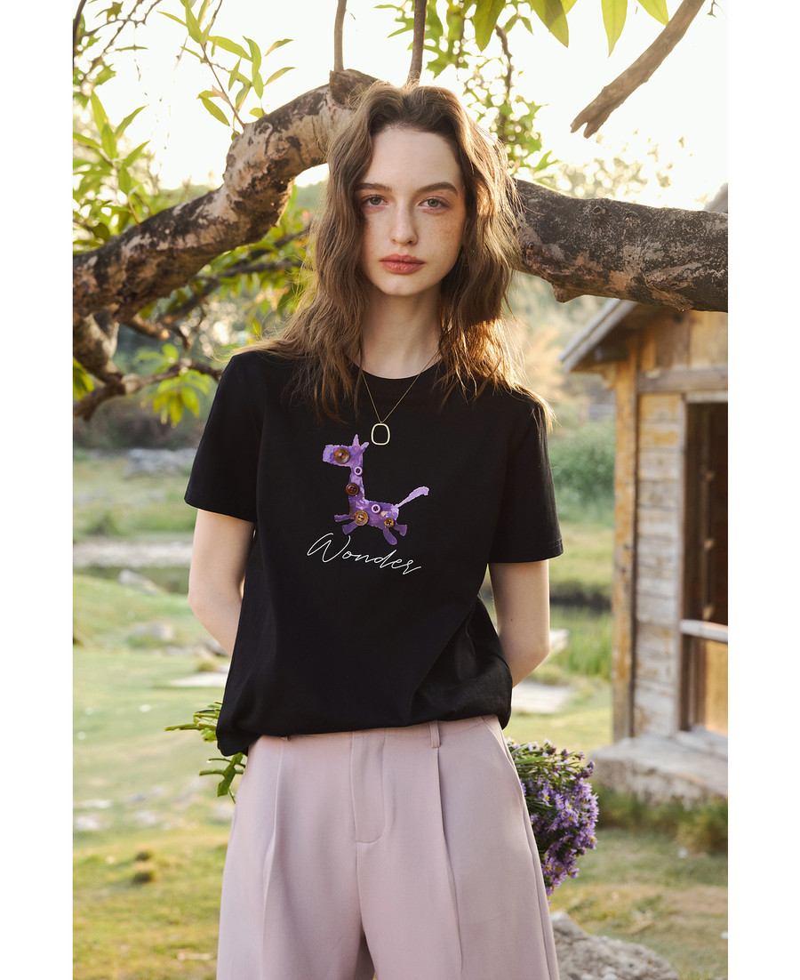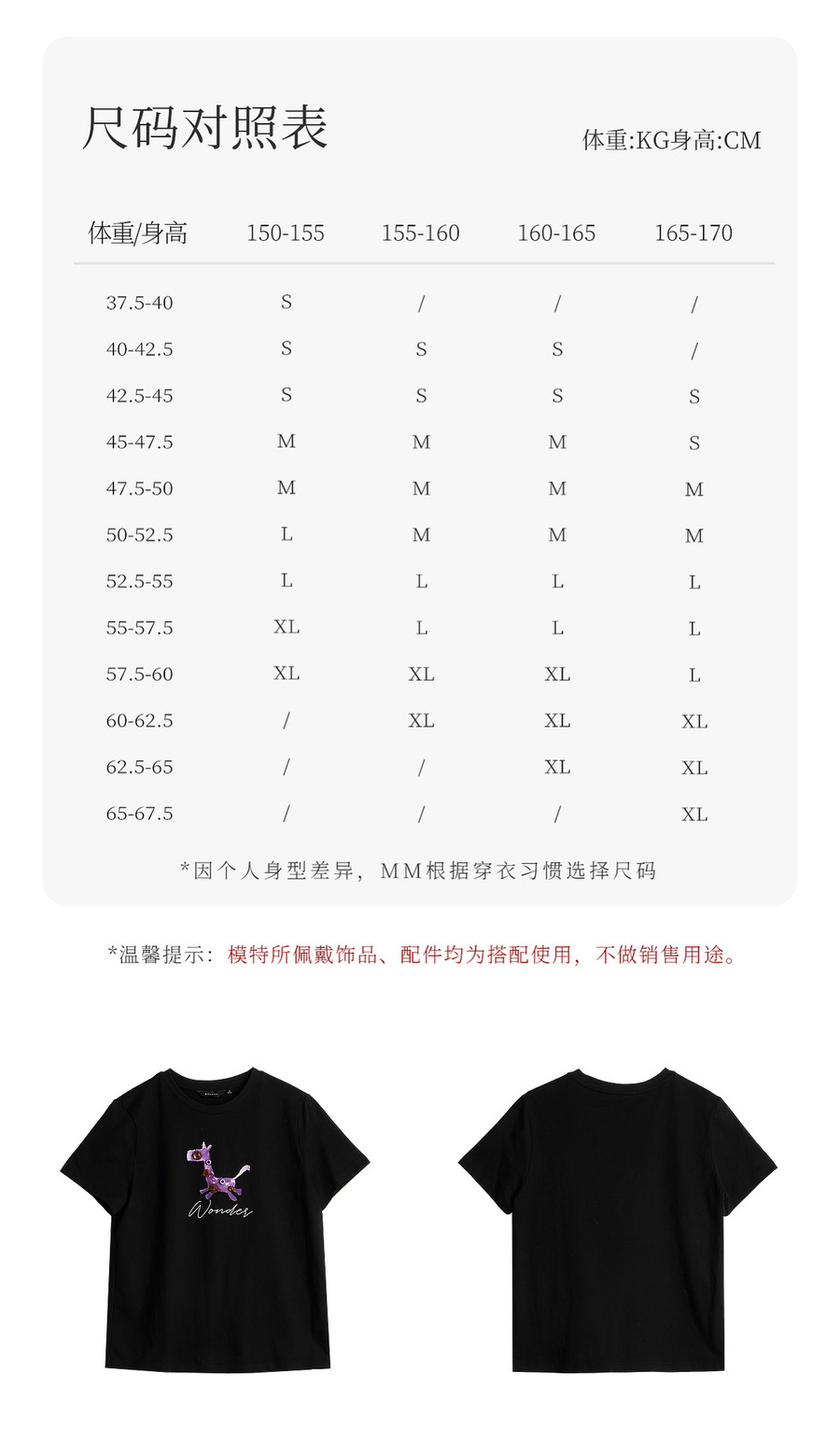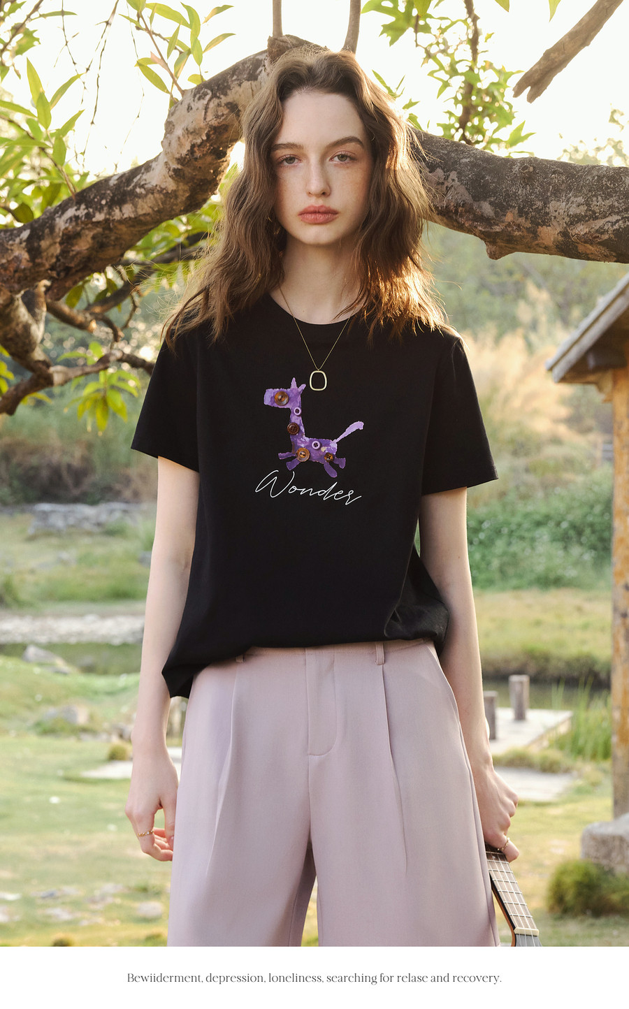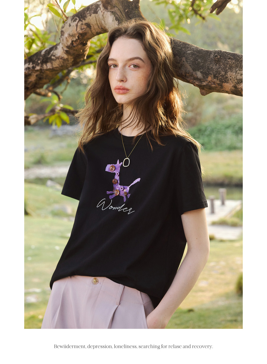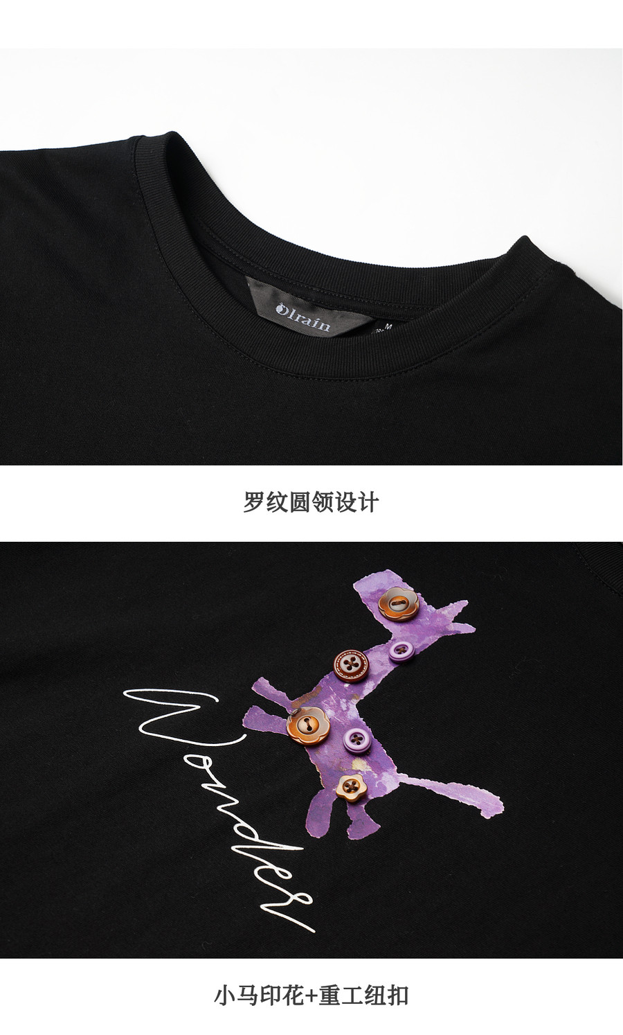 欧芮儿通勤休闲纯棉黑色小马印花短袖T恤女夏季2026新款圆领上衣