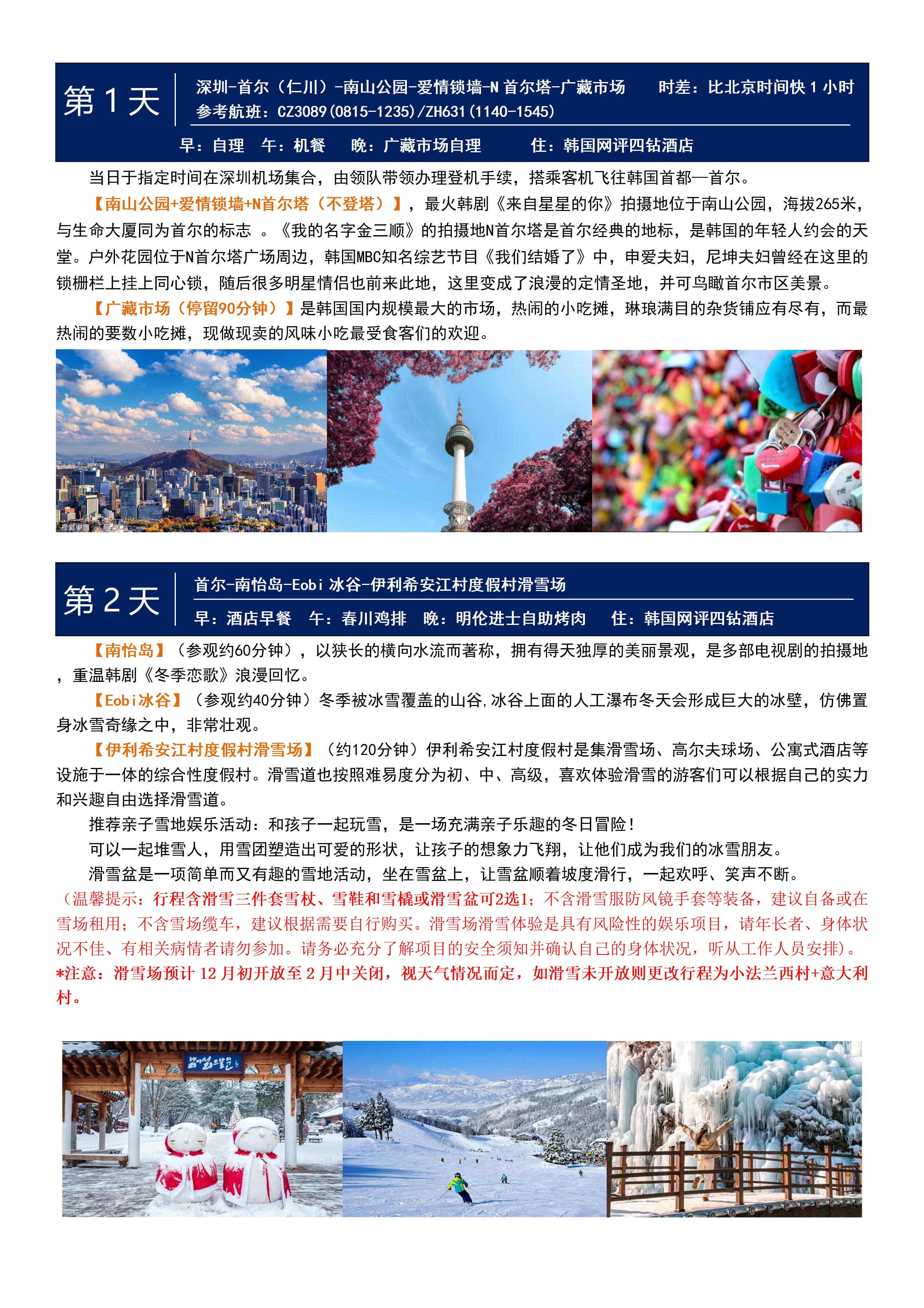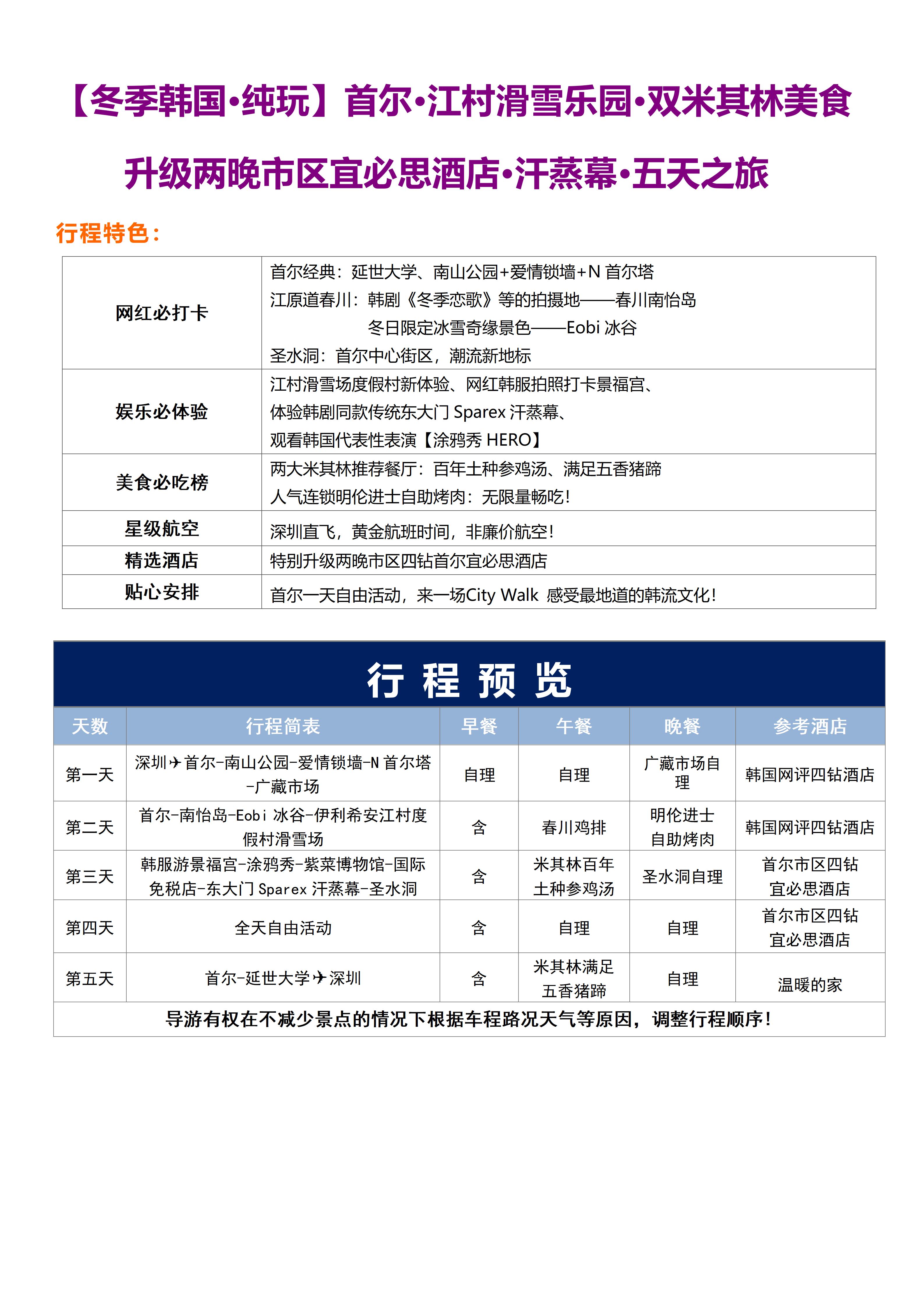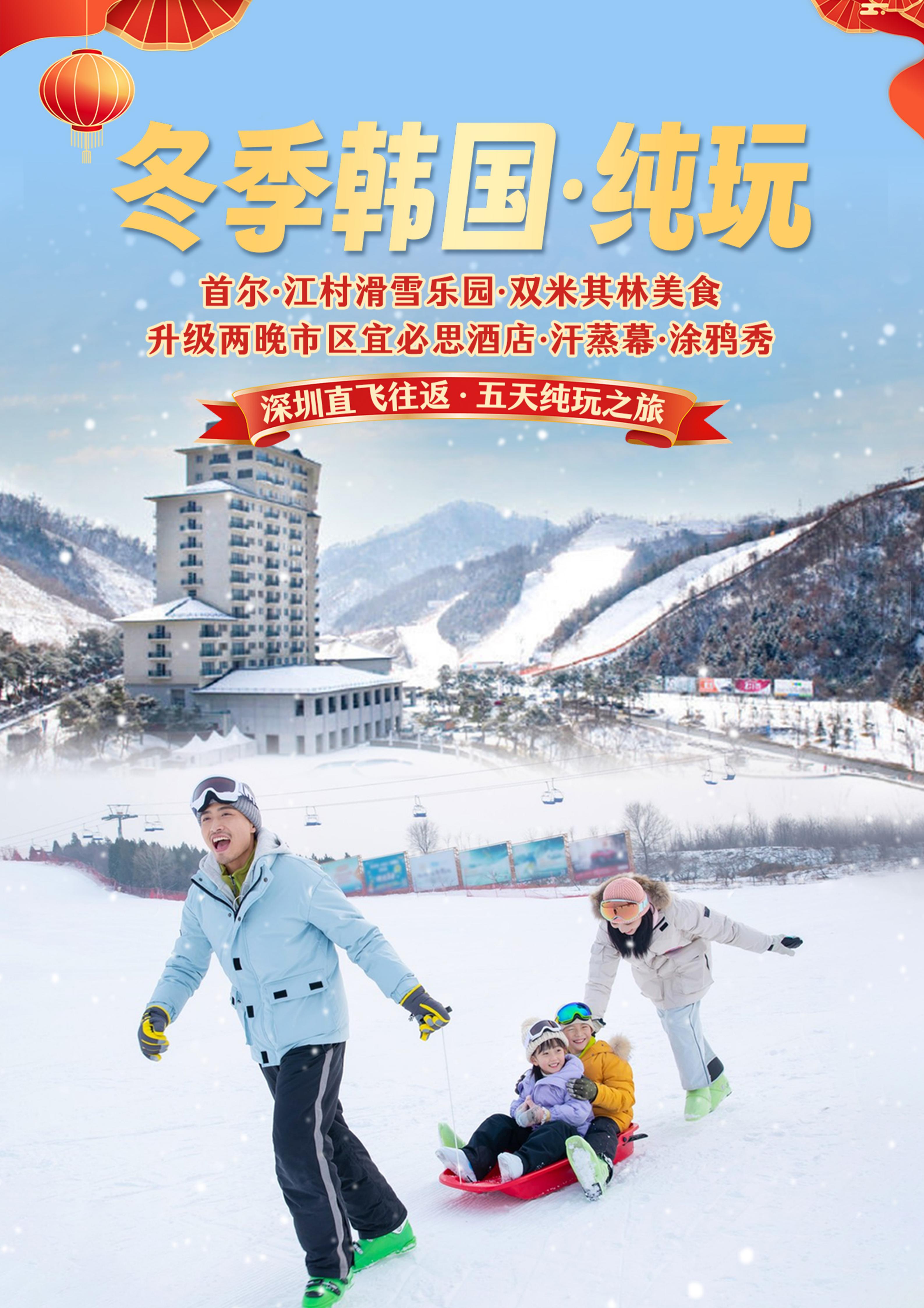 【春节、寒假】<韩国首尔5天-深圳直飞往返>江村滑雪场度假村、韩服拍照打卡景福宫、东大门Sparex汗蒸、涂鸦秀HERO、南怡岛、Eobi冰谷、延世大学、南山公园+爱情锁墙+N首尔塔