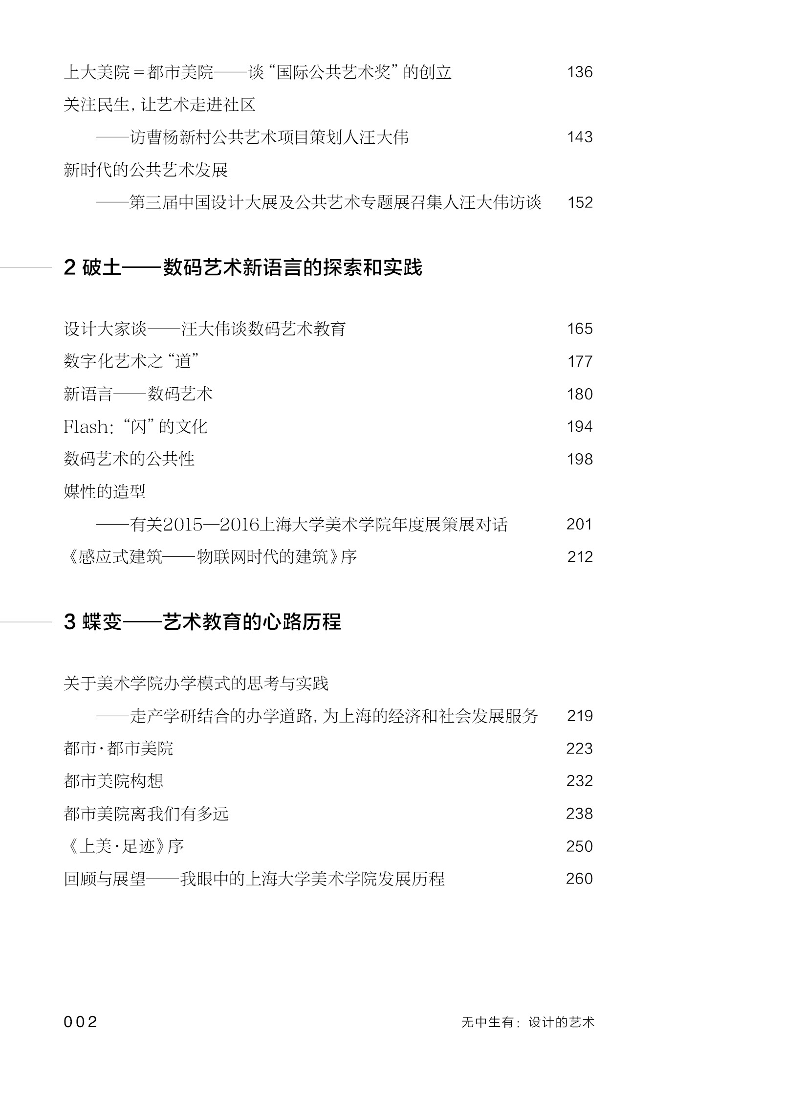 在《无中生有》中,汪大伟将其在上海大学美术学院工作40年的艺术教育、设计研究、教学管理加以梳理总结,并与读者分享。以“无中生有:设计艺术”为话题,一是对其在上海大学美术学院以当家人的身份主持美院全面工作26年,管理和参与上海大量的国家、社会、企业、民间设计项目的体会和总结;二是从上海的发展看全国的设计趋势,提出个人的认识和建议供读者讨论,以慰改革开放成长起来的设计工作者对事业热爱的赤诚之心。
