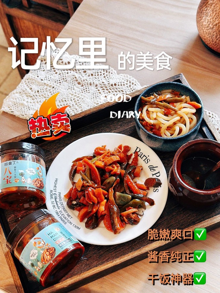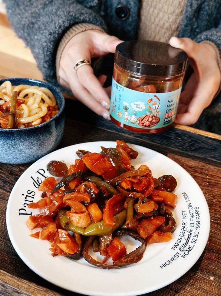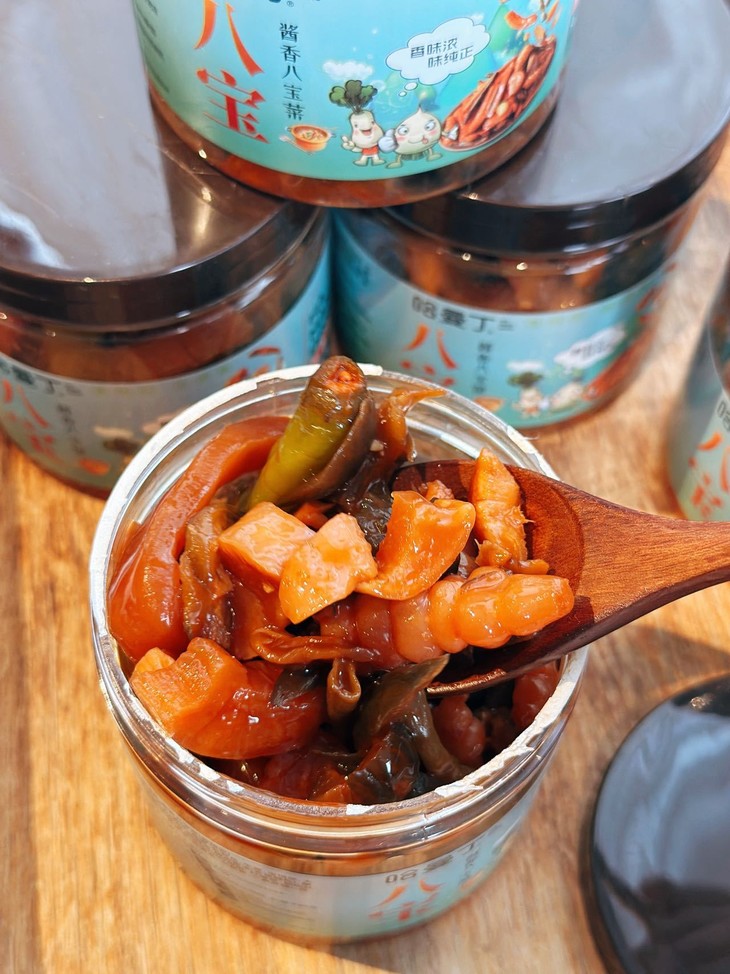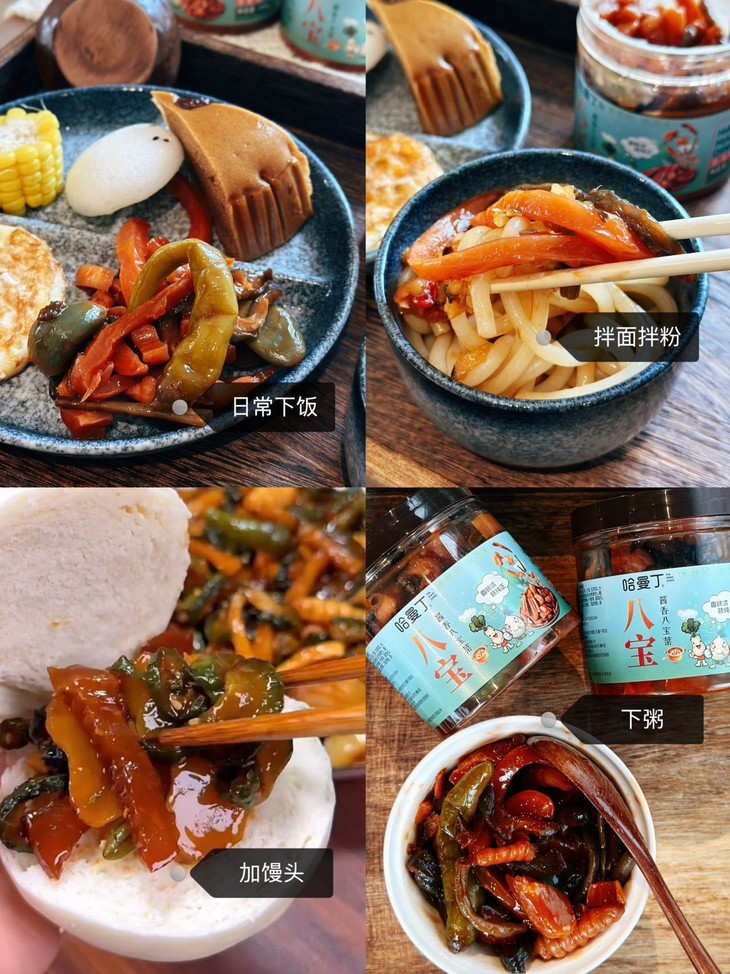 酱八宝就是拯救味蕾的 “神器”。煮一碗白米饭,舀两勺酱八宝铺在饭上,用勺子拌匀 米饭裹满酱汁,咸香入味,连吃两碗都不觉得腻 煮一碗清汤面,捞出来后拌上酱八宝 不用额外加调料,面条瞬间变得酱香浓郁,比外卖的拌面还要好吃
