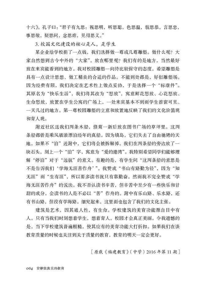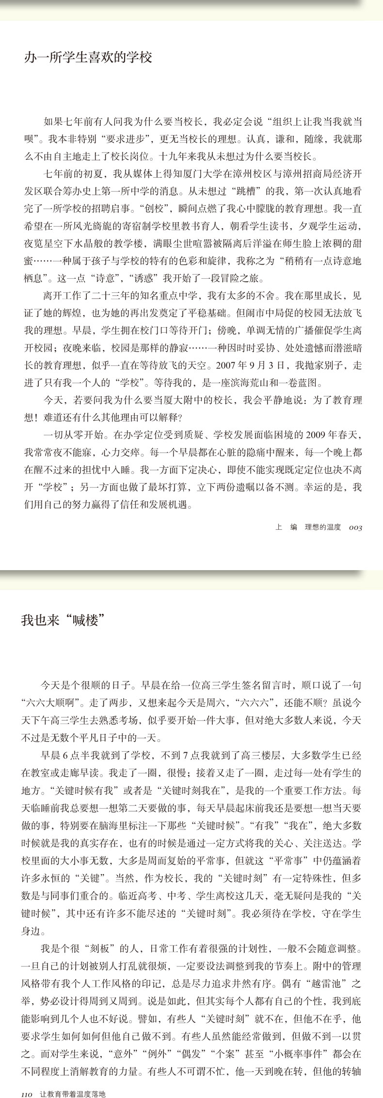 本书作者系厦门大学附属学校创校校长,自担任校长以来,共撰写了400多篇博文,大量被多家媒体选登,引起不小的反响,现从中选择数十篇汇集成册出版。本书大多从脉动的学校生活入手,见微知著,处处可见作者的功力。本书思想和文采兼具,对广大教师和教育研究者颇有启迪。