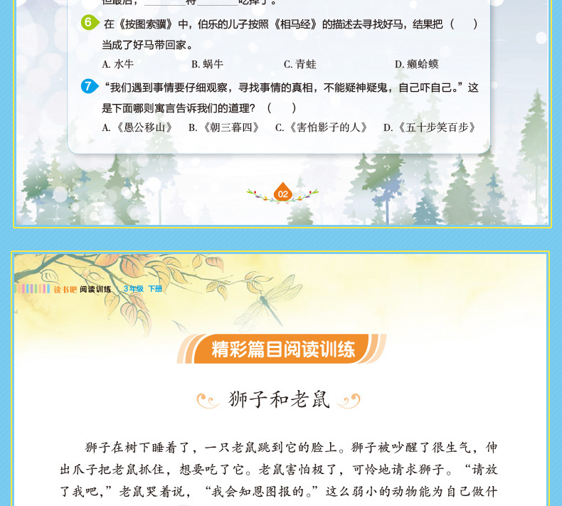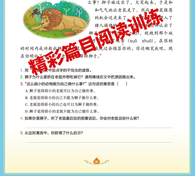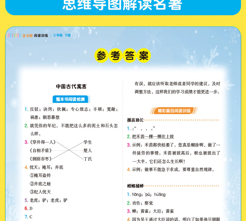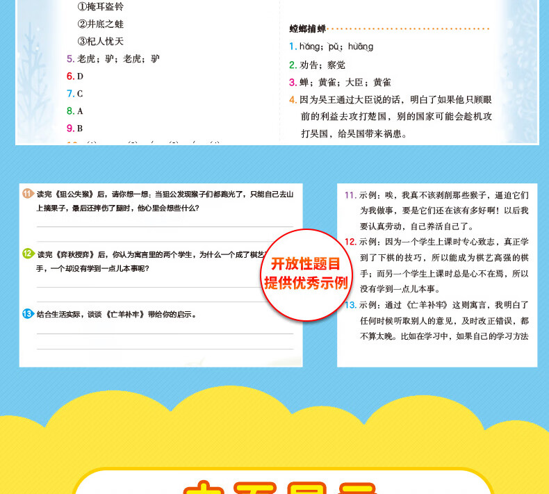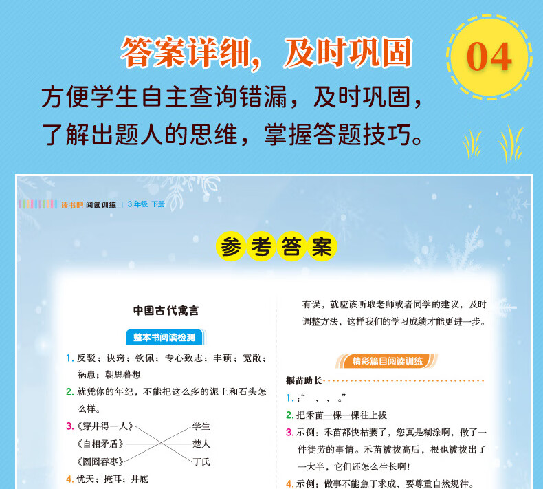 答案详解在对照答案中巩固知识有问必有答,用详尽的答案来检测阅读成果,拾遗补缺,使进步落到实处。多样化的答案,培养孩子的发散性思维和综合运用语言文字的能力。除了可以自主查询错漏,还能从答案入手,了解出题人的思维!详尽的答案,让孩子在对照答案中巩固知识,夯实基础,全面攻克疑难重点,提升应试能力。