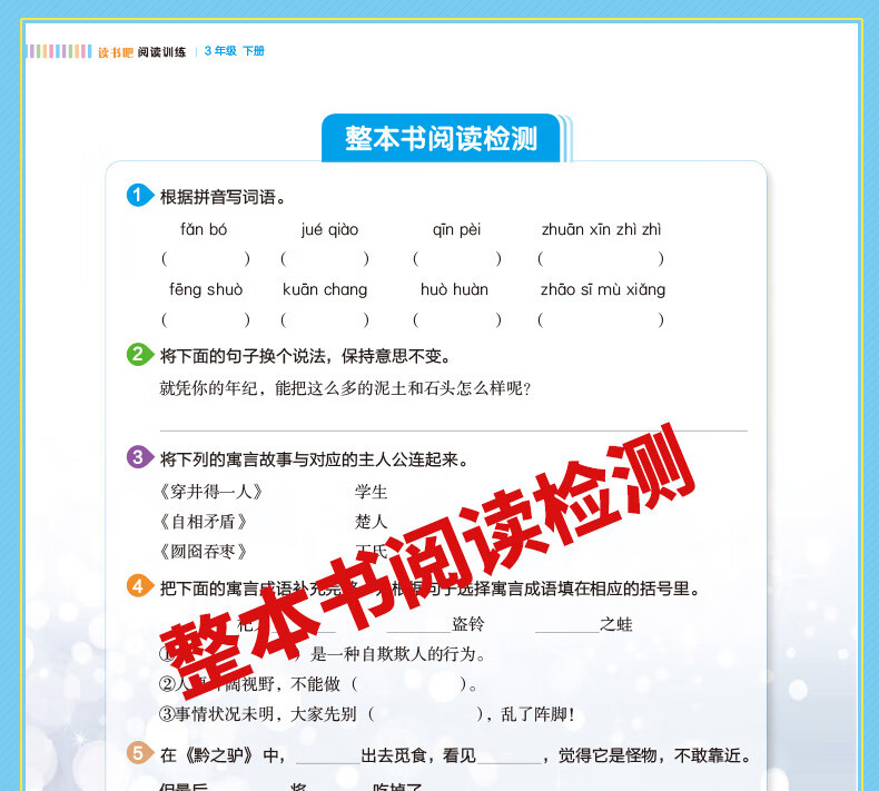整本检测用习题掌握全书的重点名著阅读的重点内容有哪些?常考的知识点有哪些? ....这些关键性的指导内容,都在为孩子量身定制的“整本书阅读检测”中:基础题全面考查孩子的检索、理解能力;分析简答题考查孩子的运用、评鉴能力。用多样化的习题,为孩子打好阅读理解的基础,全面提升阅读能力:用丰富的习题训练,帮助孩子掌握书中的重点,有的放矢,进一步提高孩子的阅读效率。从做题中学,让孩子的阅读效率和理解能力得到质的飞跃。