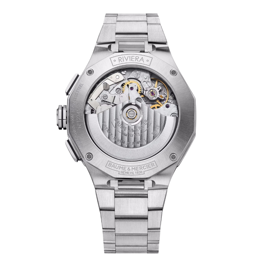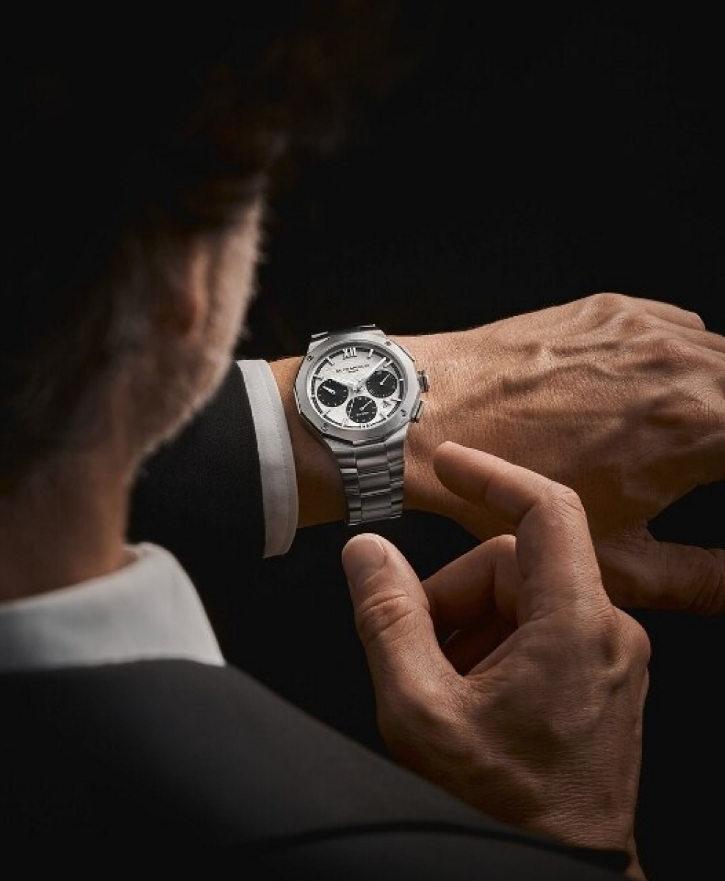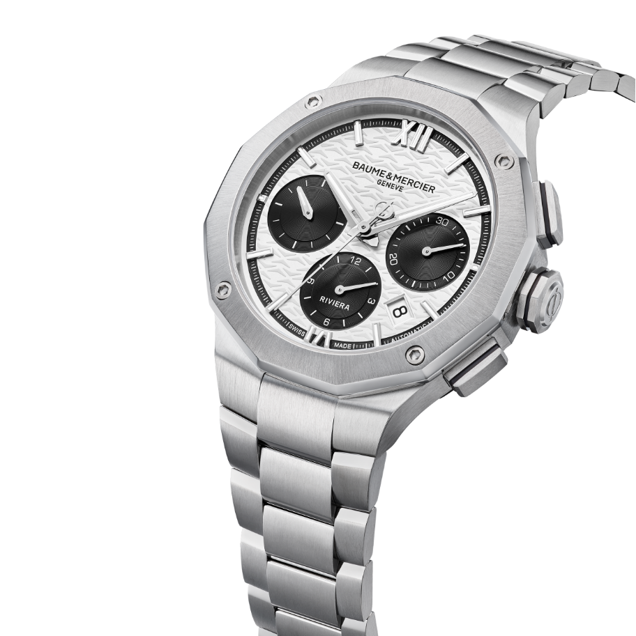 利维拉系列 10827 计时码表的设计灵感源自 20 世纪 50 年代,黑白对比鲜明,既大胆又和谐。白色波浪纹表盘与外圈和地中海黑色计时器相呼应。涂有白色 Superluminova 夜光涂层的镀铑罗马数字、时标和指针更突出了这一双色设计。腕表搭载 Valjoux 7753 自动上链机芯,动力储备 48 小时,防水深度达 10 ATM。可更换式精钢表链采用非常可靠和坚固的快拆装置,无需工具即可更换表链。