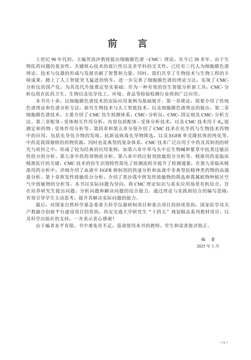 细胞膜色谱(CMC)技术是一项原创性的仿生色谱技术,为解决药物发现、临床精准用药和药品质量控制问题提供有效分析检测工具。在国家自然科学基金重大科研仪器设备研制专项和国家医学攻关产教融合创新平台项目的资助下,CMC技术已经实现了仪器化,并广泛应用于生物医药、临床检验、环境监测等领域。本教材简要叙述了CMC技术的原理、方法和分析仪,以案例方式重点介绍CMC技术及CMC分析仪的应用,包括配体-受体相互作用、药物先导化合物筛选、抗体药物分析、中药复杂体系分析、临床精准用药分析,以及挥发性致敏组分分析等。