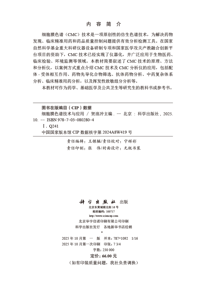 细胞膜色谱技术与应用 贺浪冲 主编 适合药学相关专业研究生使用 研究生教材 医学 药学 药物分析学 9787030802804 科学出版社