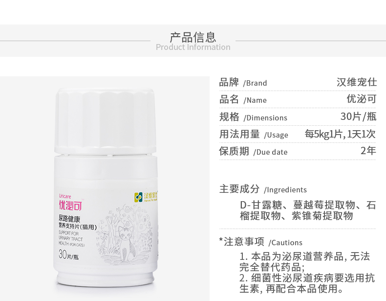 猫研所 汉维优泌可 30片/瓶 宠物营养补充剂